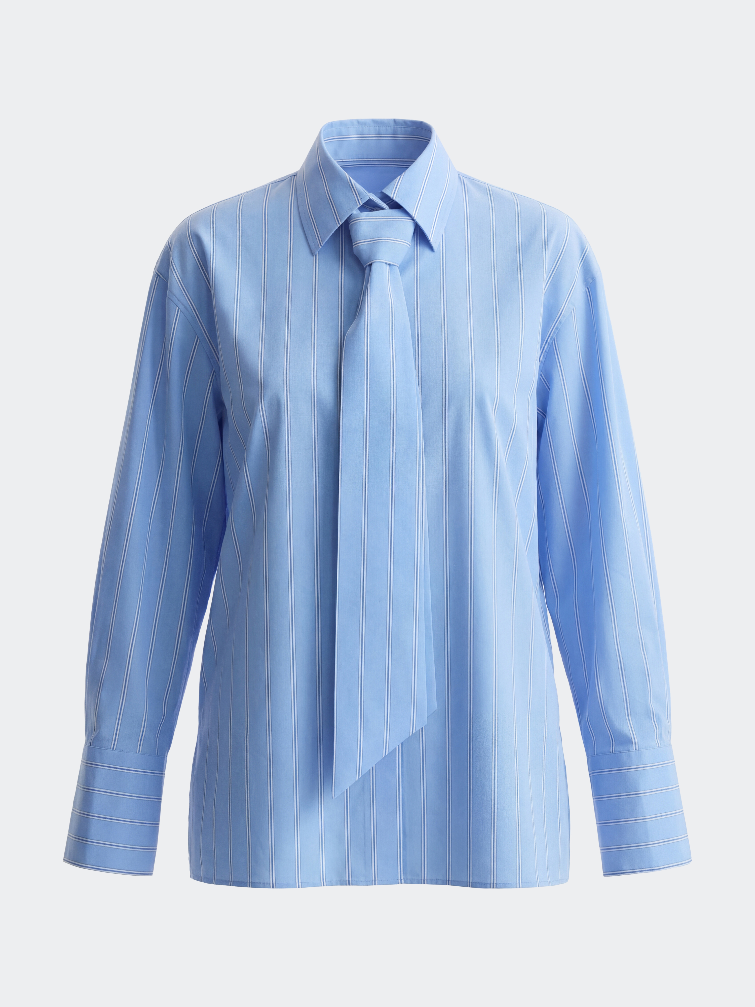 Рубашка в полоску с галстуком добавит деловым образам выразительности. Тонкий гладкий текстиль на основе хлопка хорошо пропускает воздух, обеспечивая комфорт в жаркий день, и при этом не просвечивает. Модель расслабленно сидит по фигуре и не сковывает движения.