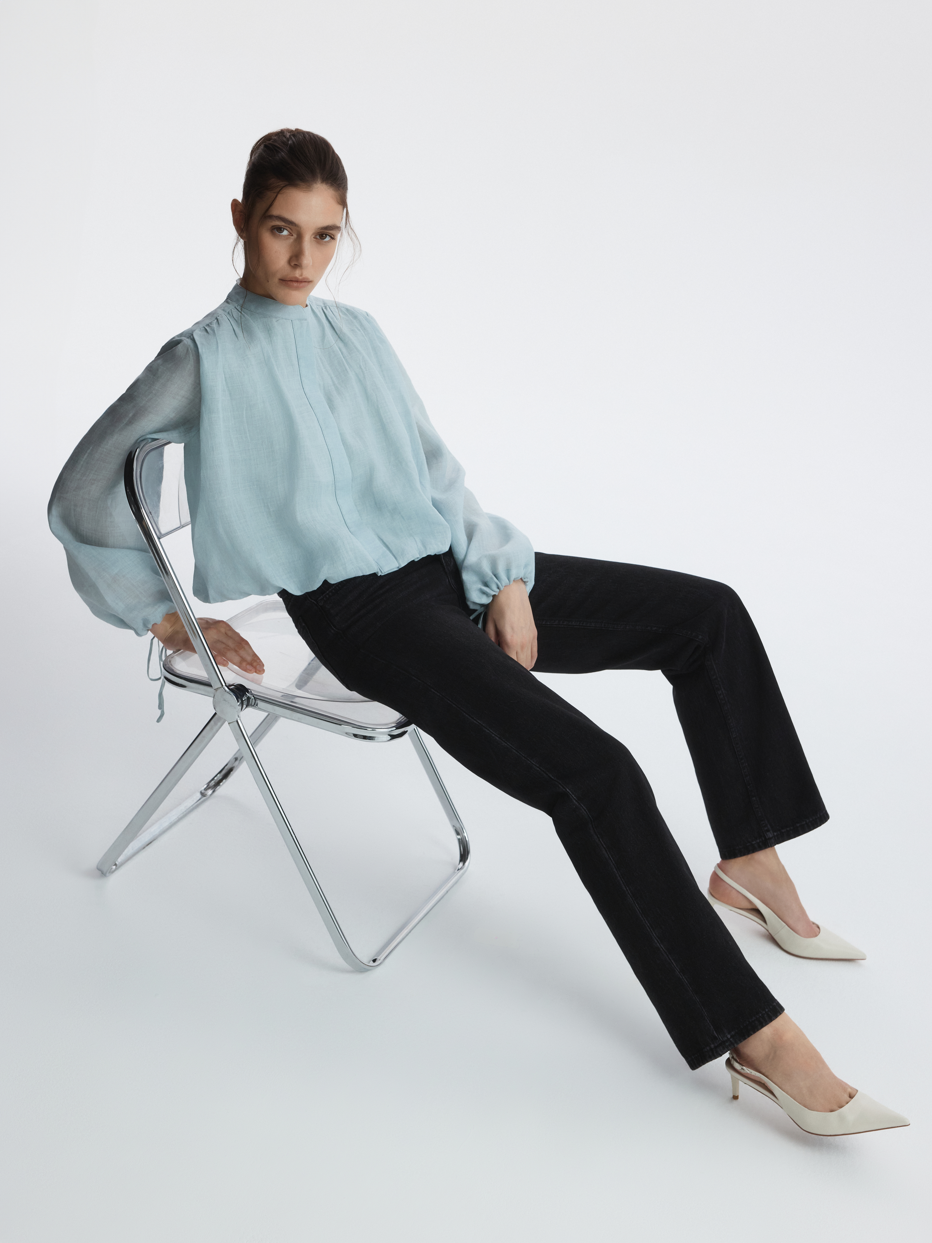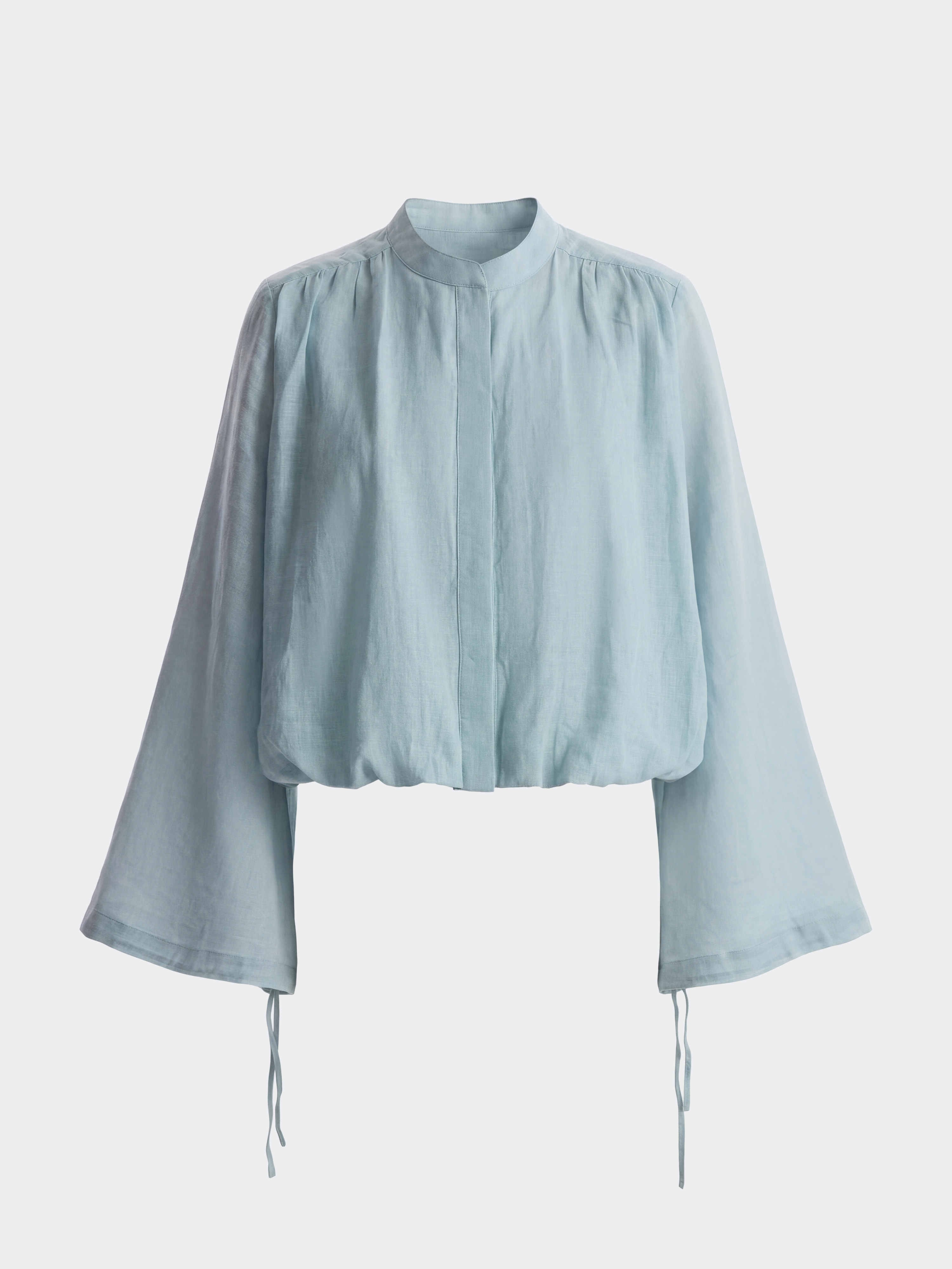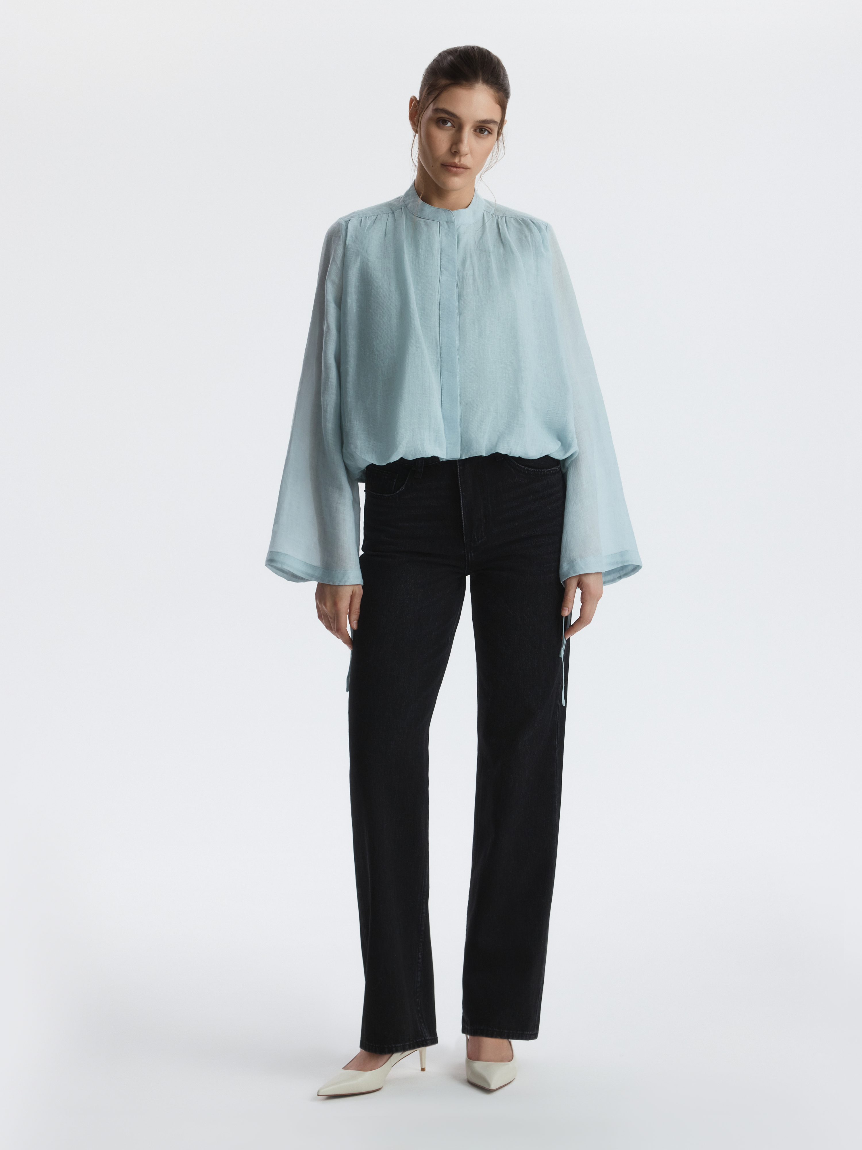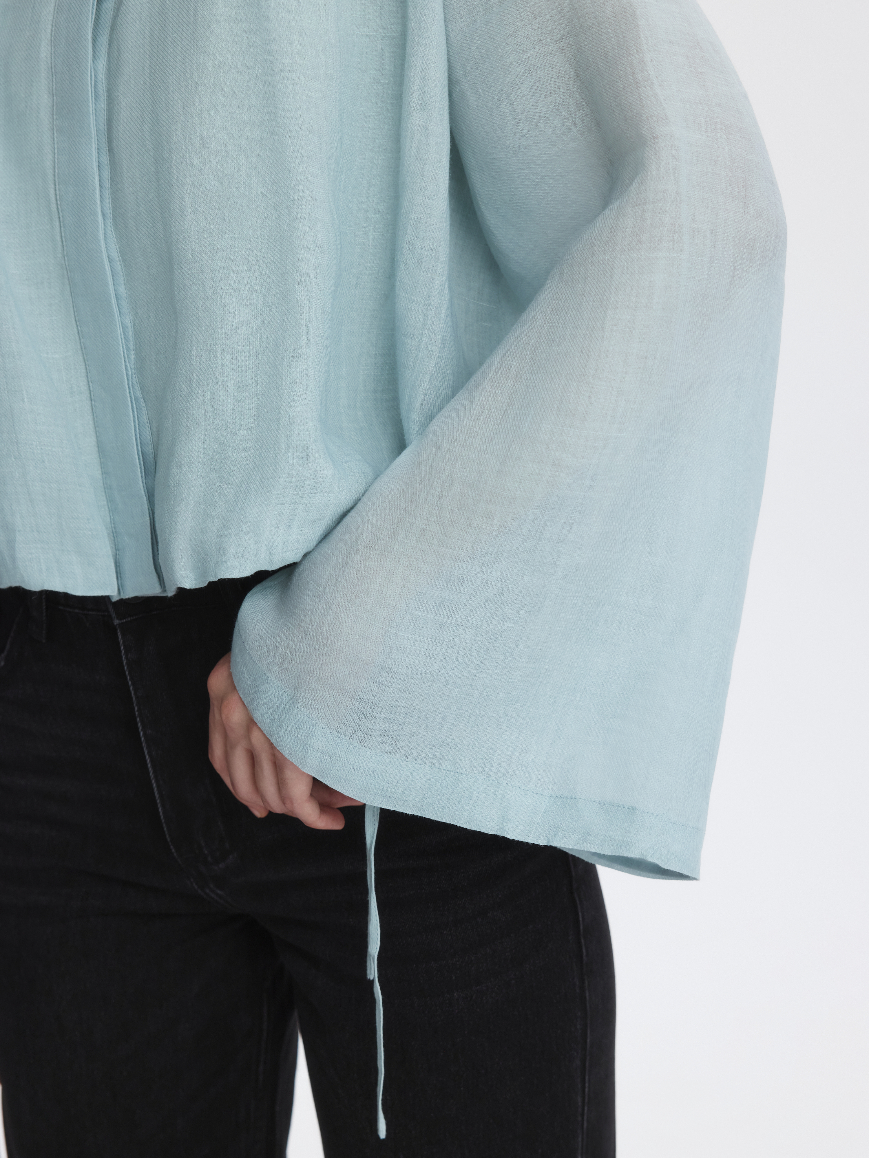 Укороченная блуза подчеркнет линию талии и при этом не будет сковывать движения. Натуральная ткань рами из волокон крапивы впитывает влагу, хорошо пропускает воздух и дарит комфорт в жаркий день. Благодаря кулиске расклешенные рукава трансформируются в более собранный силуэт.