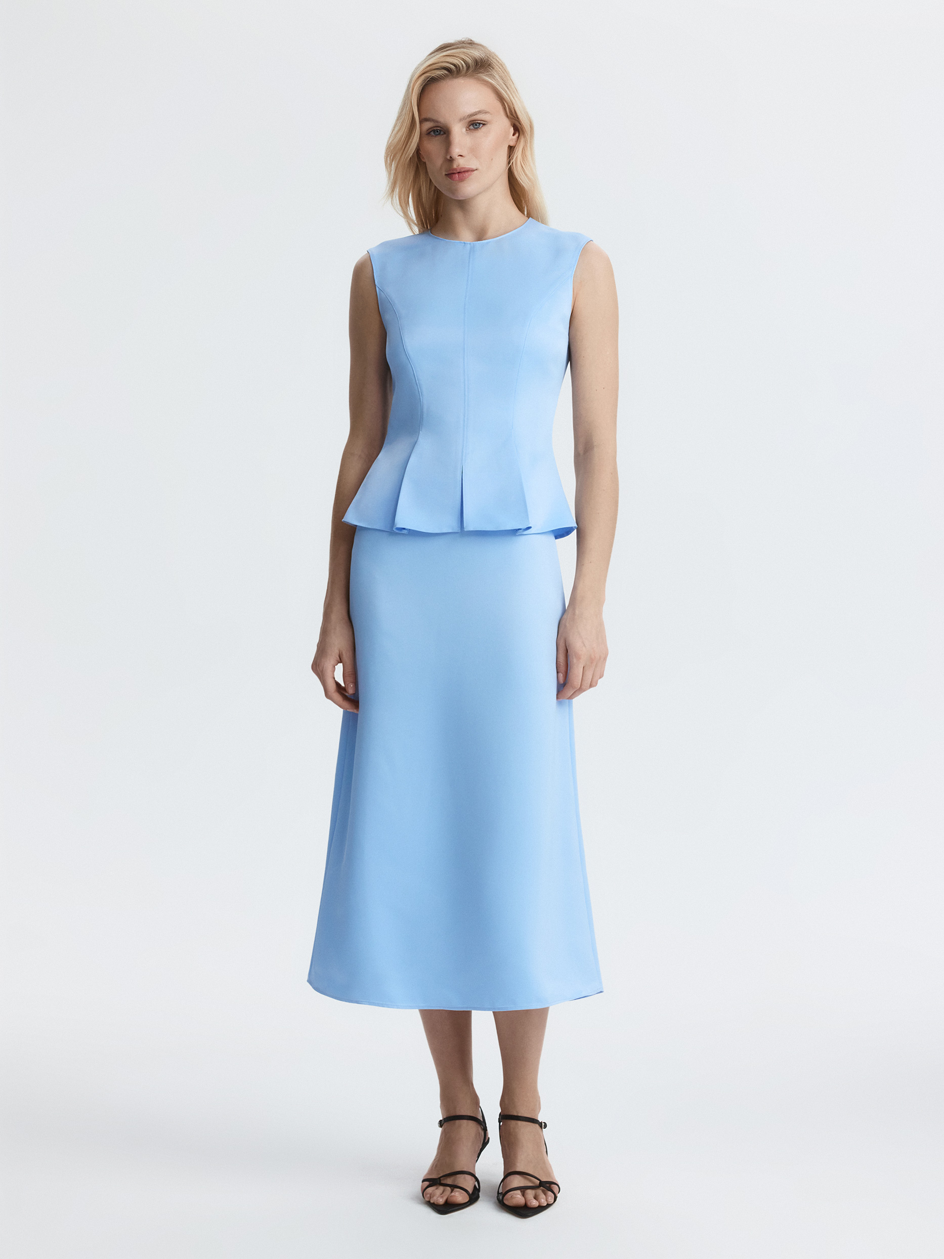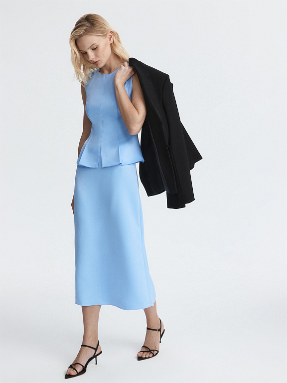 Приталенный топ с круглым вырезом можно интегрировать в любые по настроению образы. В меру плотный атласный текстиль хорошо держит форму, комфортно прилегает к телу и не просвечивает даже без подкладки. Акцентная баска делает строгий крой более женственным.