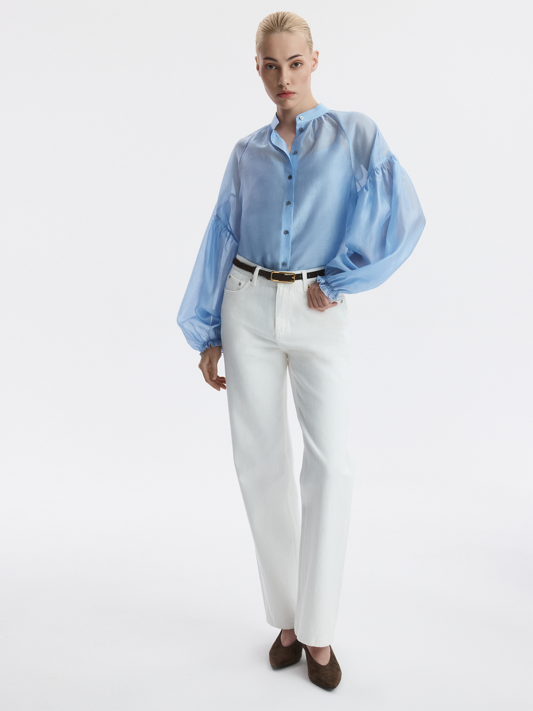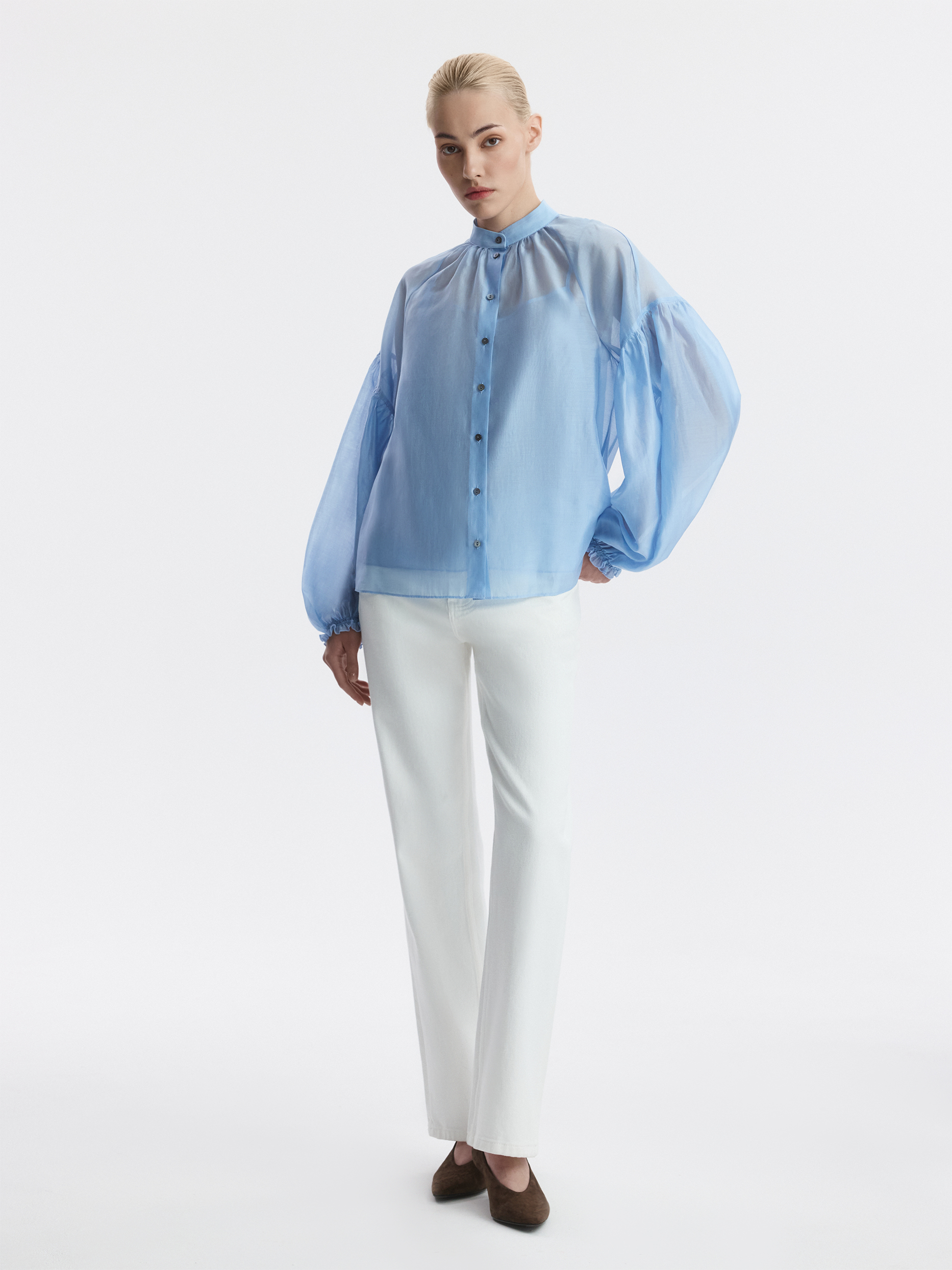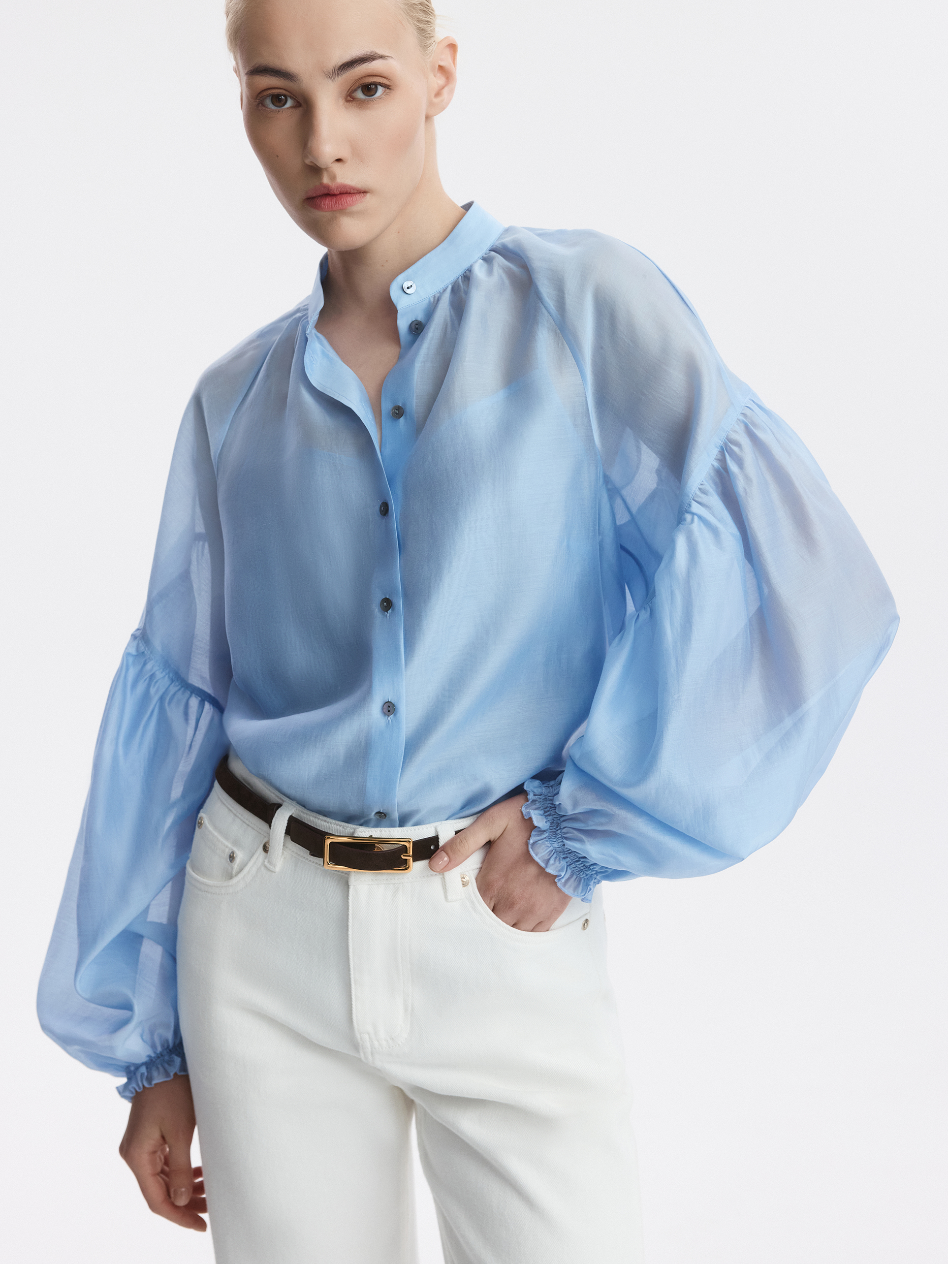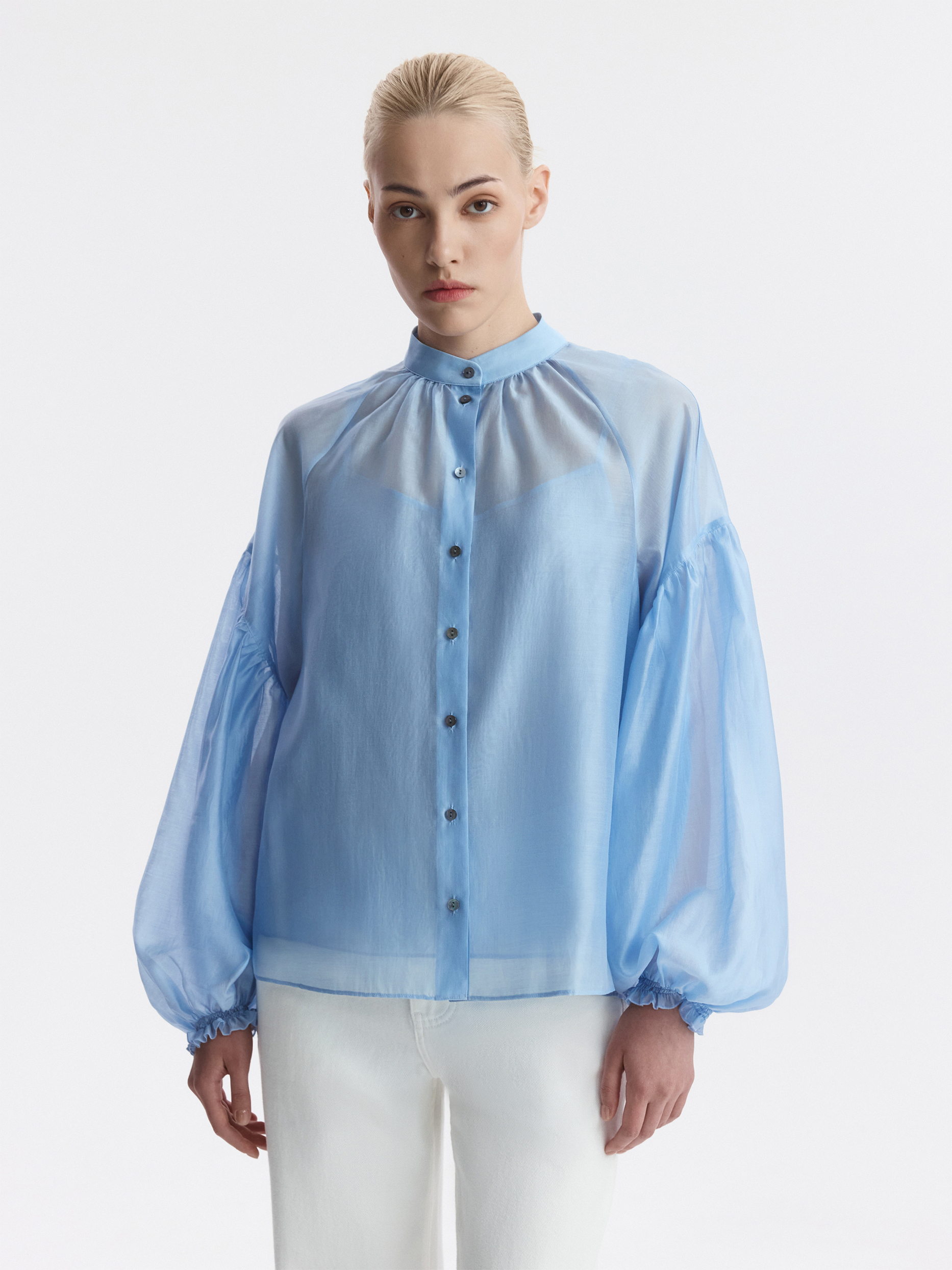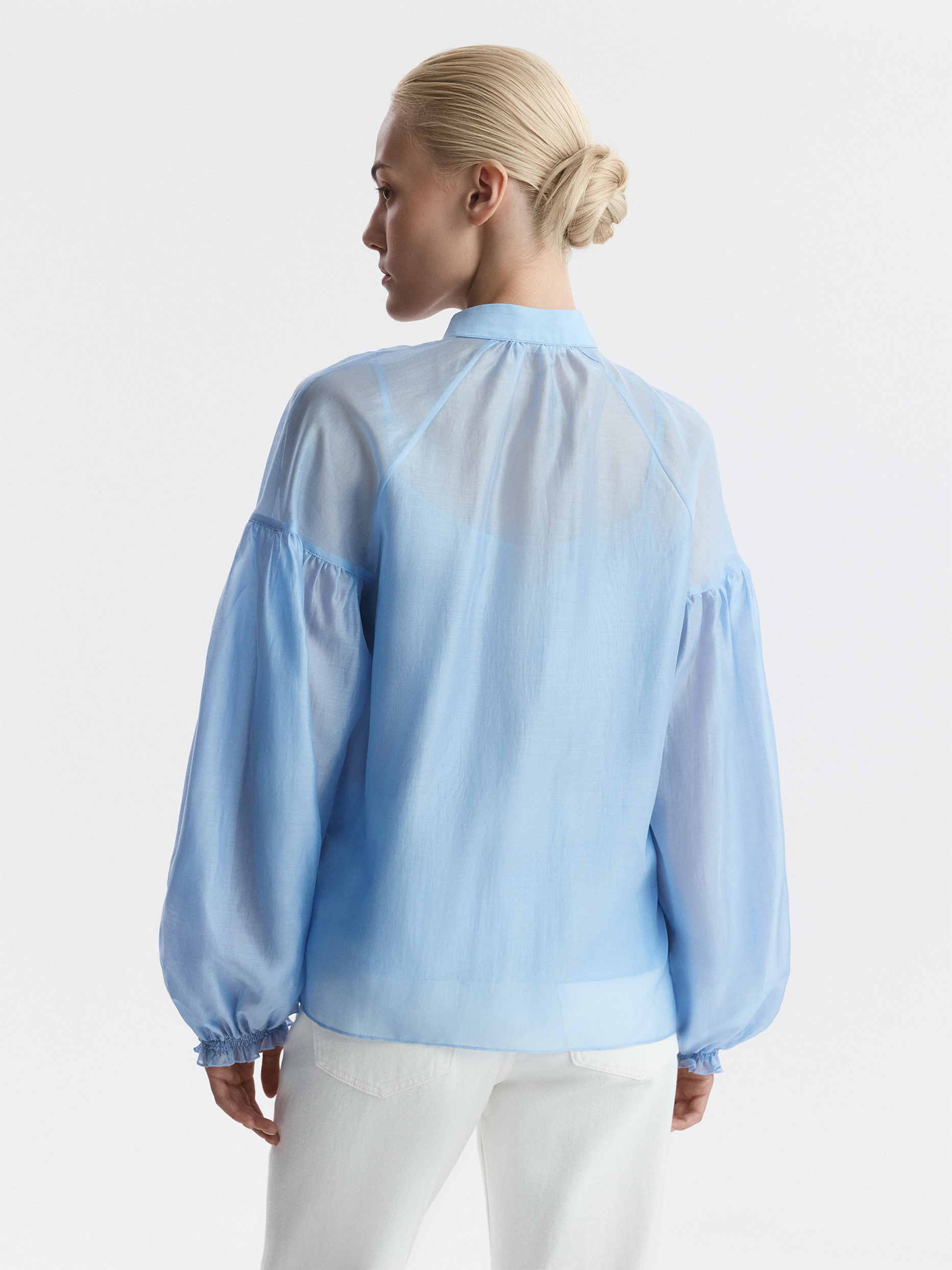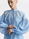 Блуза свободного кроя расслабленно сидит по фигуре и дарит ощущение прохлады. Тонкий полупрозрачный текстиль на основе тенселя (волокна целлюлозы) невесомо касается тела, а нижний топ предотвращает просвечивание.