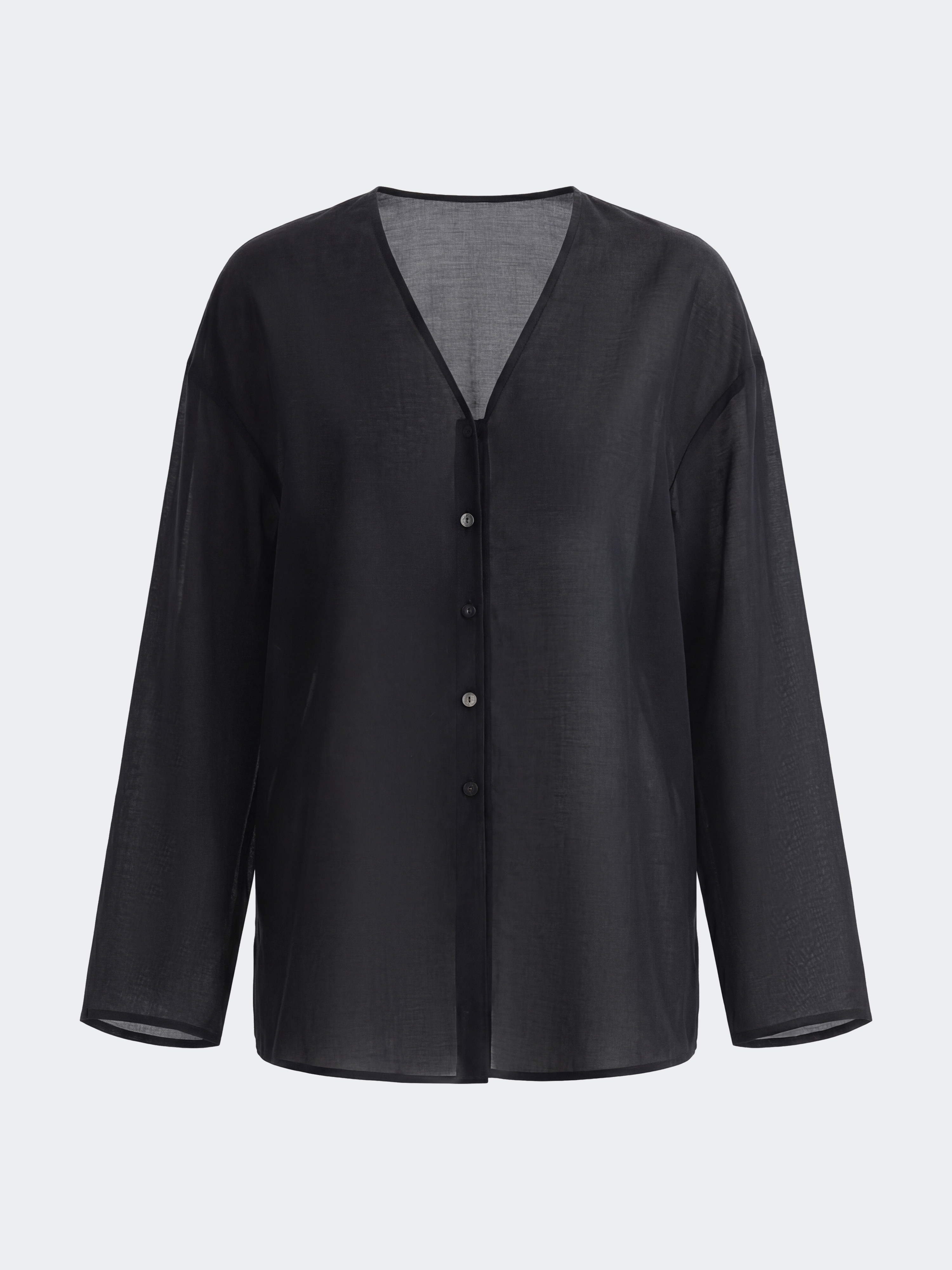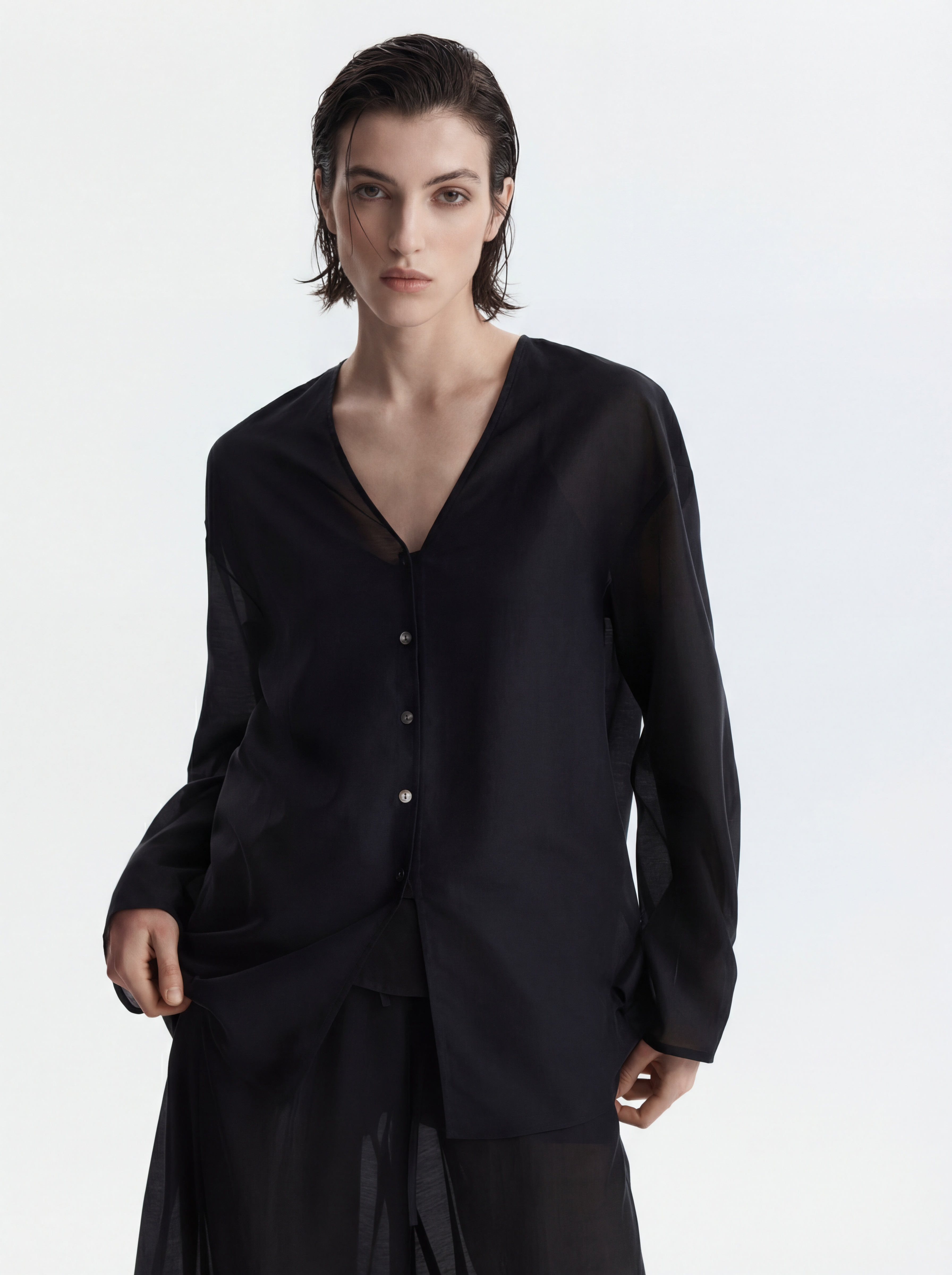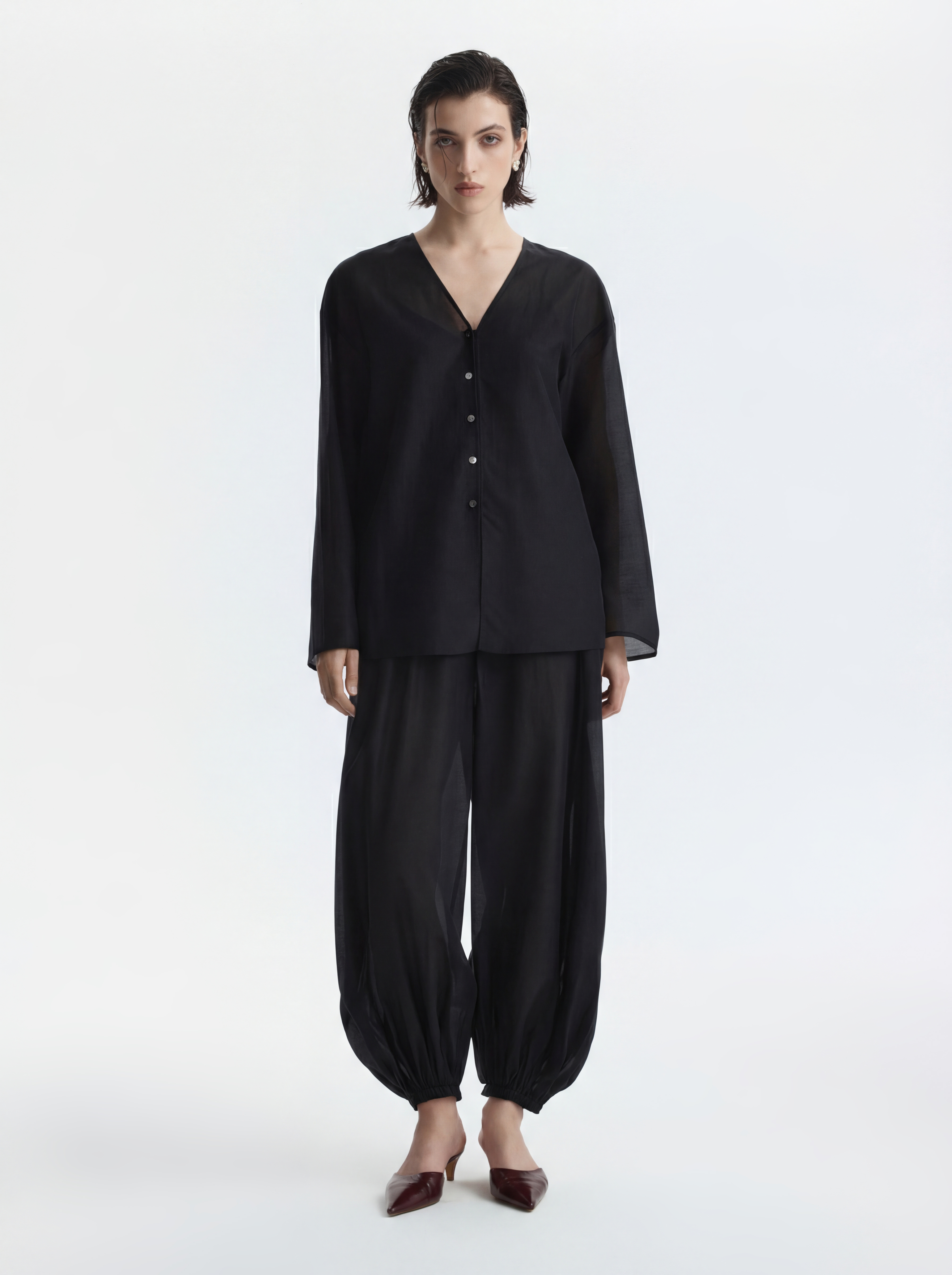 Блуза в пижамном стиле свободно сидит по фигуре и не сковывает движения. Тонкий полупрозрачный текстиль из лиоцелла (волокна целлюлозы) хорошо пропускает воздух и дарит ощущение прохлады, а нижний топ из хлопка предотвращает просвечивание. Дополнить костюм можно брюками из аналогичного материала.