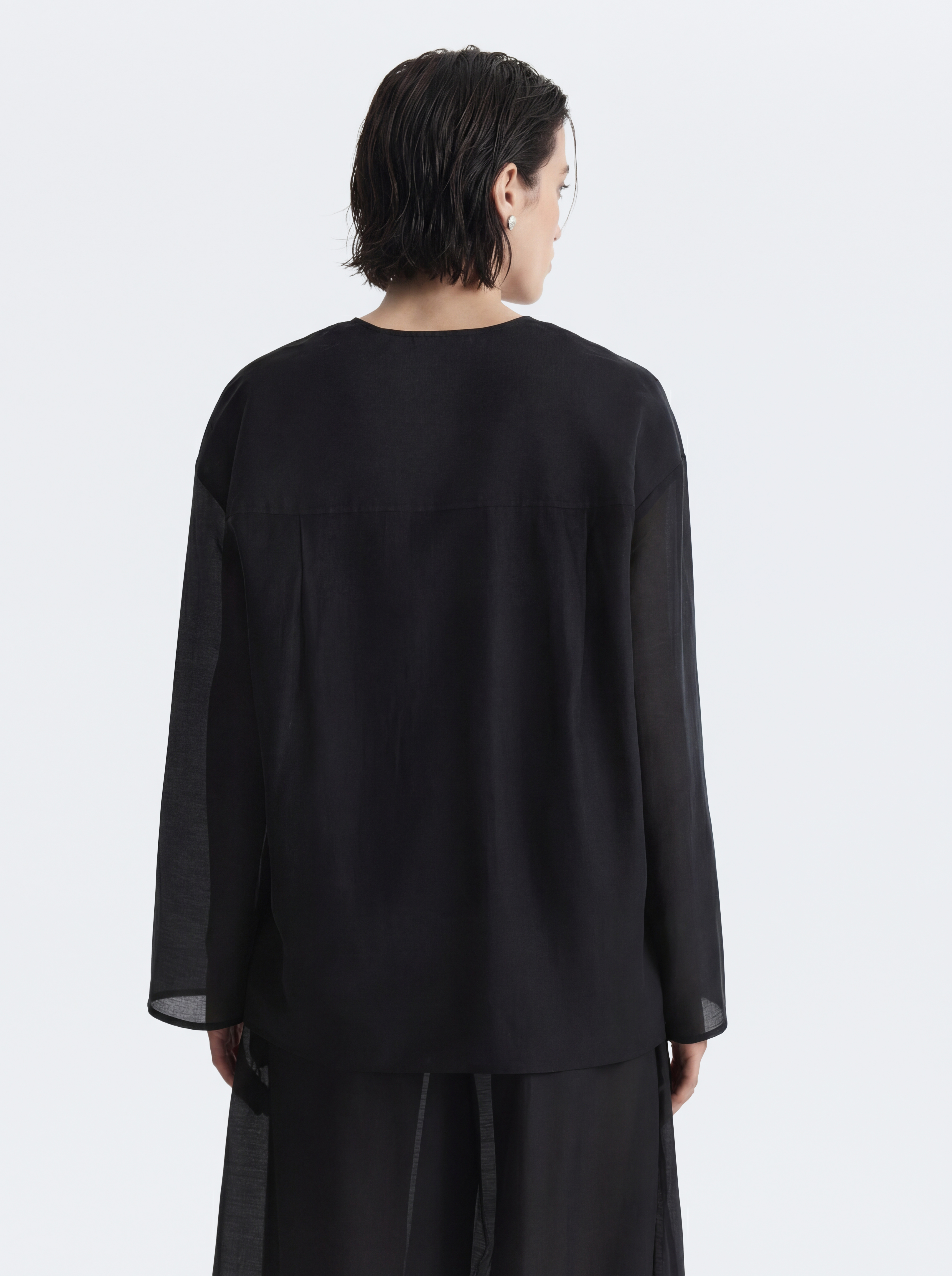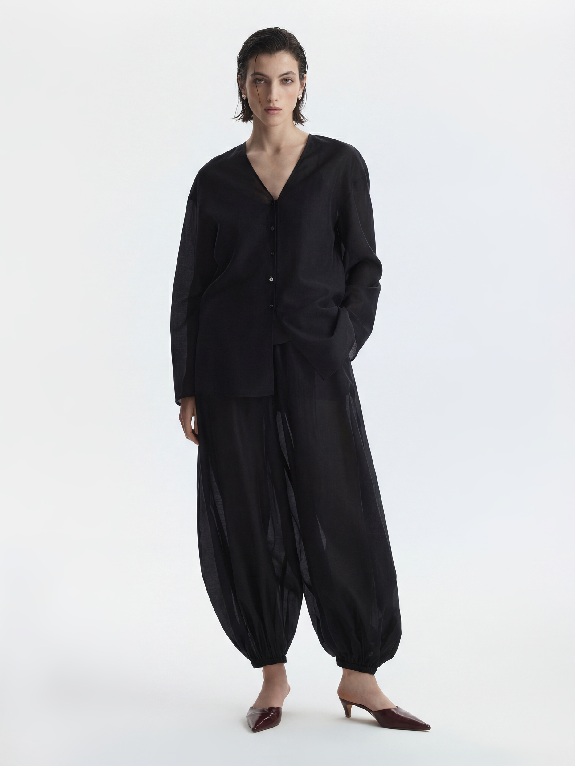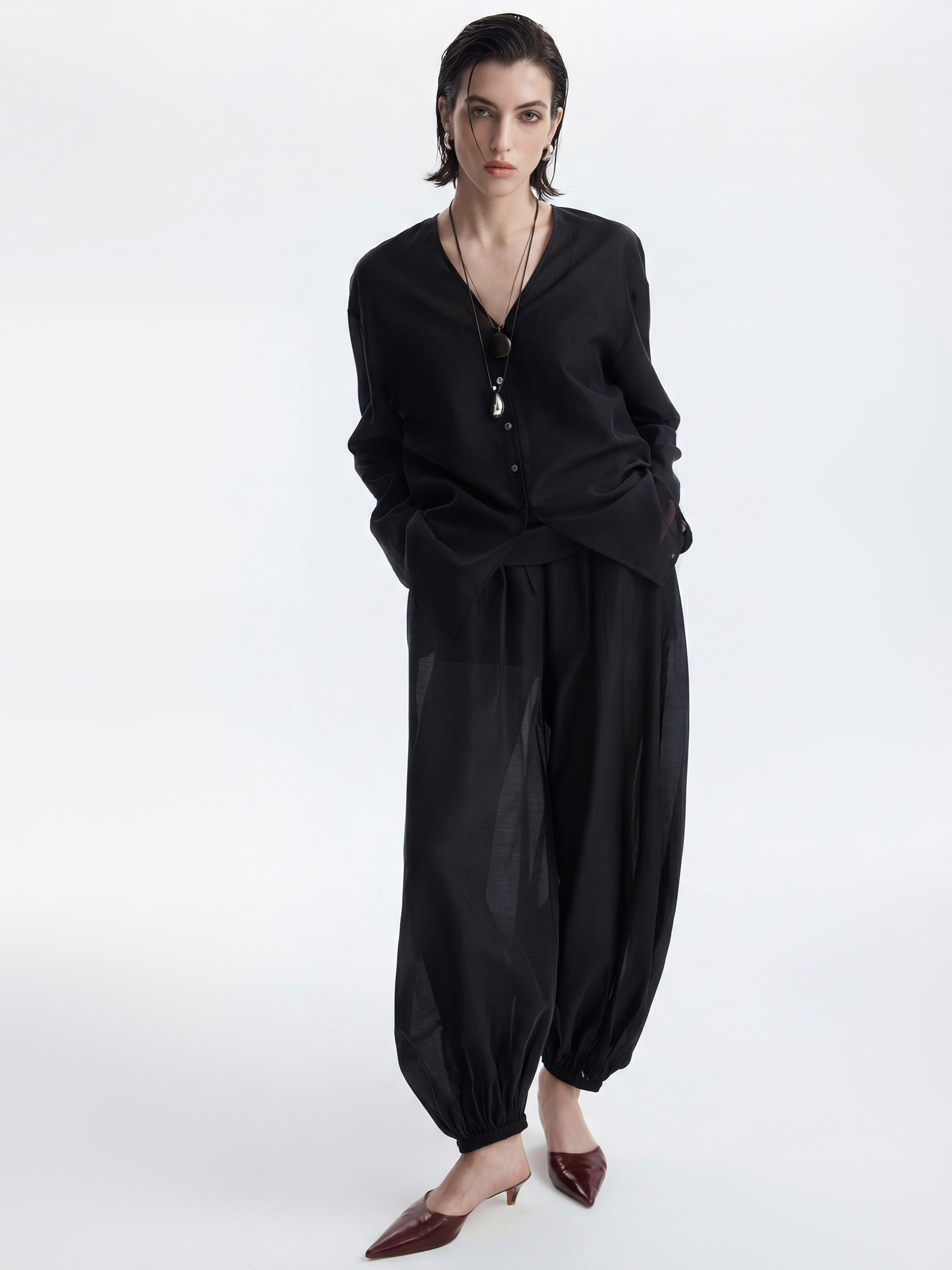 Блуза в пижамном стиле свободно сидит по фигуре и не сковывает движения. Тонкий полупрозрачный текстиль из лиоцелла (волокна целлюлозы) хорошо пропускает воздух и дарит ощущение прохлады, а нижний топ из хлопка предотвращает просвечивание. Дополнить костюм можно брюками из аналогичного материала.