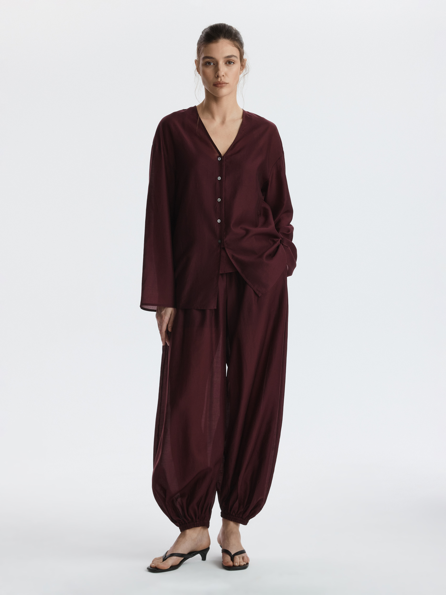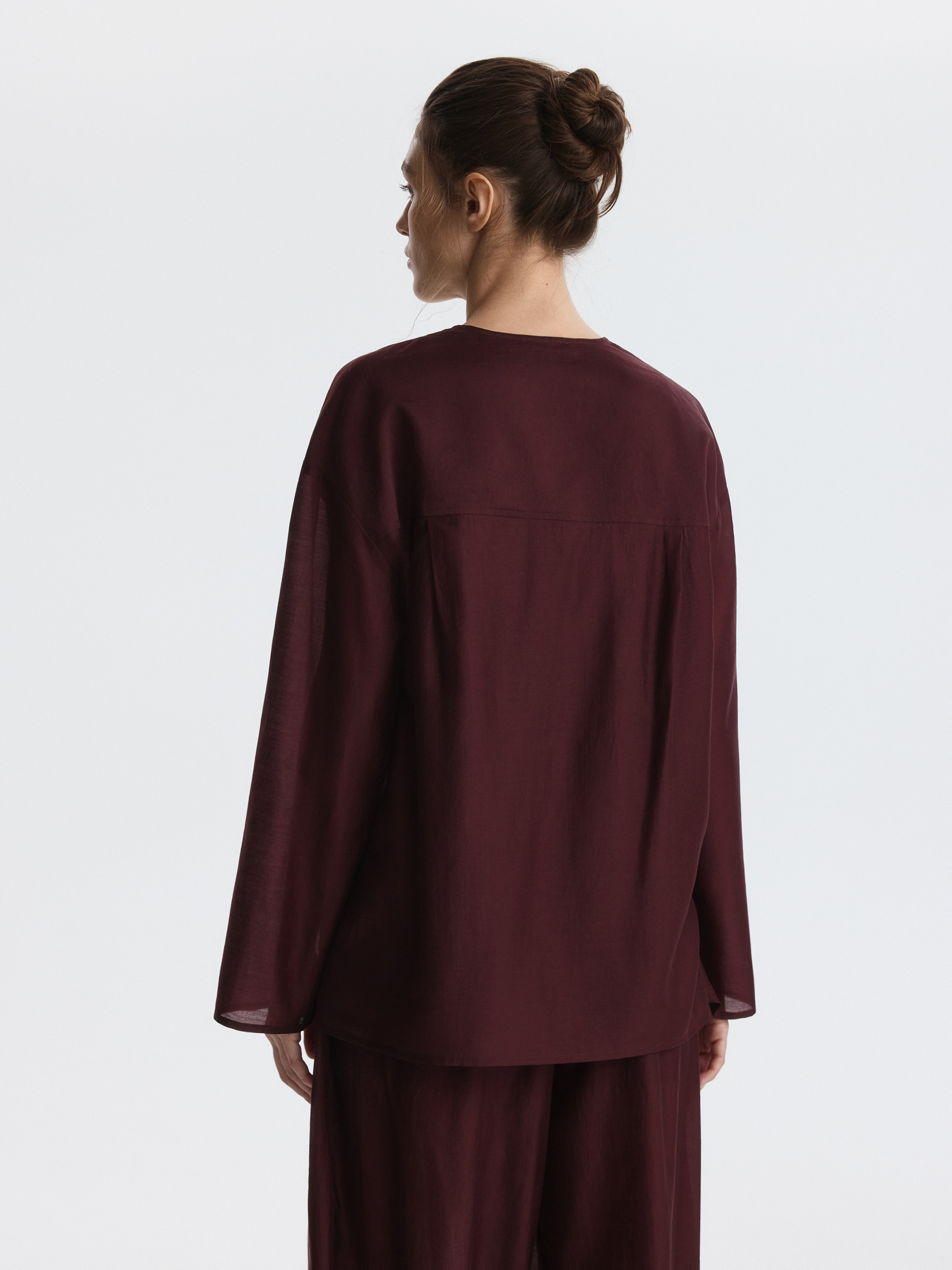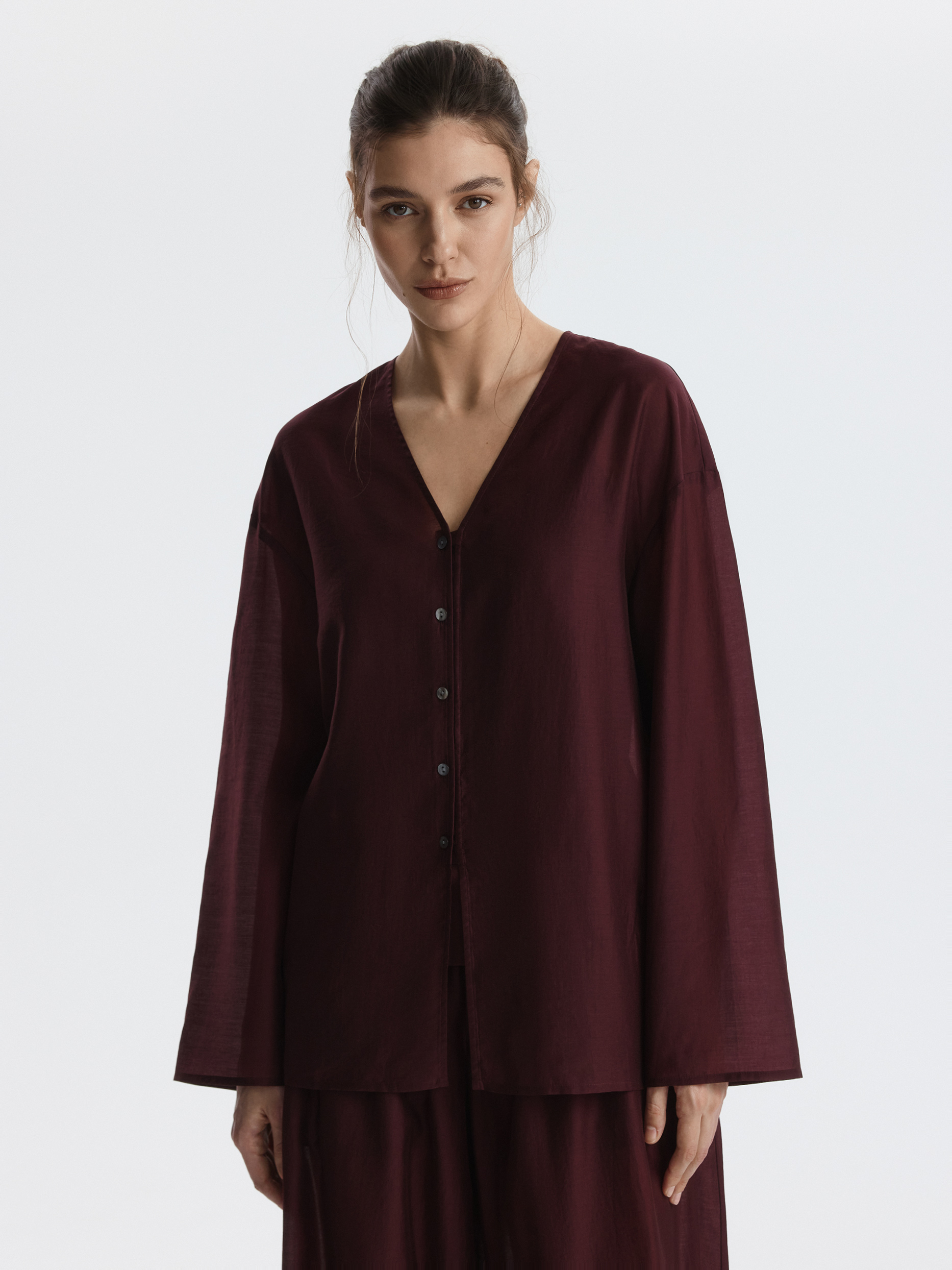Блуза в пижамном стиле свободно сидит по фигуре и не сковывает движения. Тонкий полупрозрачный текстиль из лиоцелла (волокна целлюлозы) хорошо пропускает воздух и дарит ощущение прохлады, а нижний топ из хлопка предотвращает просвечивание. Дополнить костюм можно брюками из аналогичного материала.