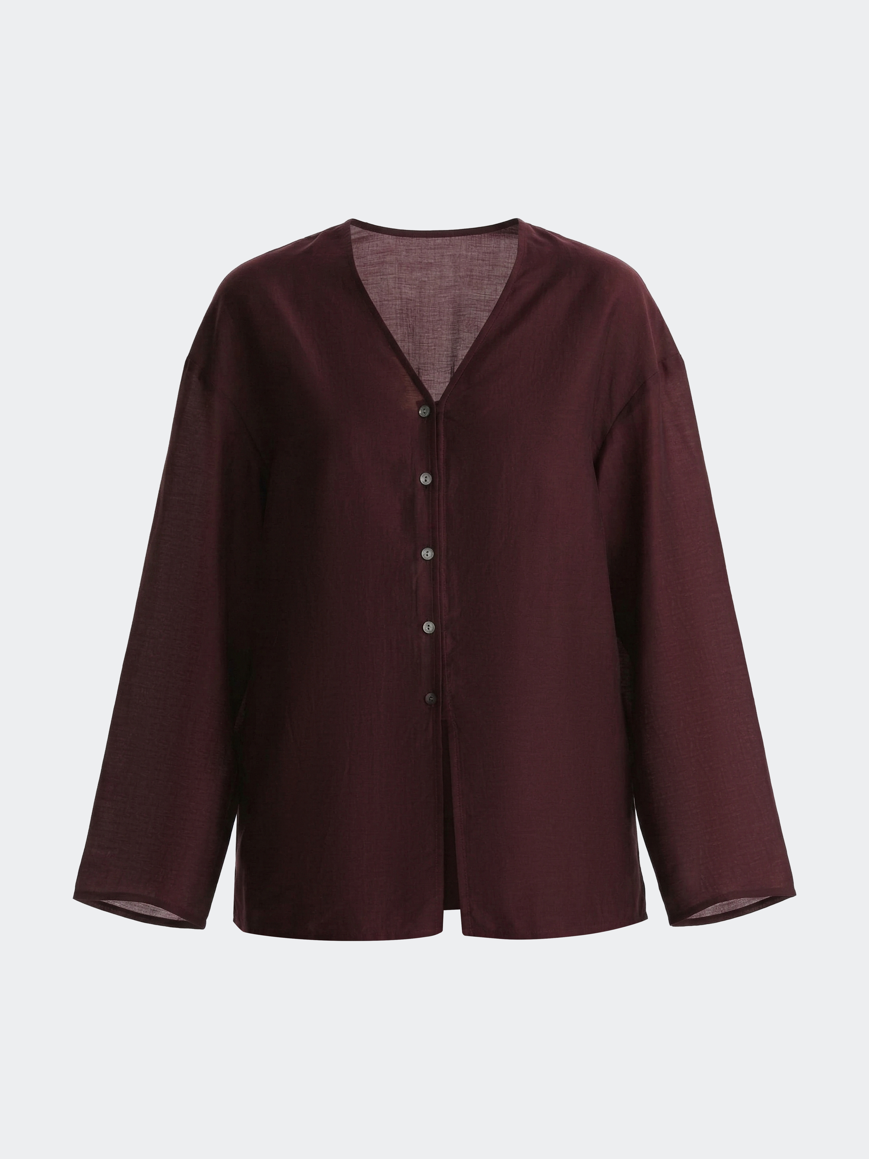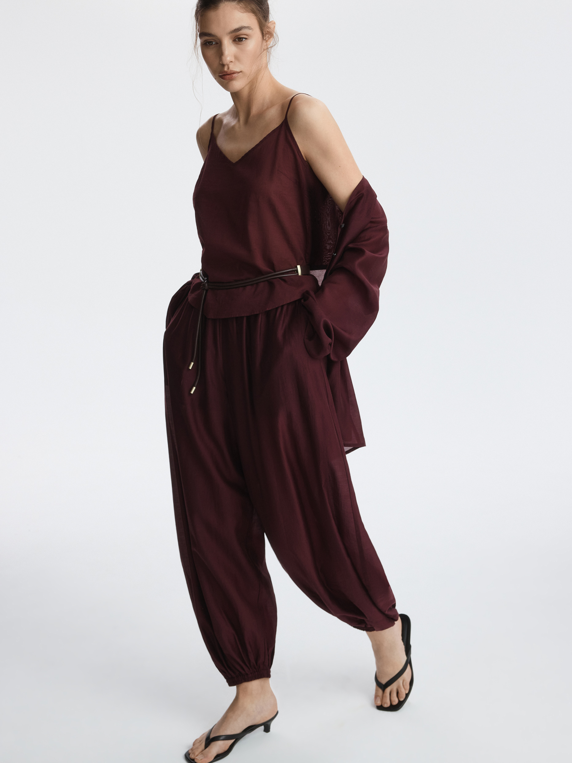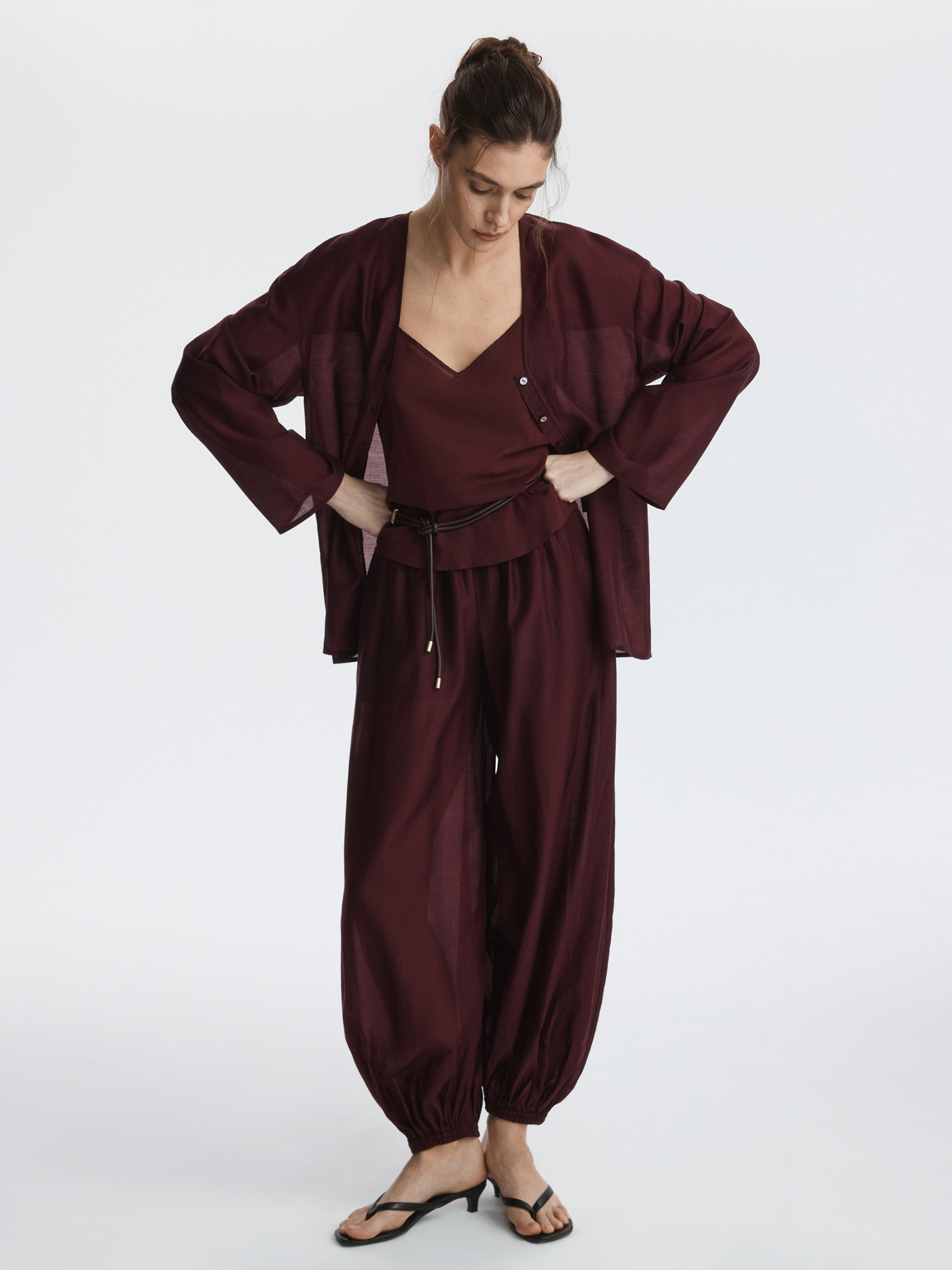 Блуза в пижамном стиле свободно сидит по фигуре и не сковывает движения. Тонкий полупрозрачный текстиль из лиоцелла (волокна целлюлозы) хорошо пропускает воздух и дарит ощущение прохлады, а нижний топ из хлопка предотвращает просвечивание. Дополнить костюм можно брюками из аналогичного материала.