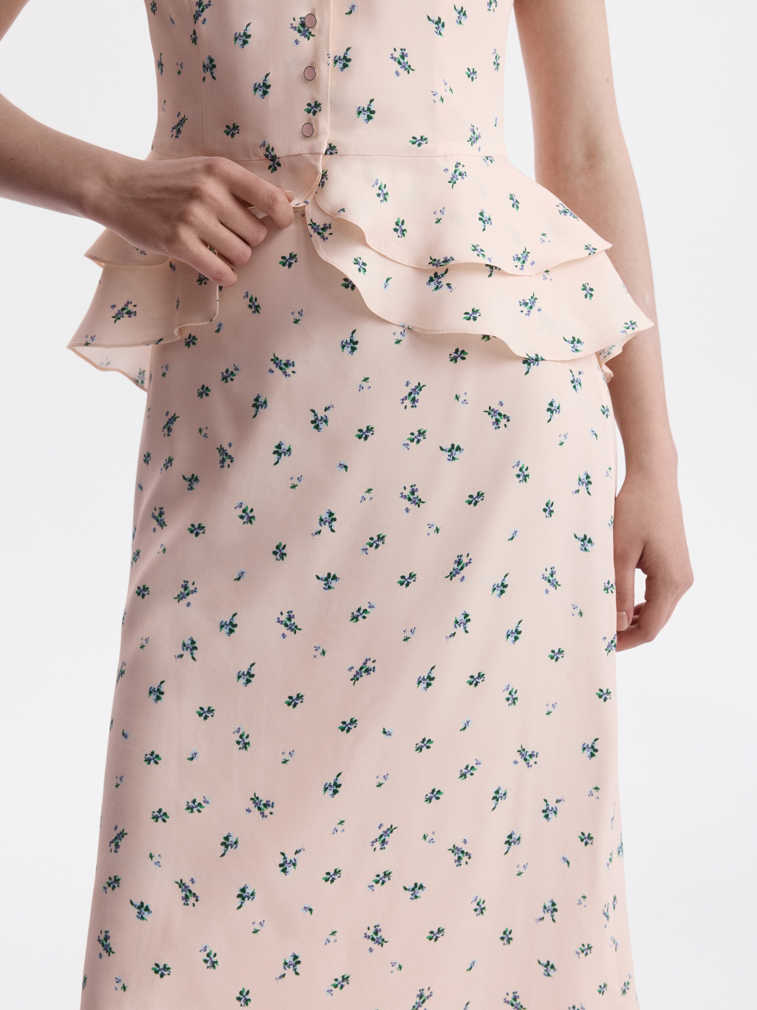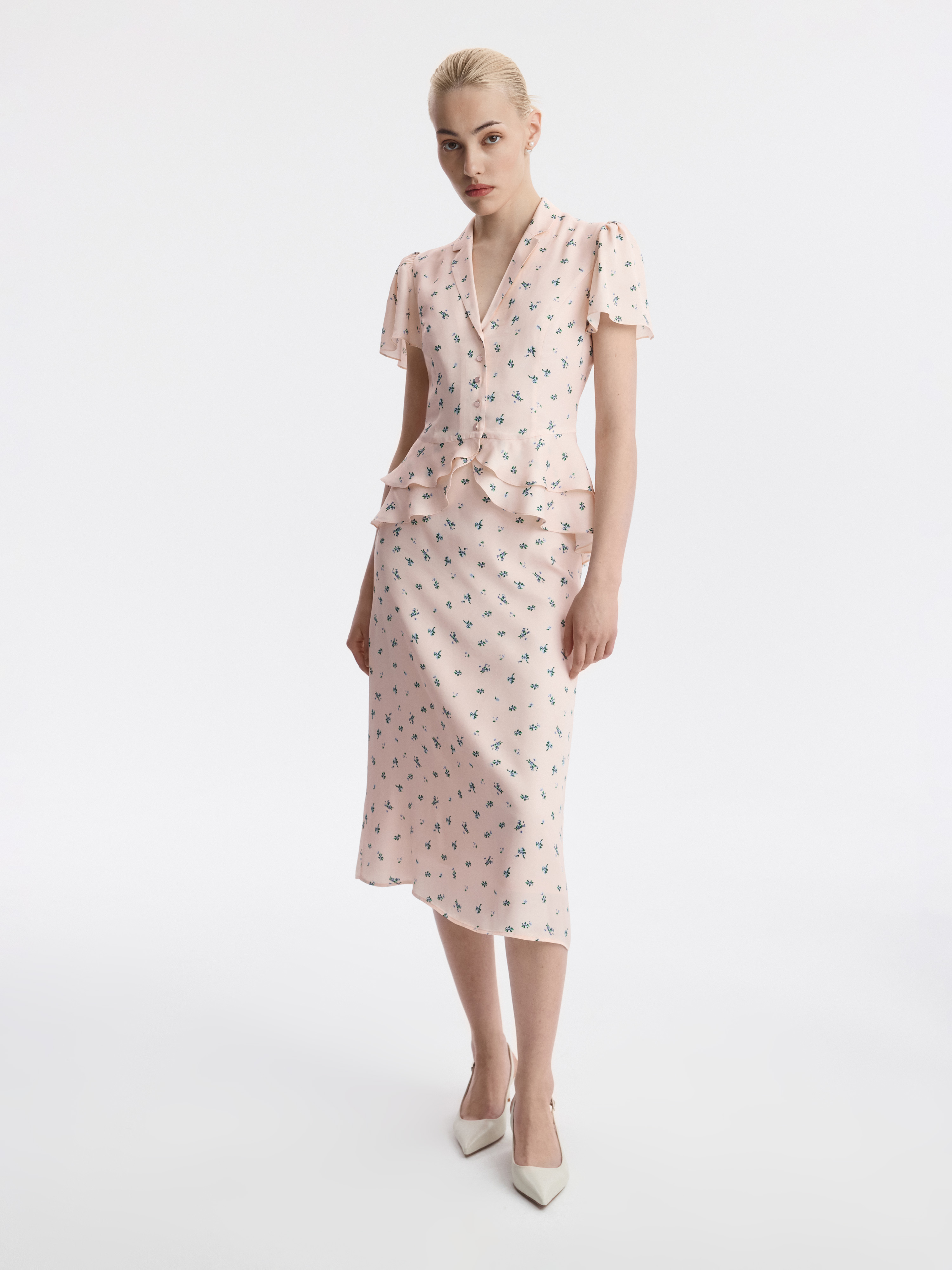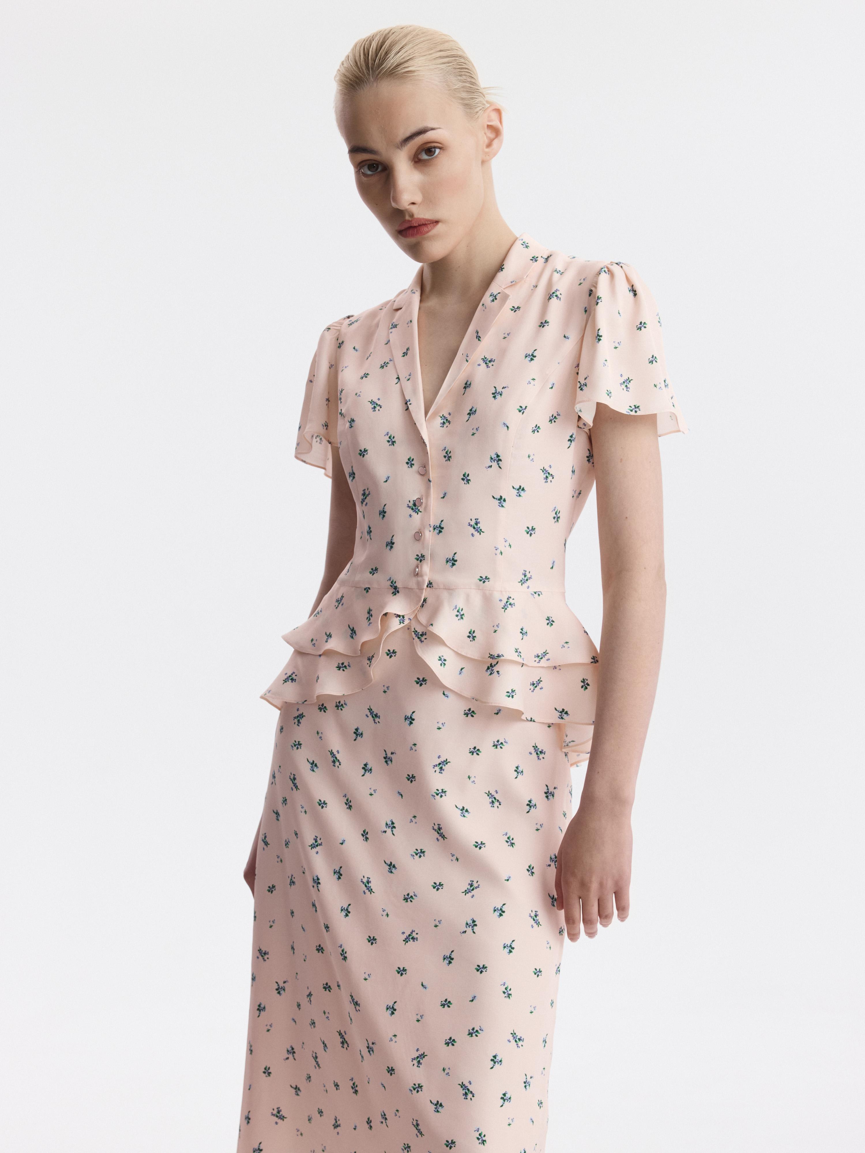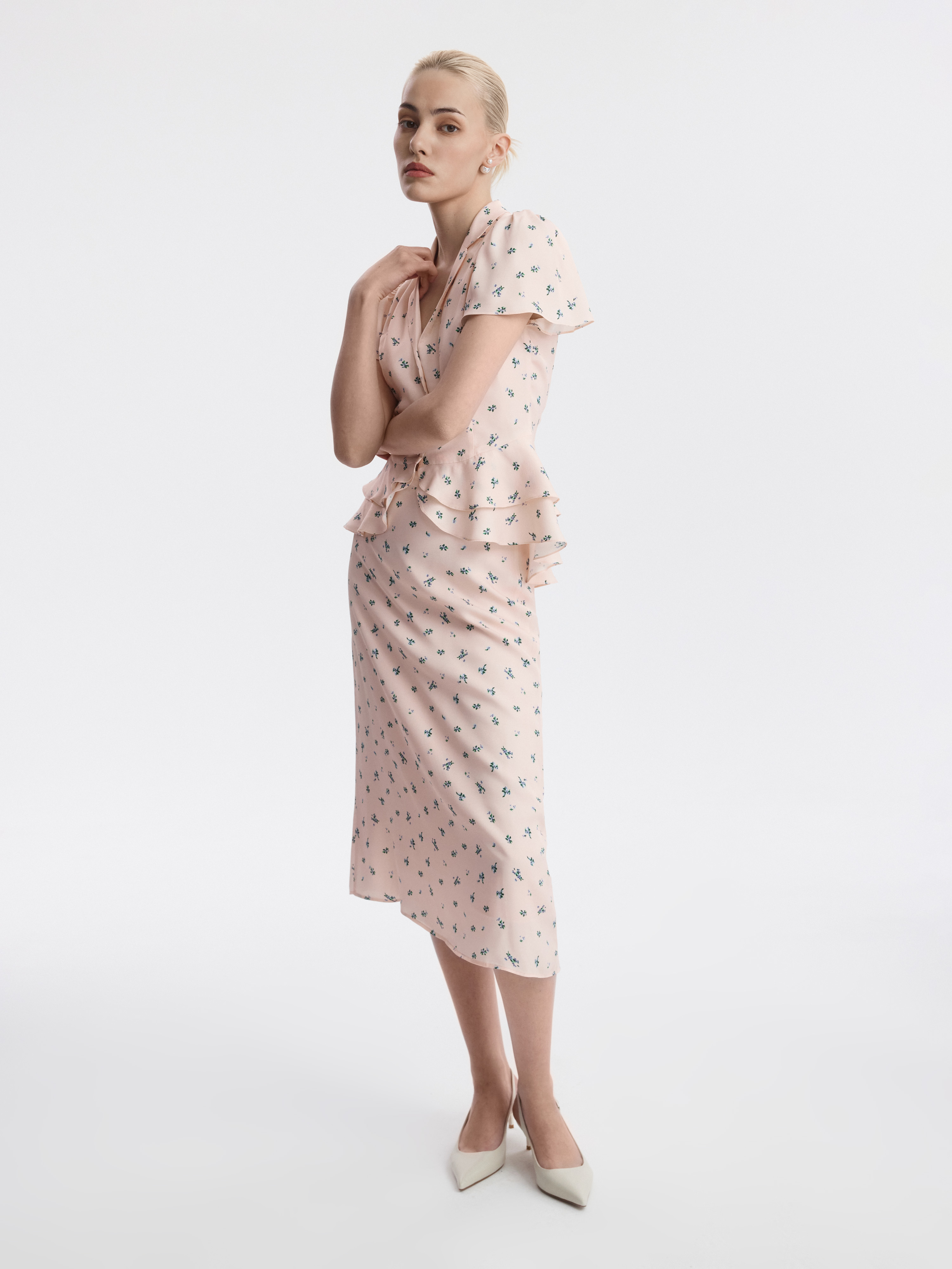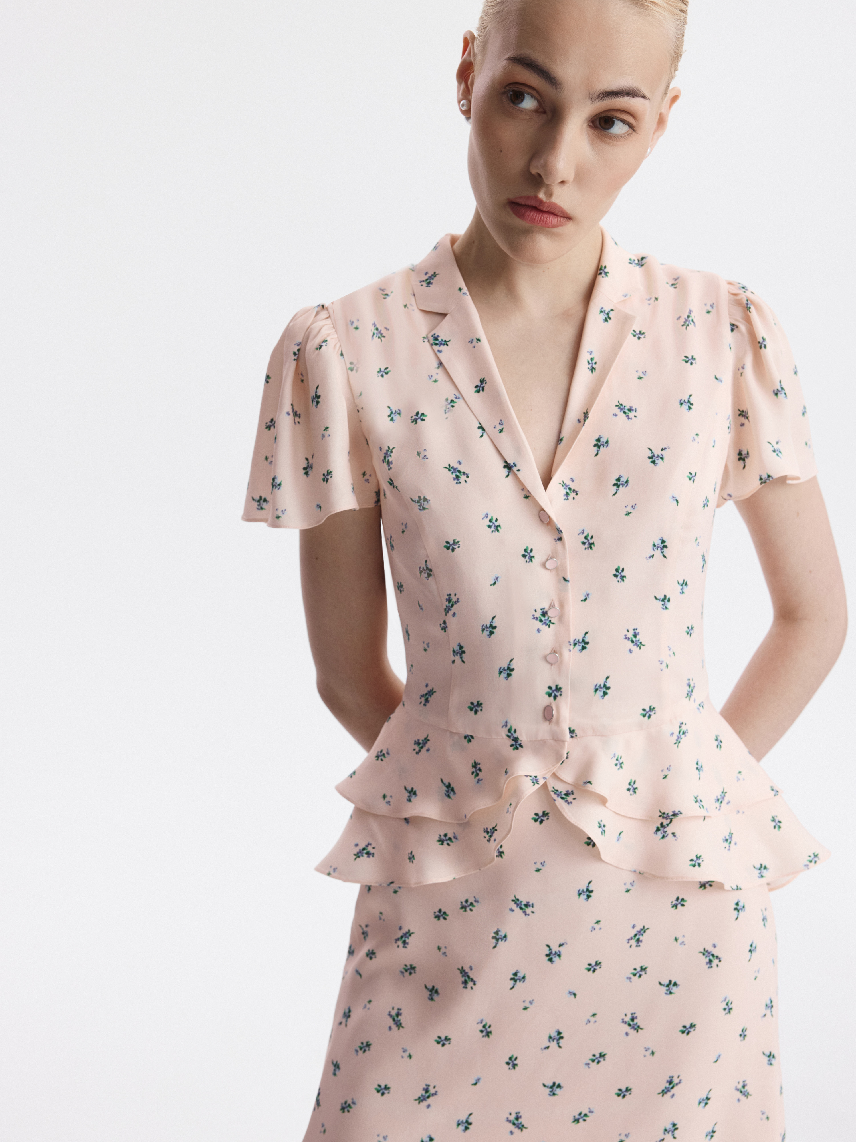 Атласная блуза с цветочным принтом – воплощение нежности и романтики. Модель сшили из гладкой струящейся вискозы с комфортной подкладкой, которая не просвечивает. Мягкие воланы добавляют изделию грации.