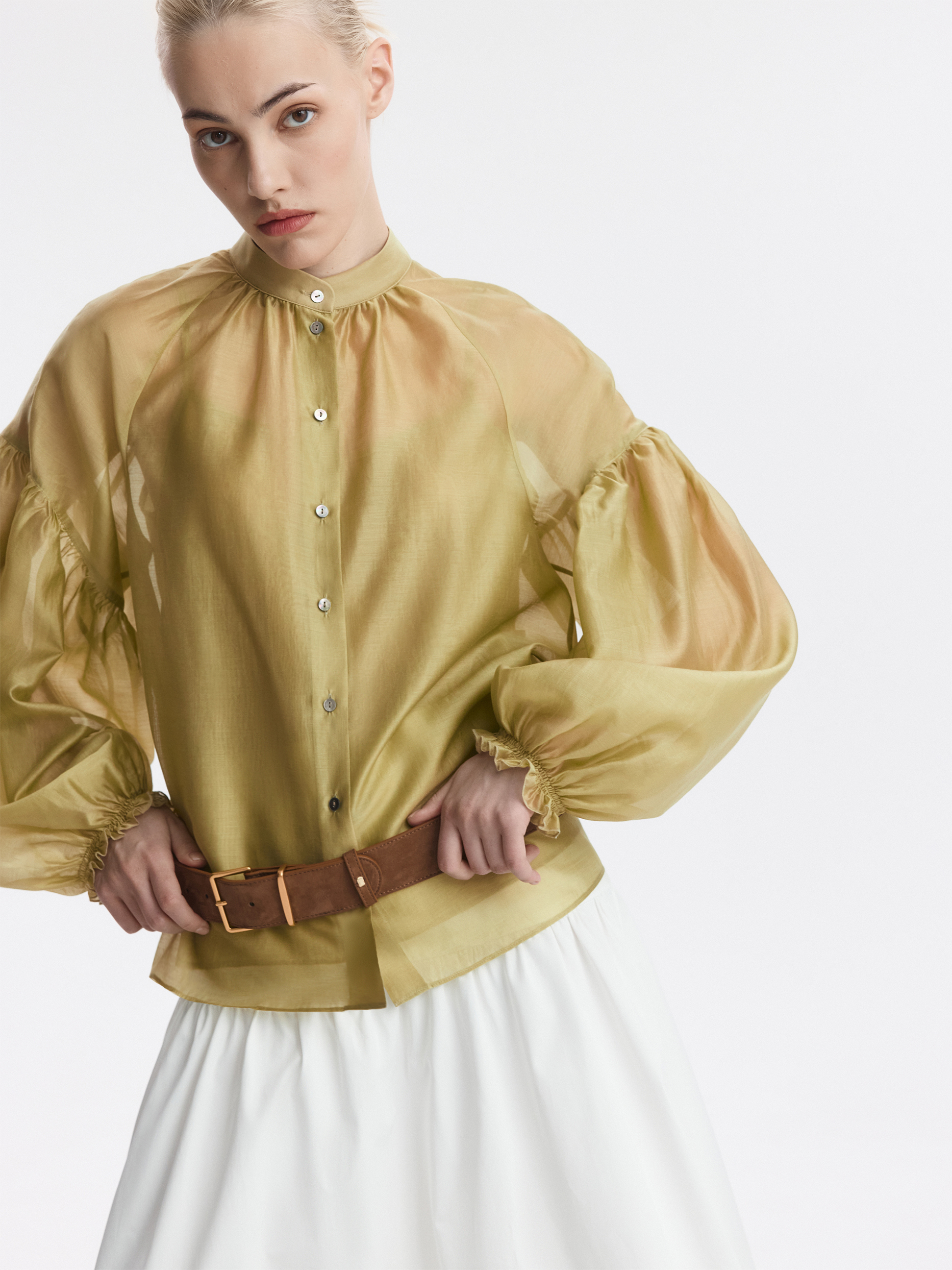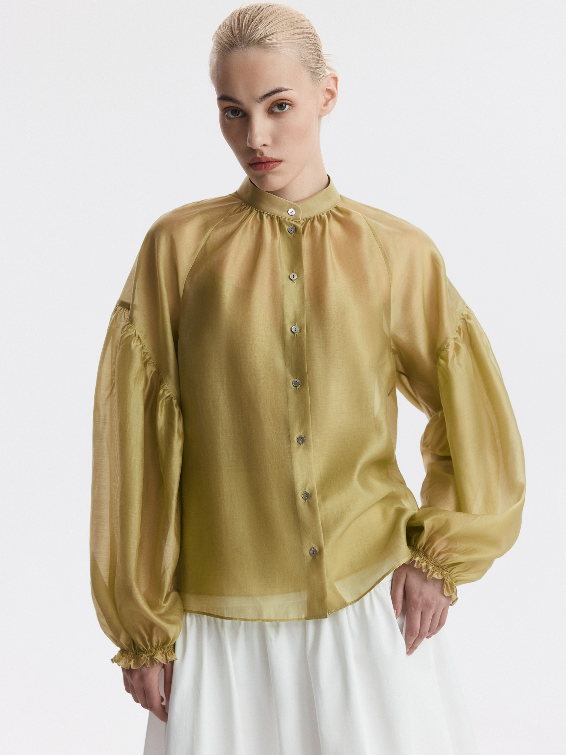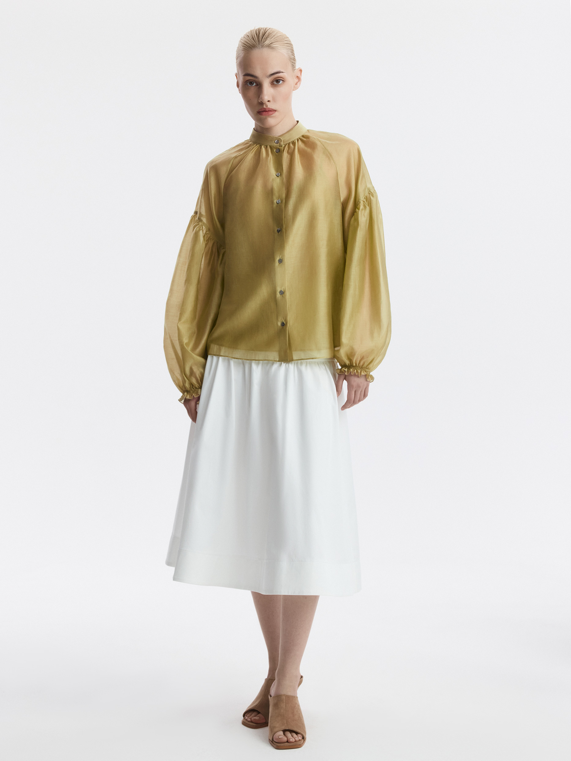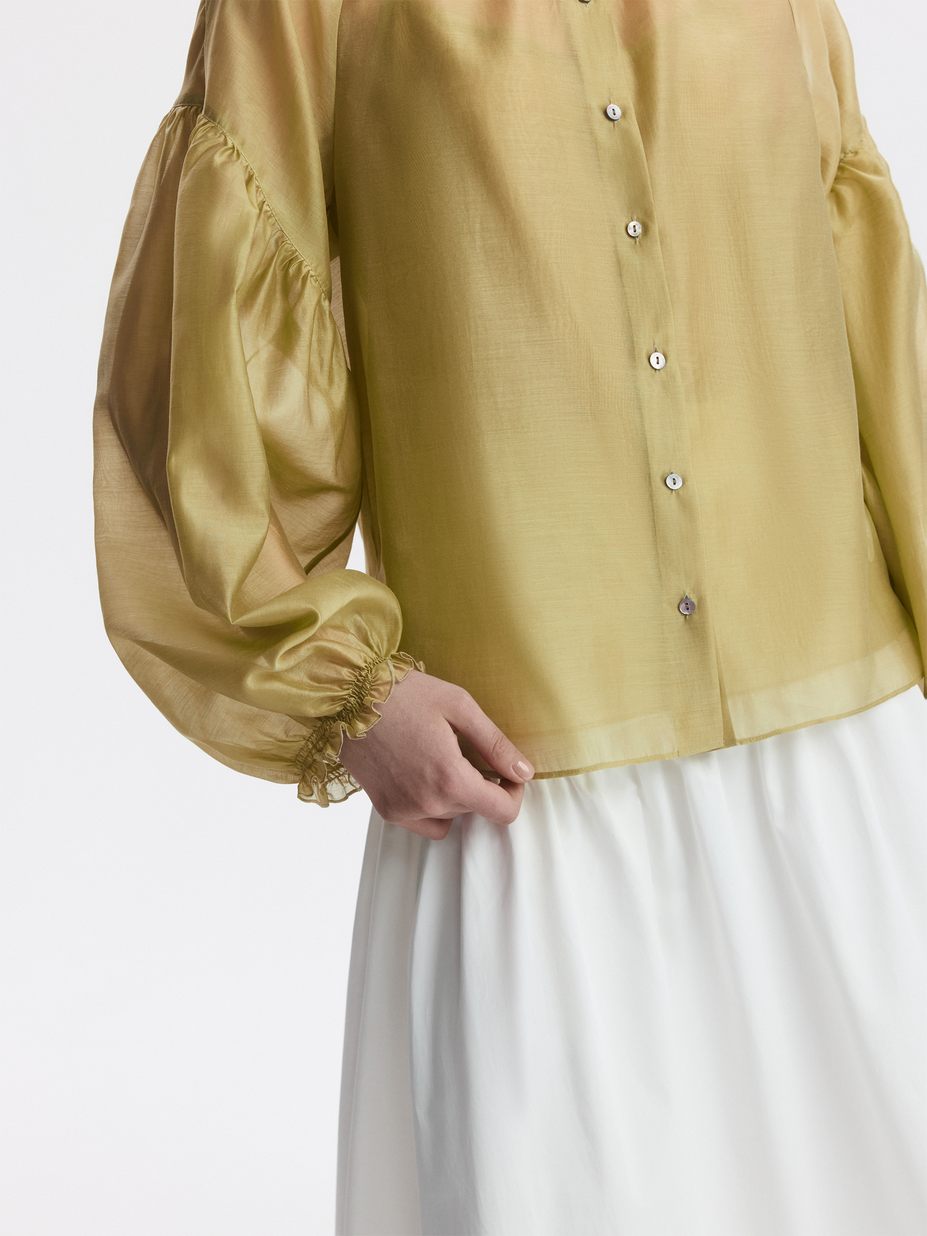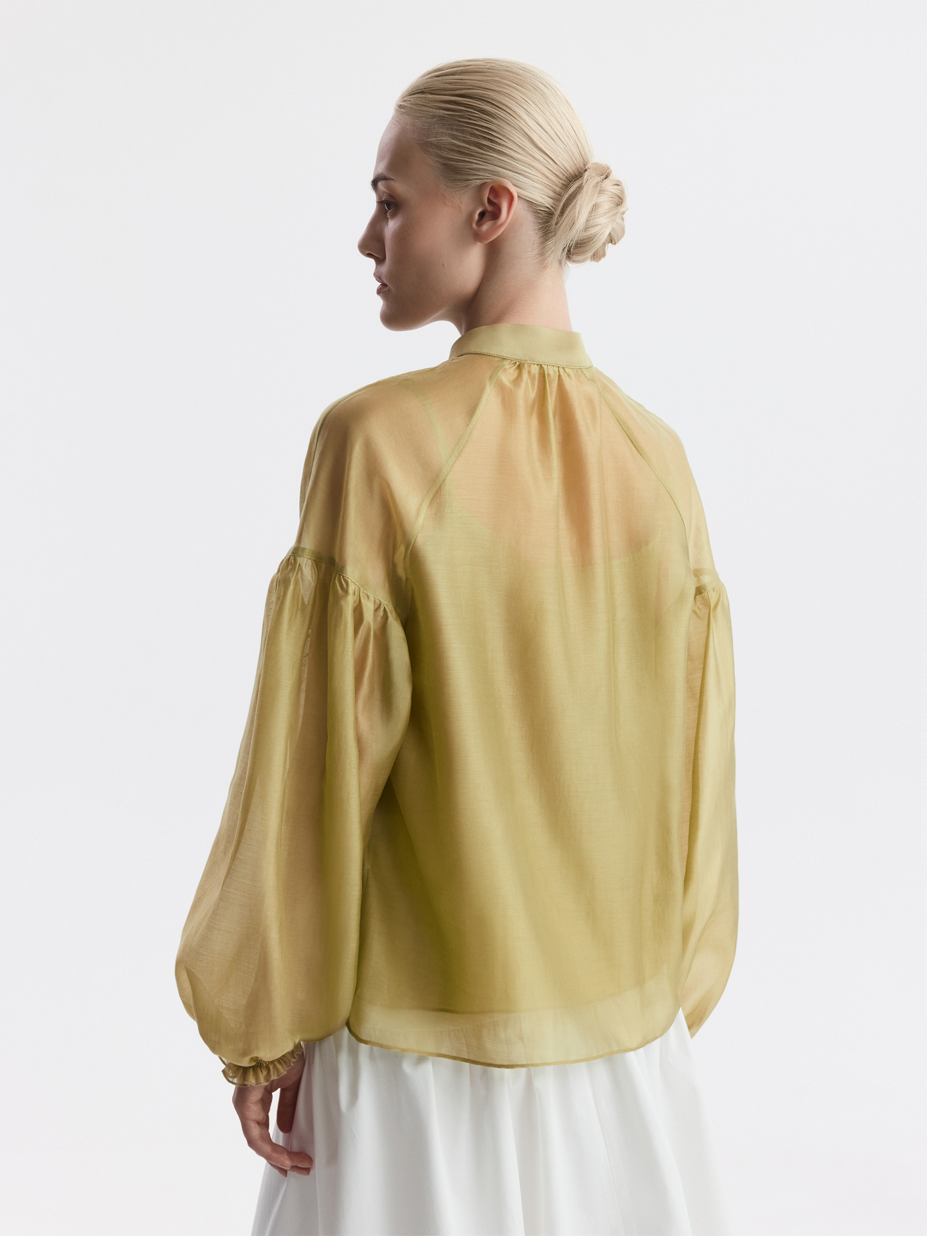 Блуза свободного кроя расслабленно сидит по фигуре и дарит ощущение прохлады. Тонкий полупрозрачный текстиль на основе тенселя (волокна целлюлозы) невесомо касается тела, а нижний топ предотвращает просвечивание.