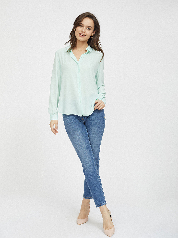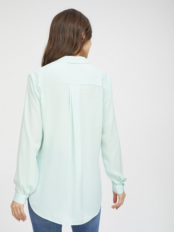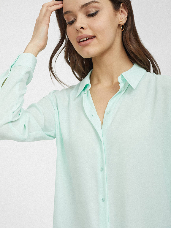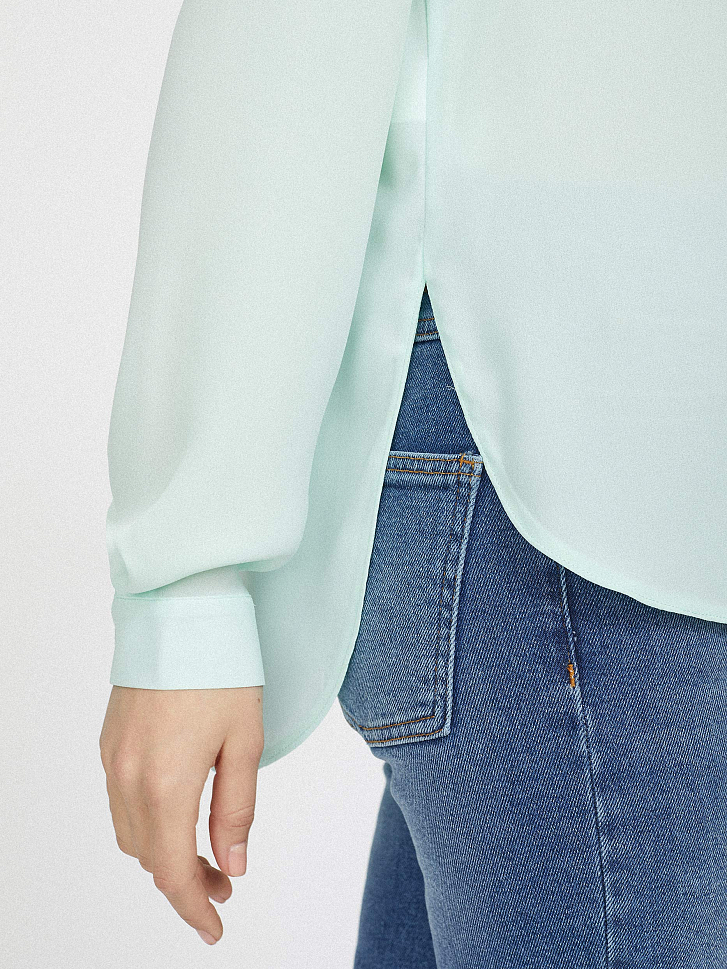 Однотонная рубашка из струящейся ткани. Классический отложной воротник, объемные рукава с манжетами, асимметричный нижний край с разрезами по бокам.