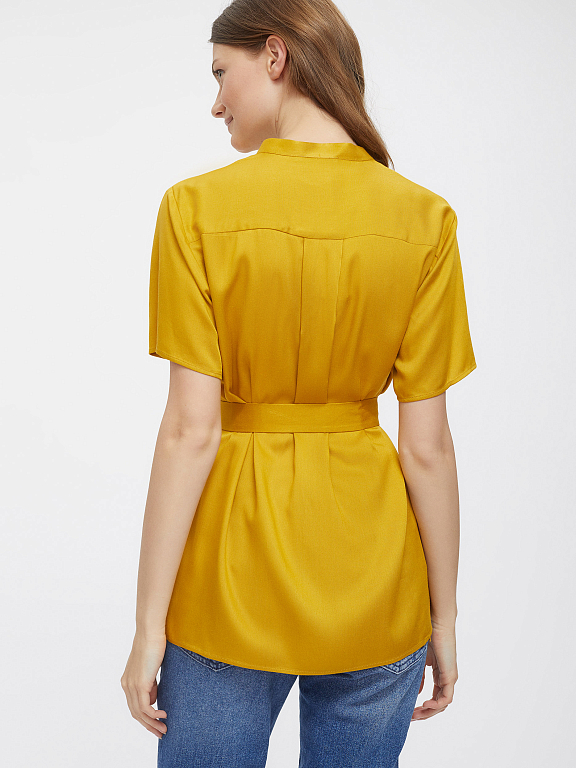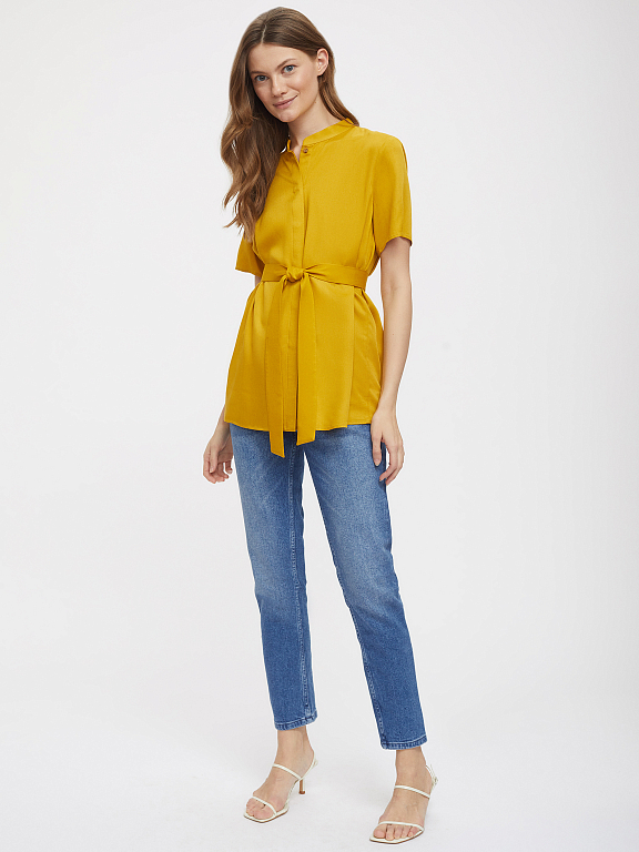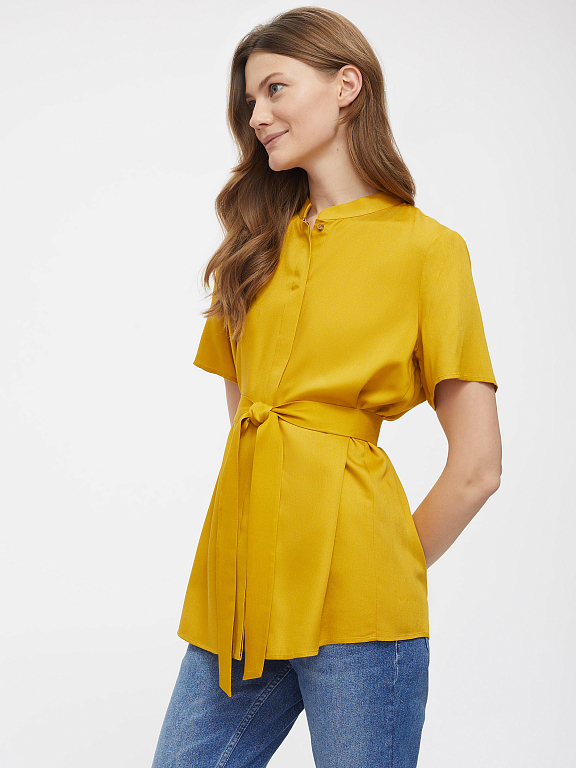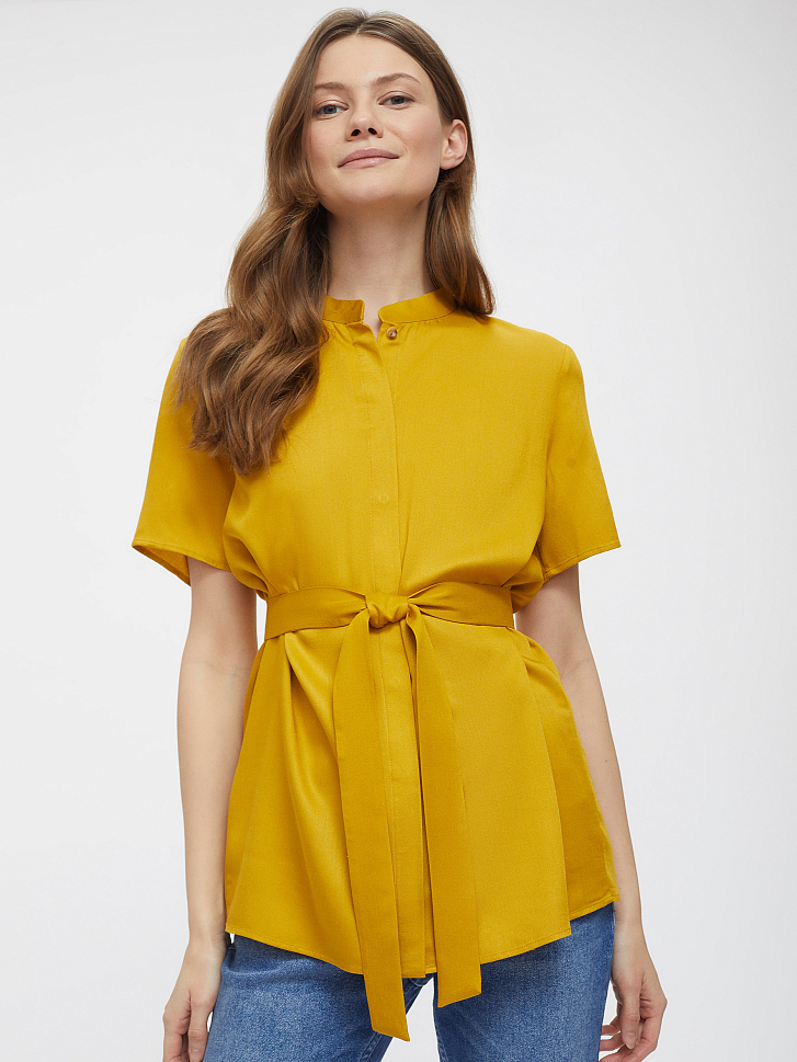 Однотонная блуза из мягкой вискозы. Свободный крой, воротник-стойка, короткие рукава. Застегивается на ряд пуговиц, скрытых планкой. В комплекте пояс.