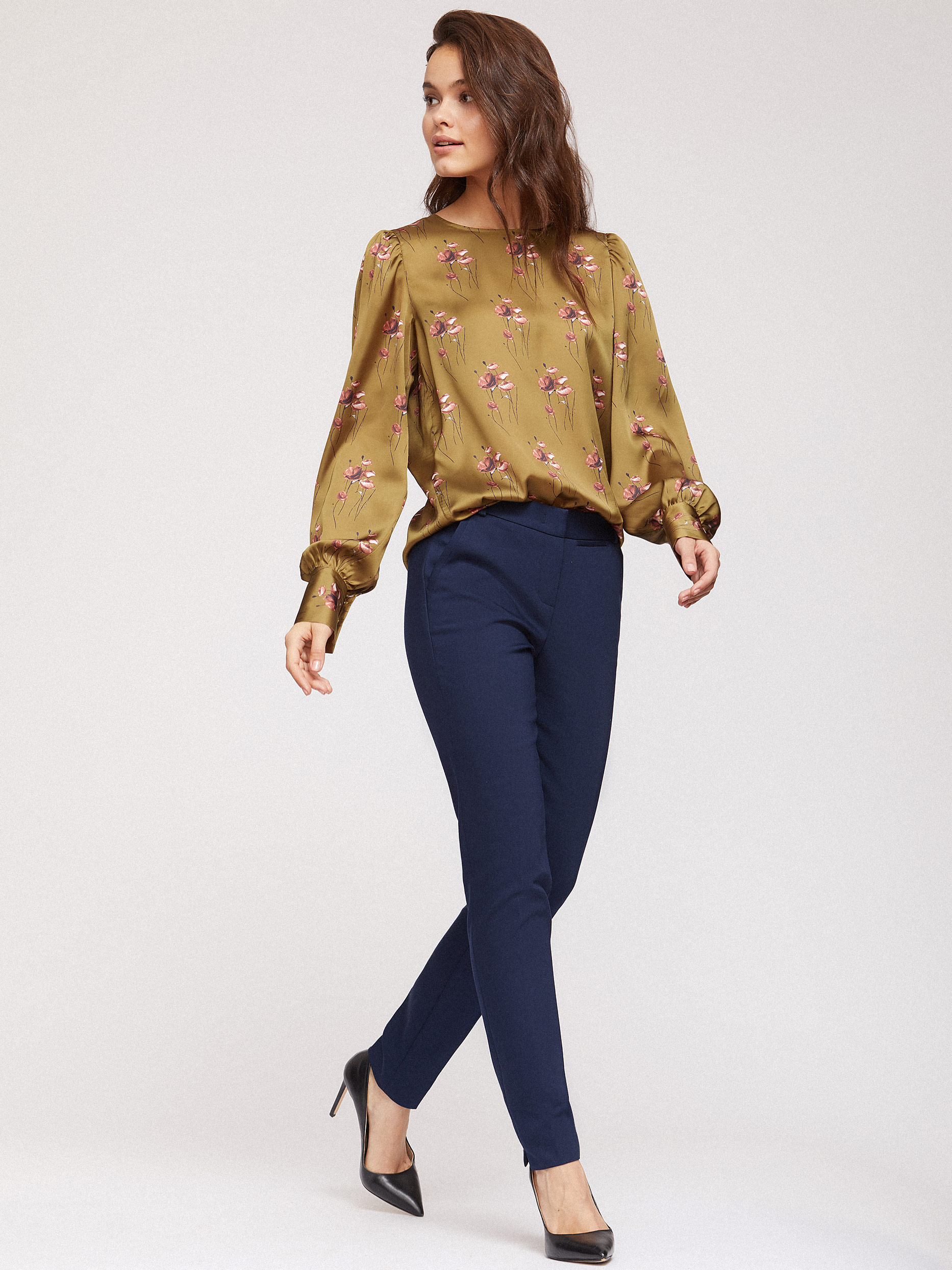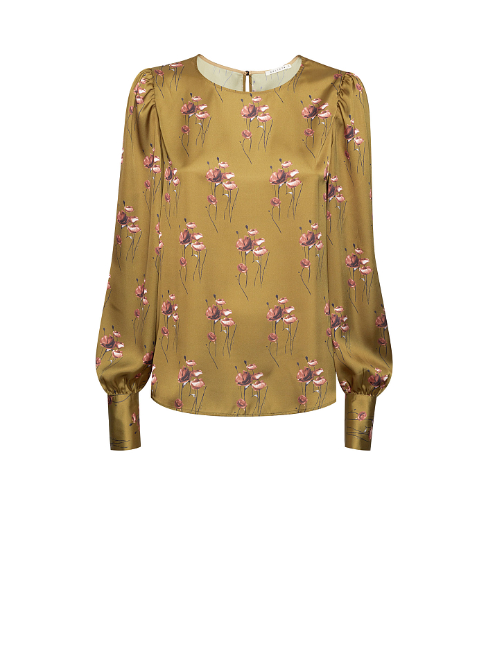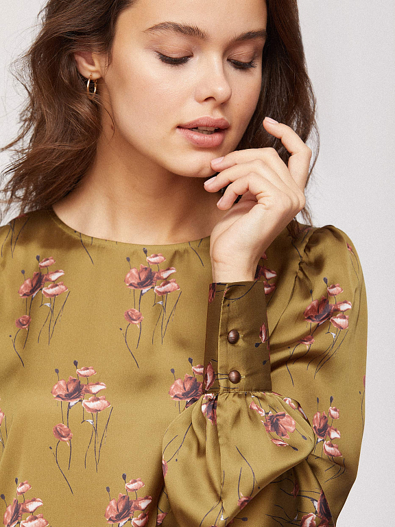 Блуза свободного кроя, выполненная из струящейся ткани. Объемные рукава с широкими манжетами на пуговицах, заложенные складки на плечах. Застегивается на пуговицу сзади.
