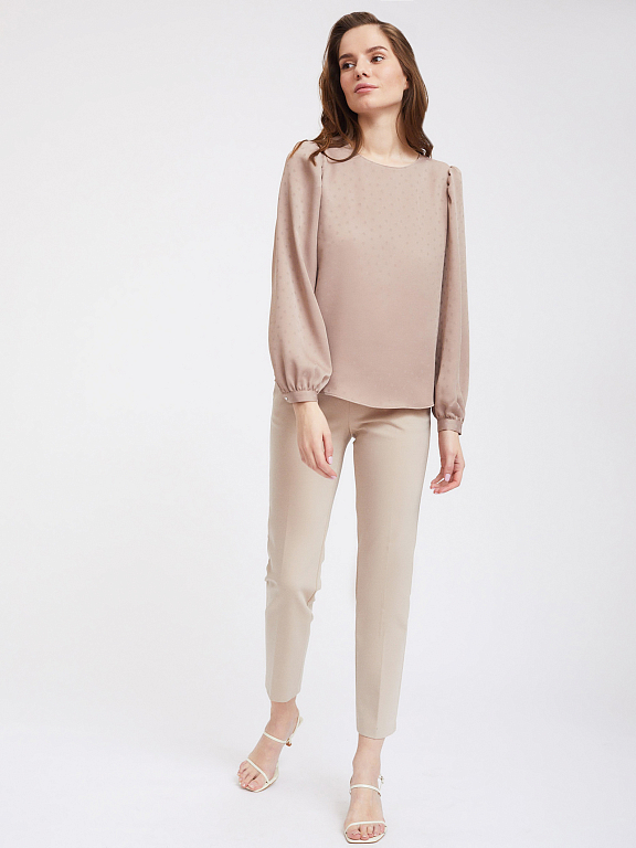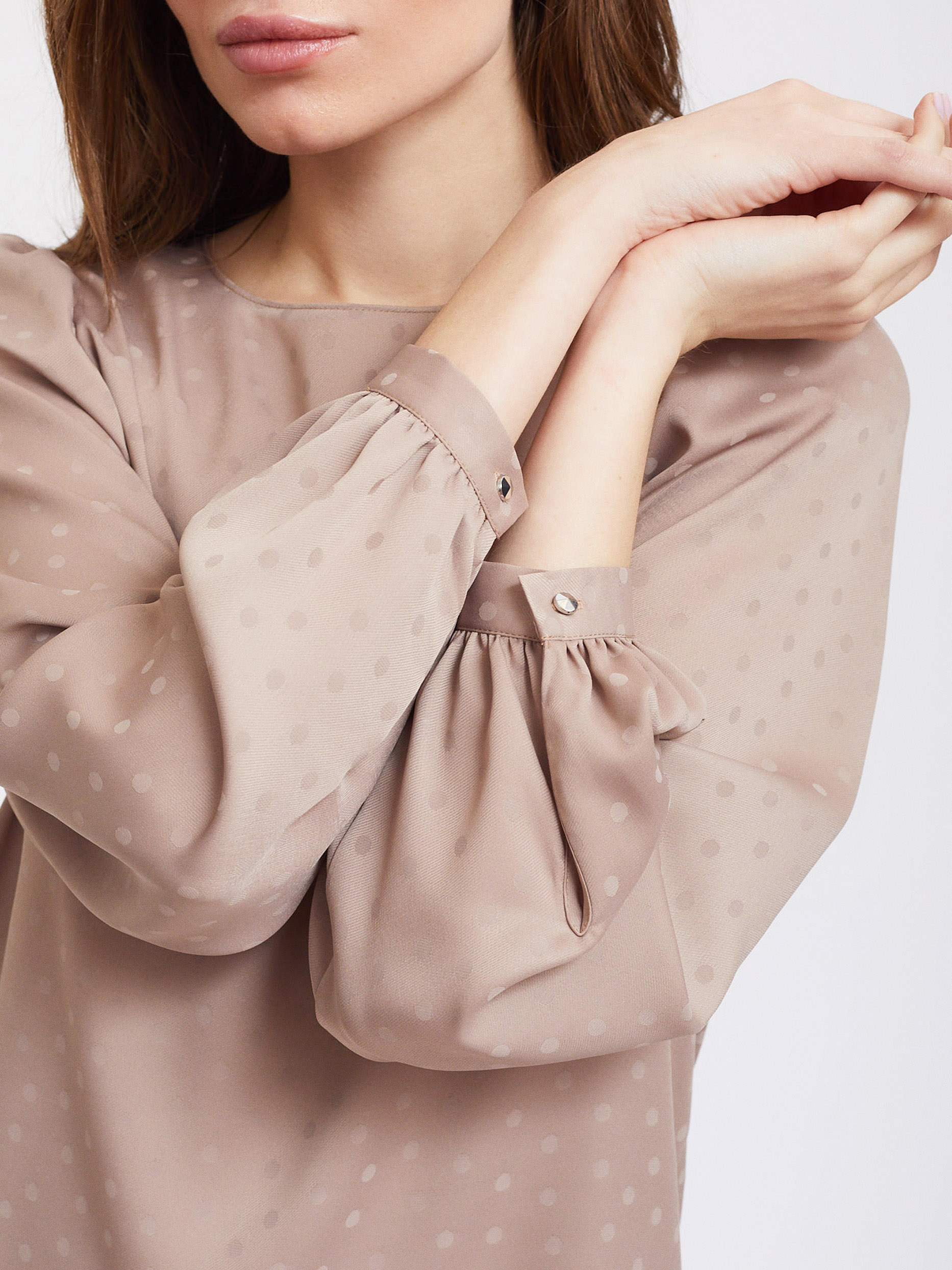 Однотонная блуза прямого кроя. Округлый вырез, длинные объемные рукава с манжетами на пуговицах, застежка на пуговицу сзади.