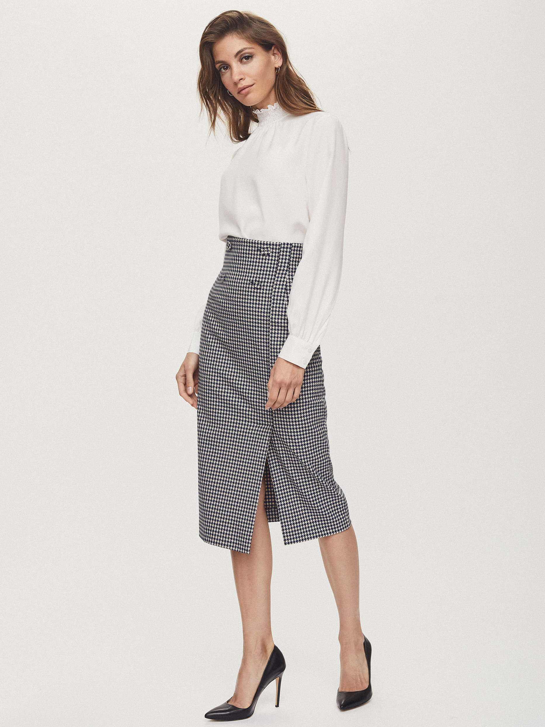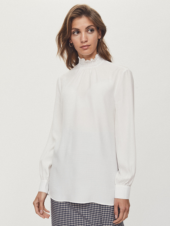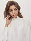 Фактурная блуза свободного кроя, выполненная из модала и вискозы. Высокий воротник, объемные рукава на широких манжетах. Застегивается на ряд небольших обтяжных пуговиц.