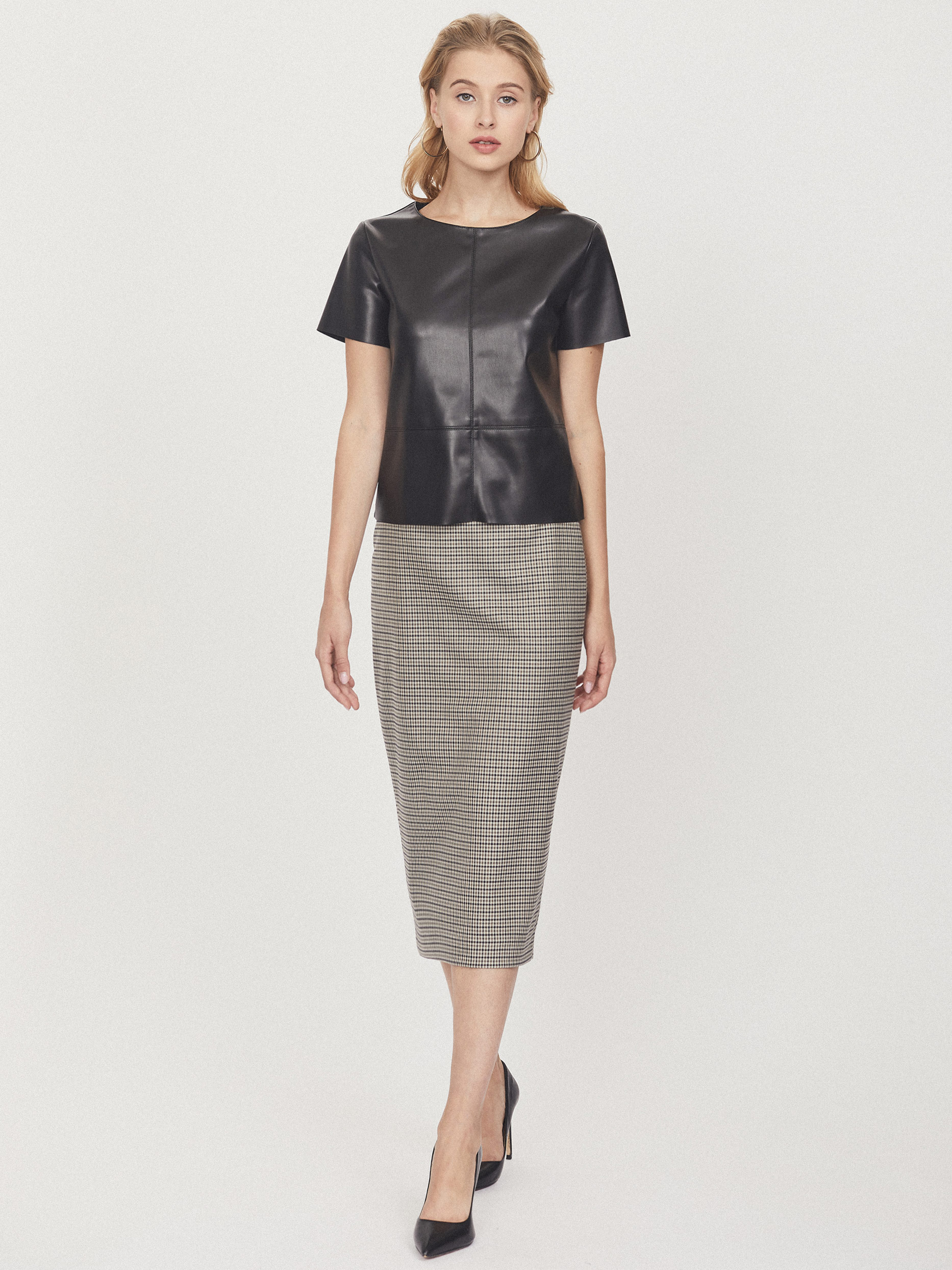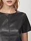 Блуза свободного силуэта. Лицевая часть выполнена из экокожи, округлый вырез, короткие рукава. Застегивается на потайную молнию на спине.
