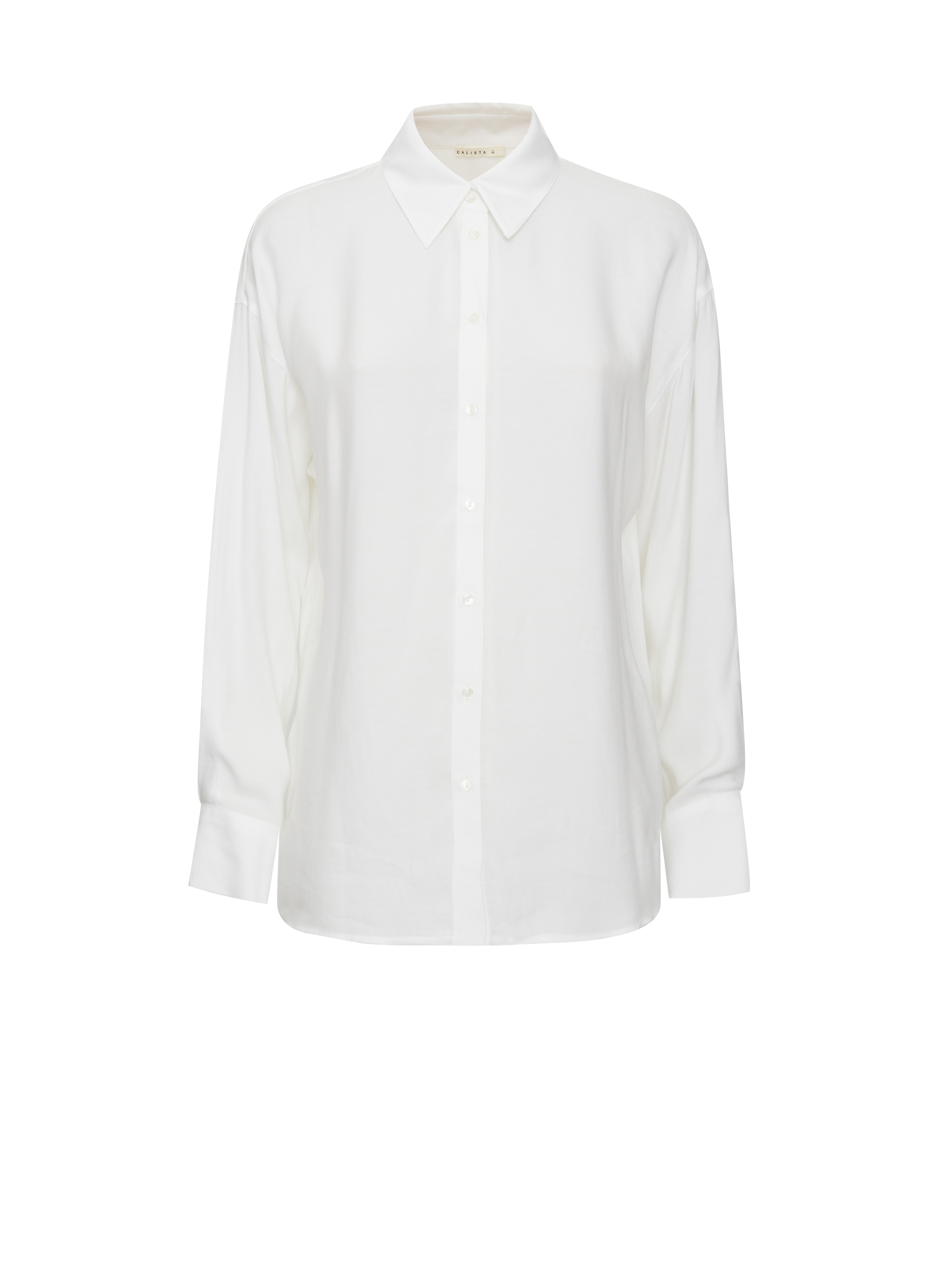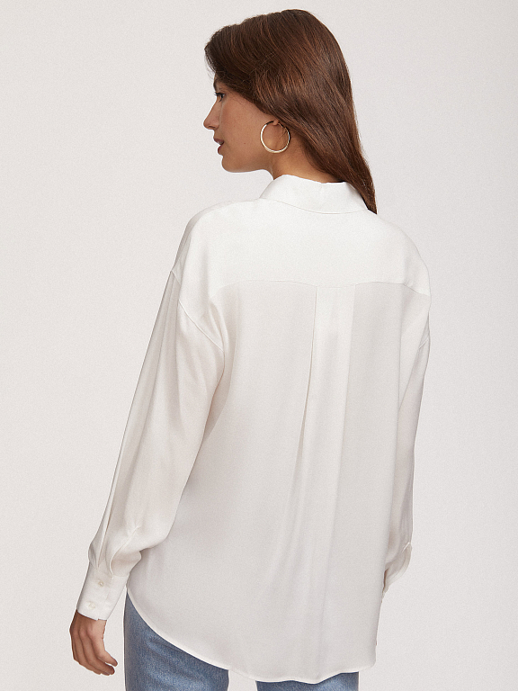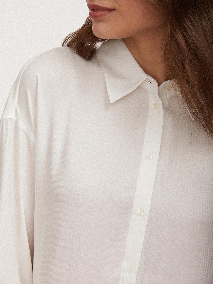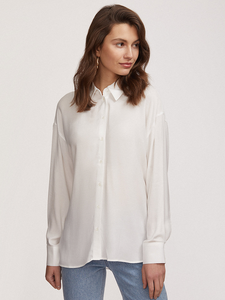 Рубашка свободного кроя, выполненная из тенсела и вискозы. Отложной воротник, длинные рукава с широкими манжетами на пуговицах, спущенная линия плеч. Застегивается на ряд пуговиц.