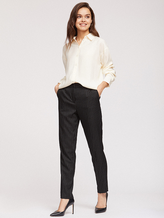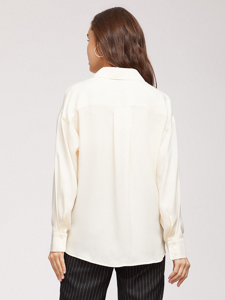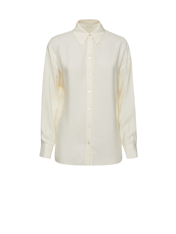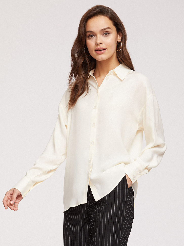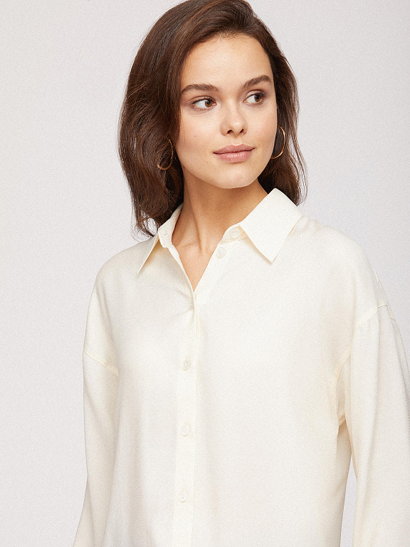 Рубашка свободного кроя, выполненная из тенсела и вискозы. Отложной воротник, длинные рукава с широкими манжетами на пуговицах, спущенная линия плеч. Застегивается на ряд пуговиц.