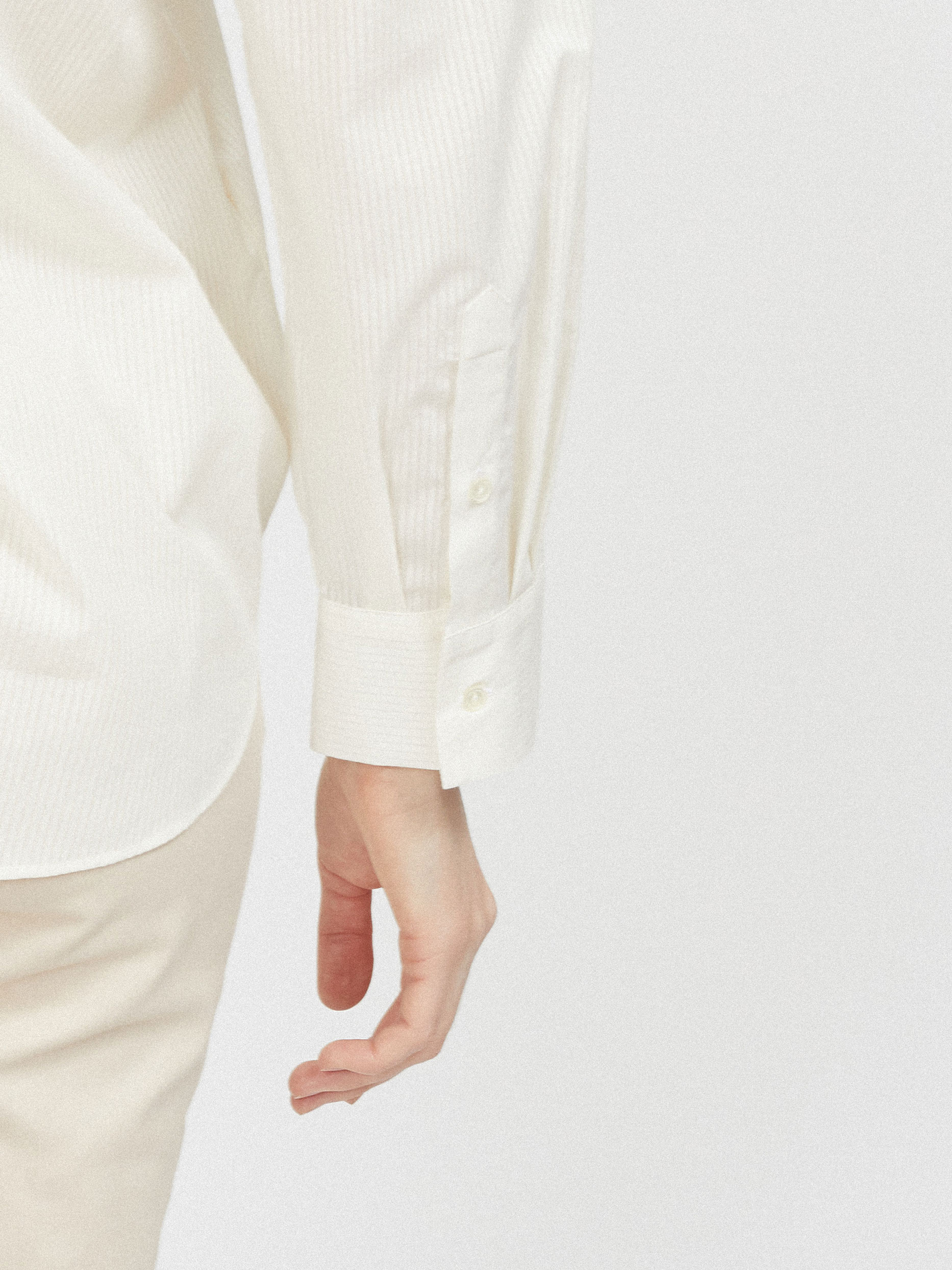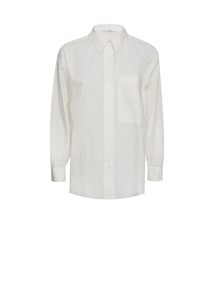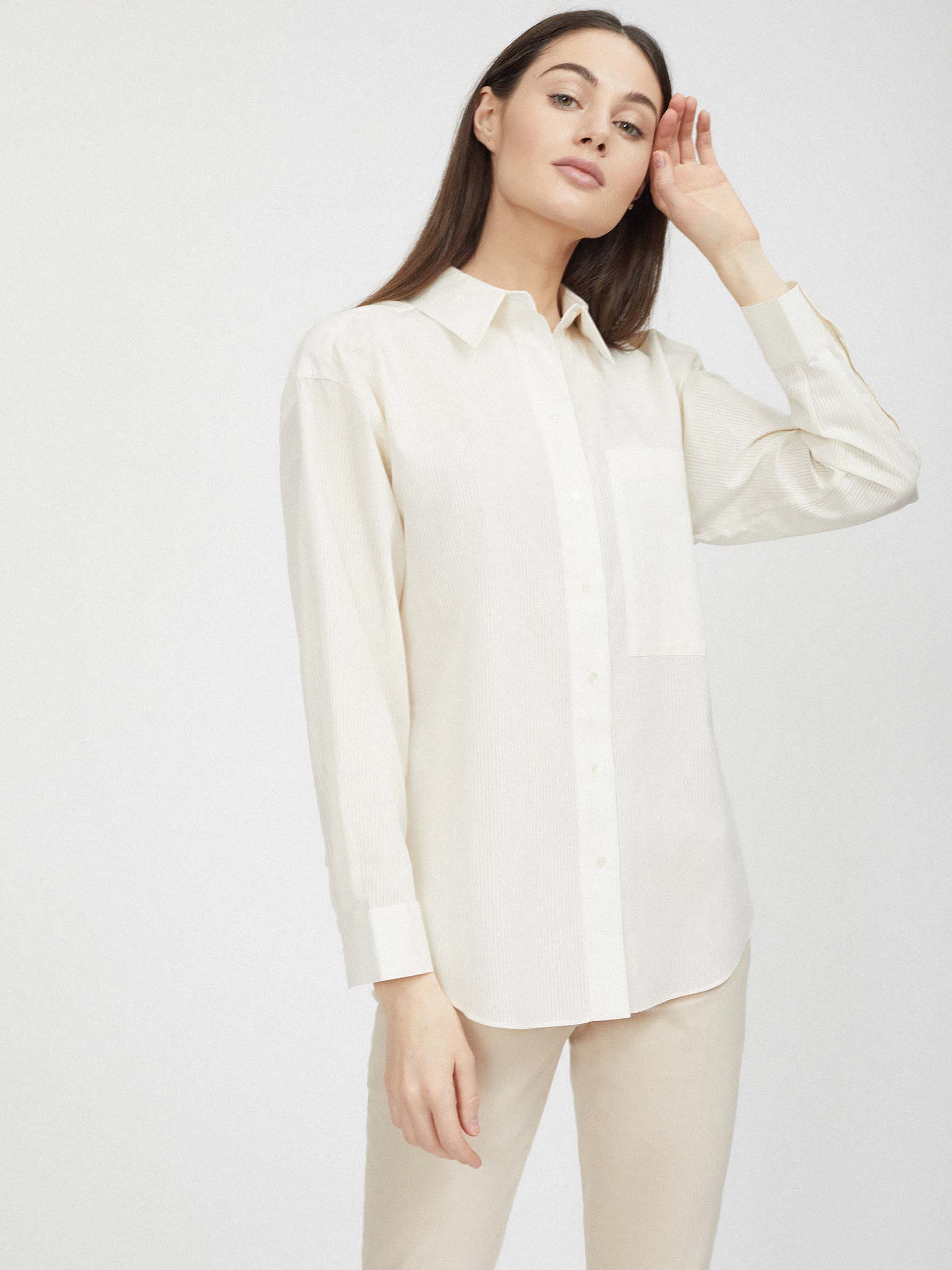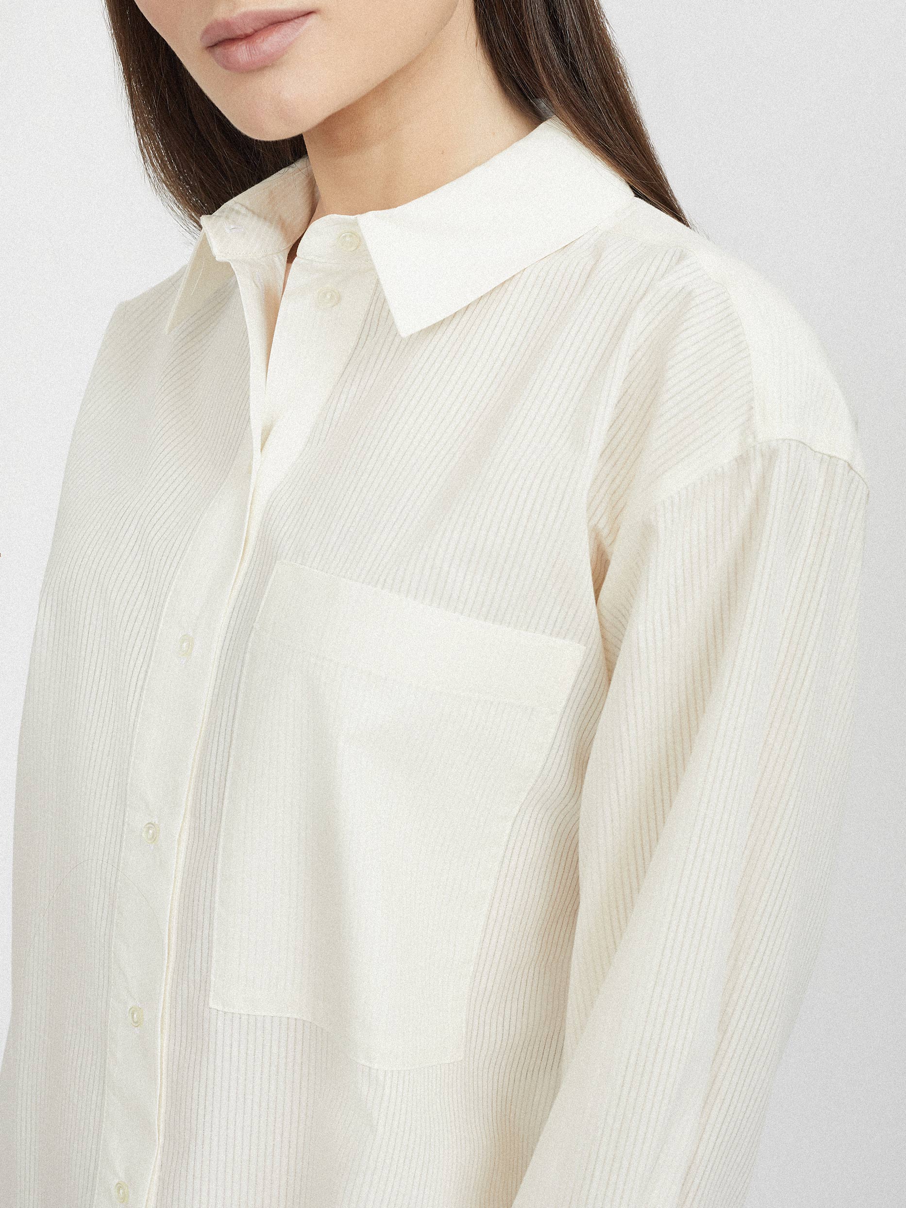 Рубашка в полоску, выполненная из хлопка. Широкий крой, классический отложной воротник, спущенная линия плеч, накладной нагрудный карман.