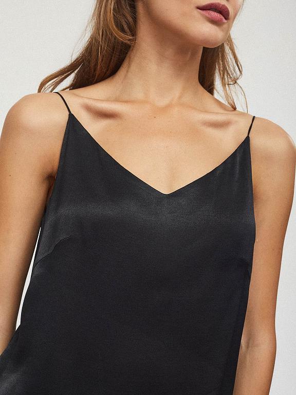 Топ прямого кроя, выполненный из струящейся вискозы с добавлением рэйона. V-образный вырез, разрезы по бокам нижнего края. Изделие на подкладке.