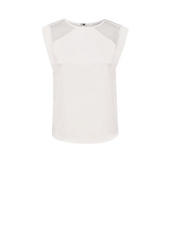 Блуза без рукавов, выполненная из струящейся ткани. Округлый вырез, вставки из кружева, закругленный нижний край.