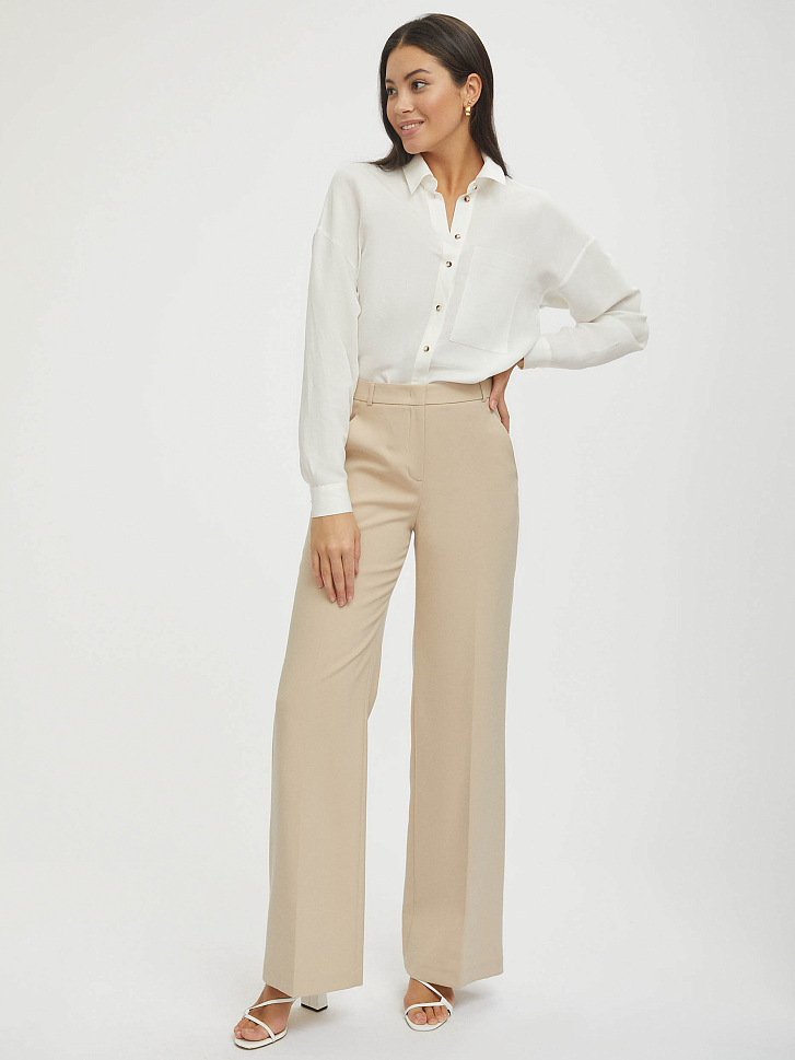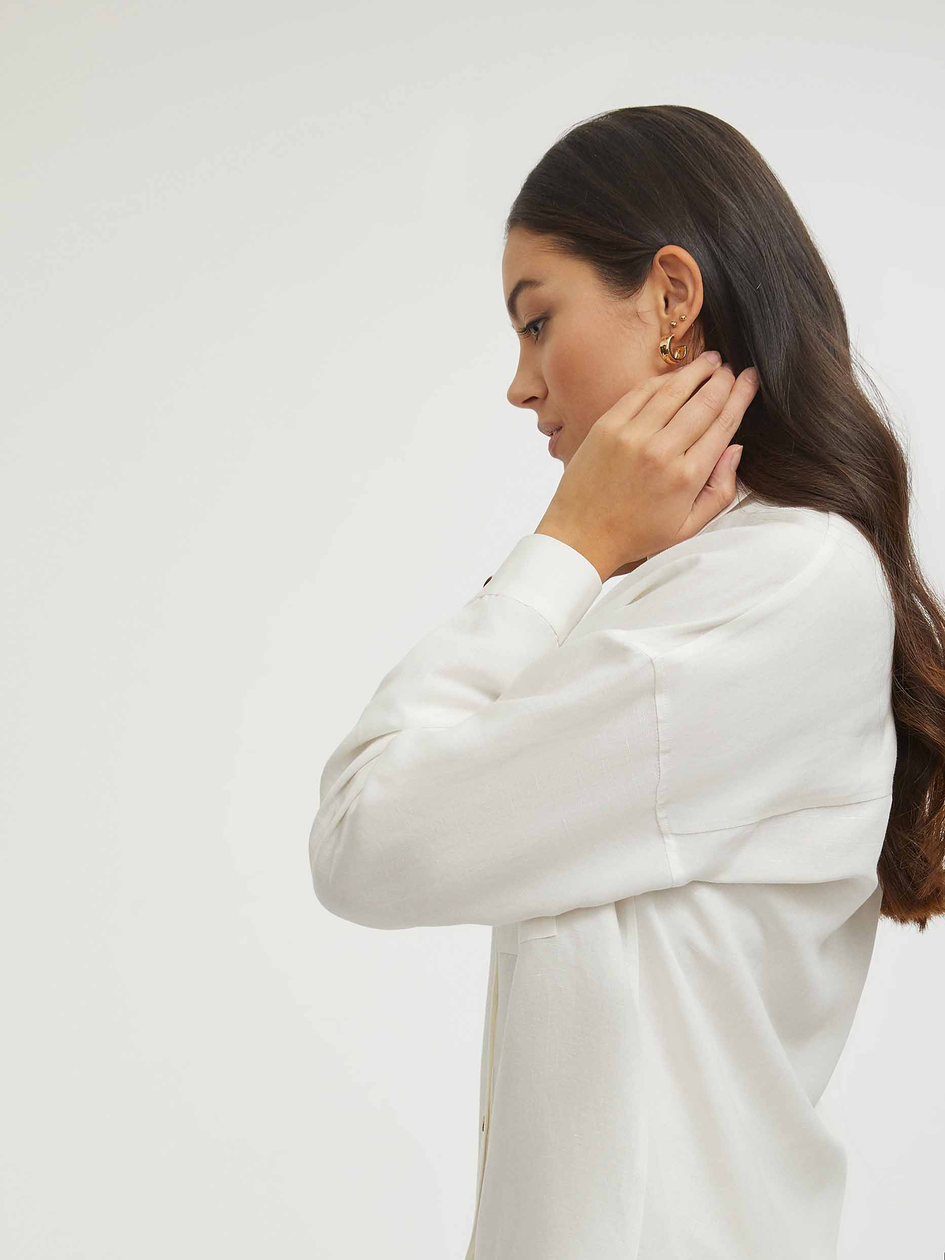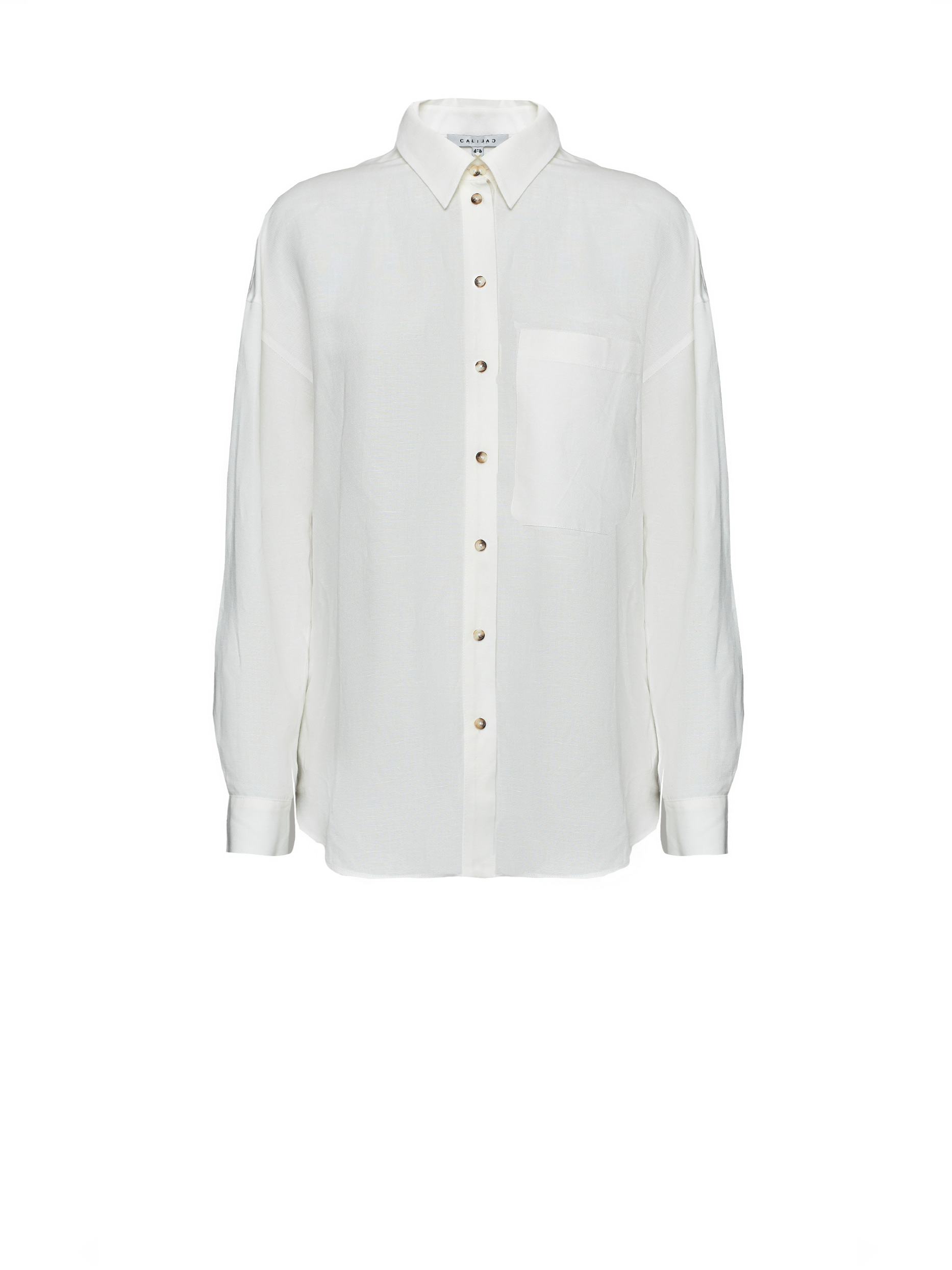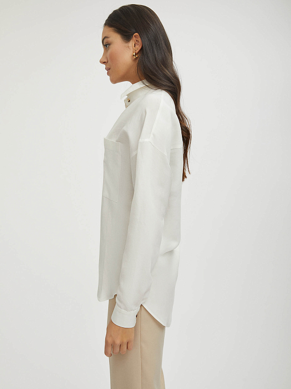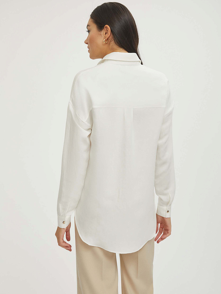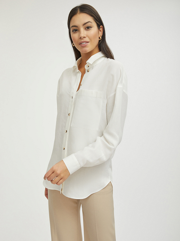 Рубашка свободного силуэта из смесового льна с объемными рукавами. Спущенная линия плеч, накладной нагрудный карман, асимметричный закругленный нижний край.