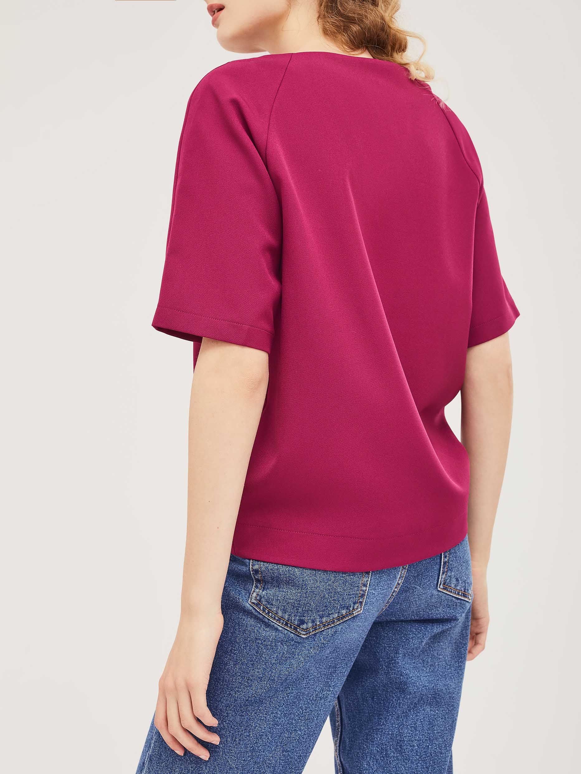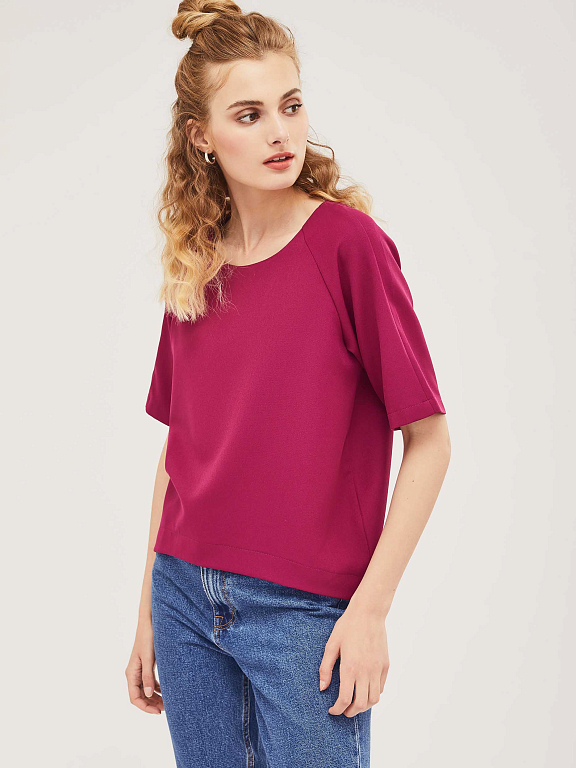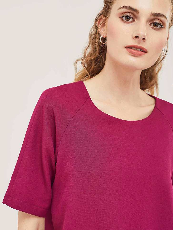 Блуза свободного силуэта с рукавами "реглан" и фигурным нижним краем. Изделие с короткими рукавами. Изделие без подкладки.  Рост модели 172 см, размер 42 (российский)