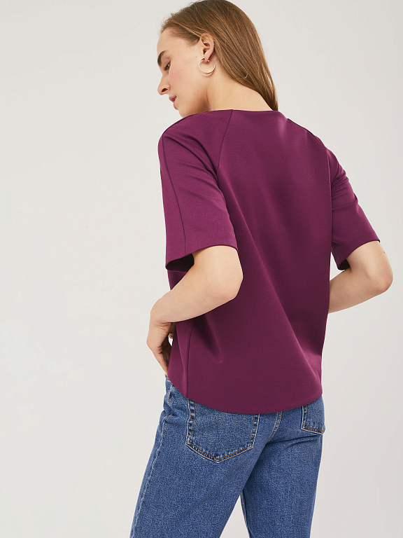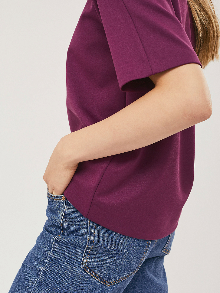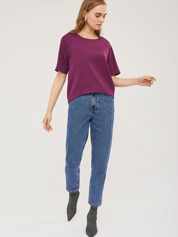 Блуза свободного силуэта с рукавами "реглан" и фигурным нижним краем. Изделие с короткими рукавами, без подкладки. Рост модели 172 см, размер 42 (российский)
