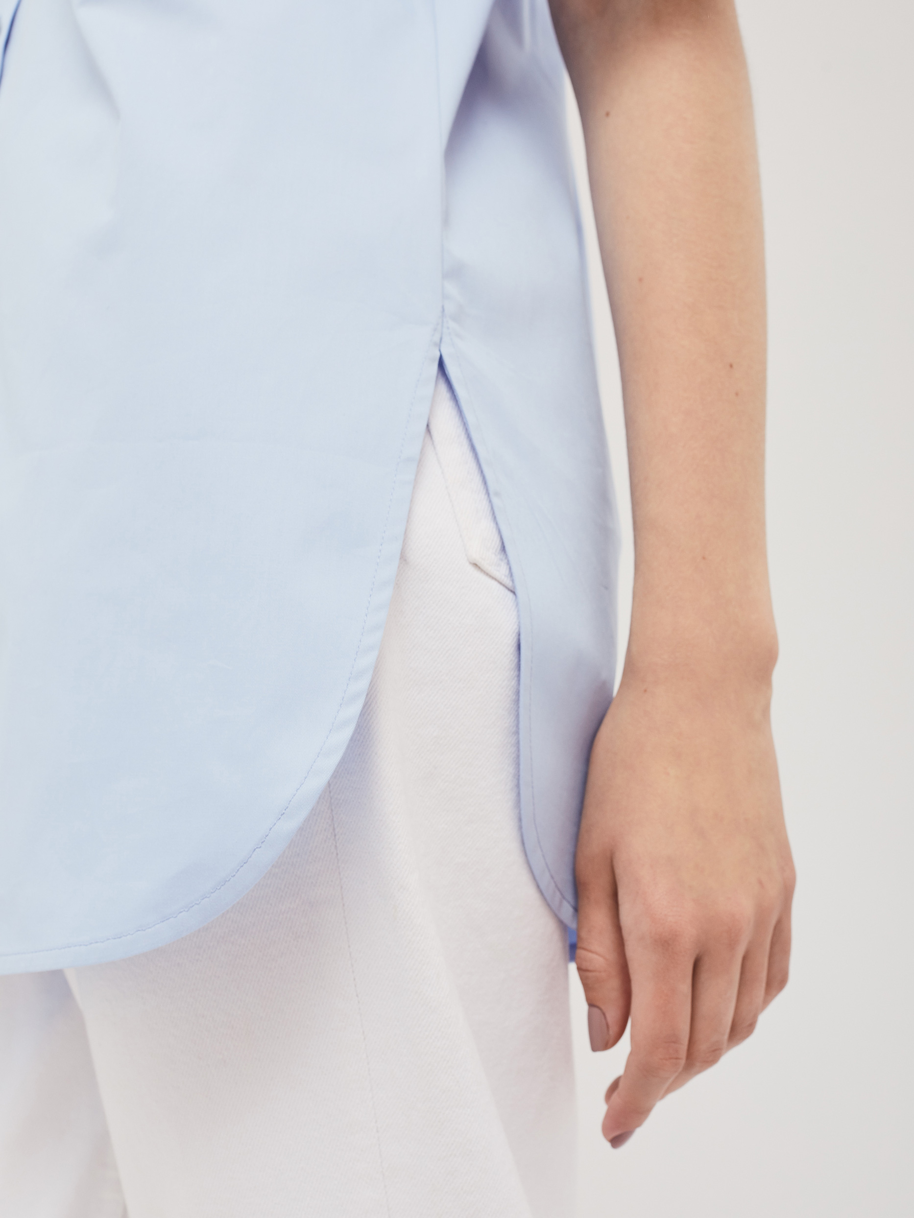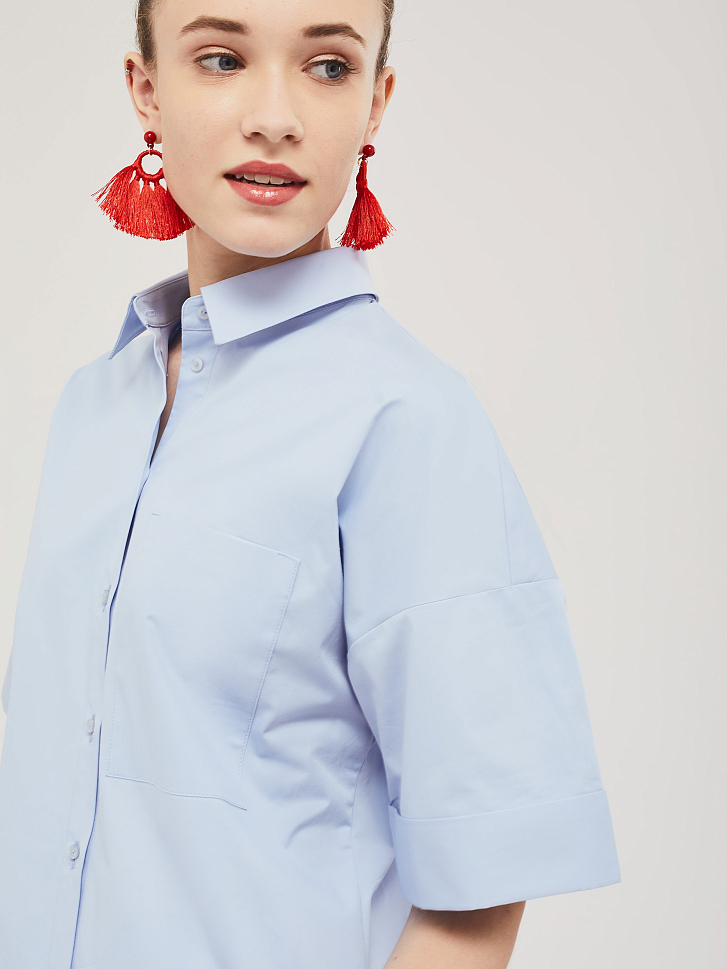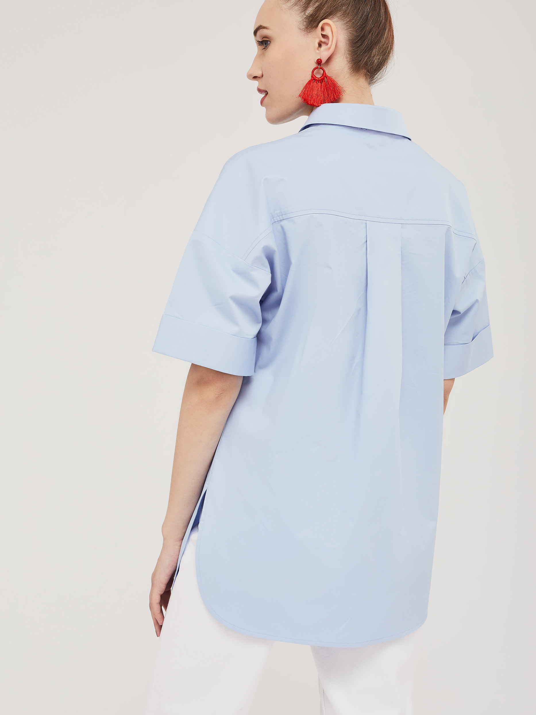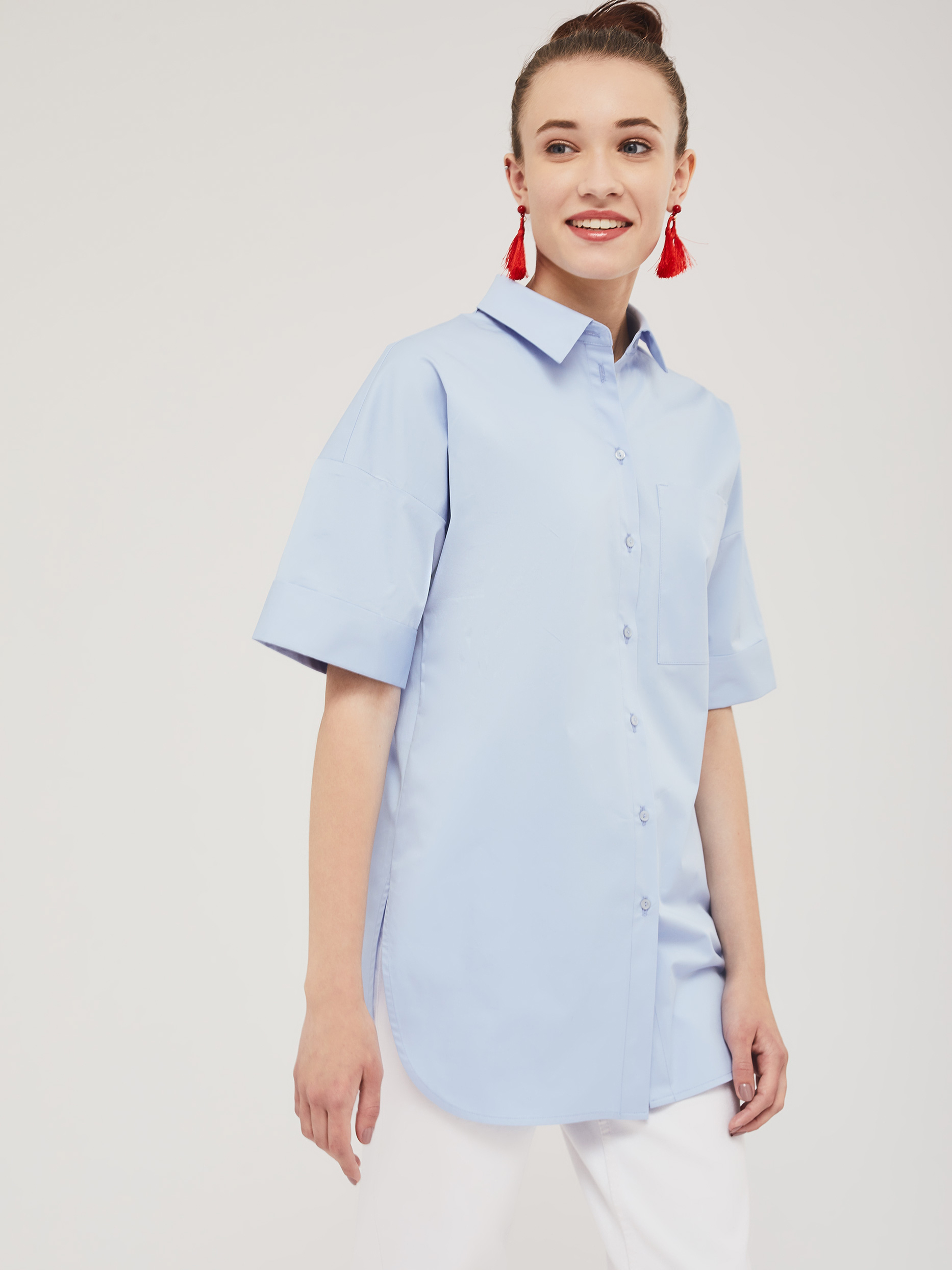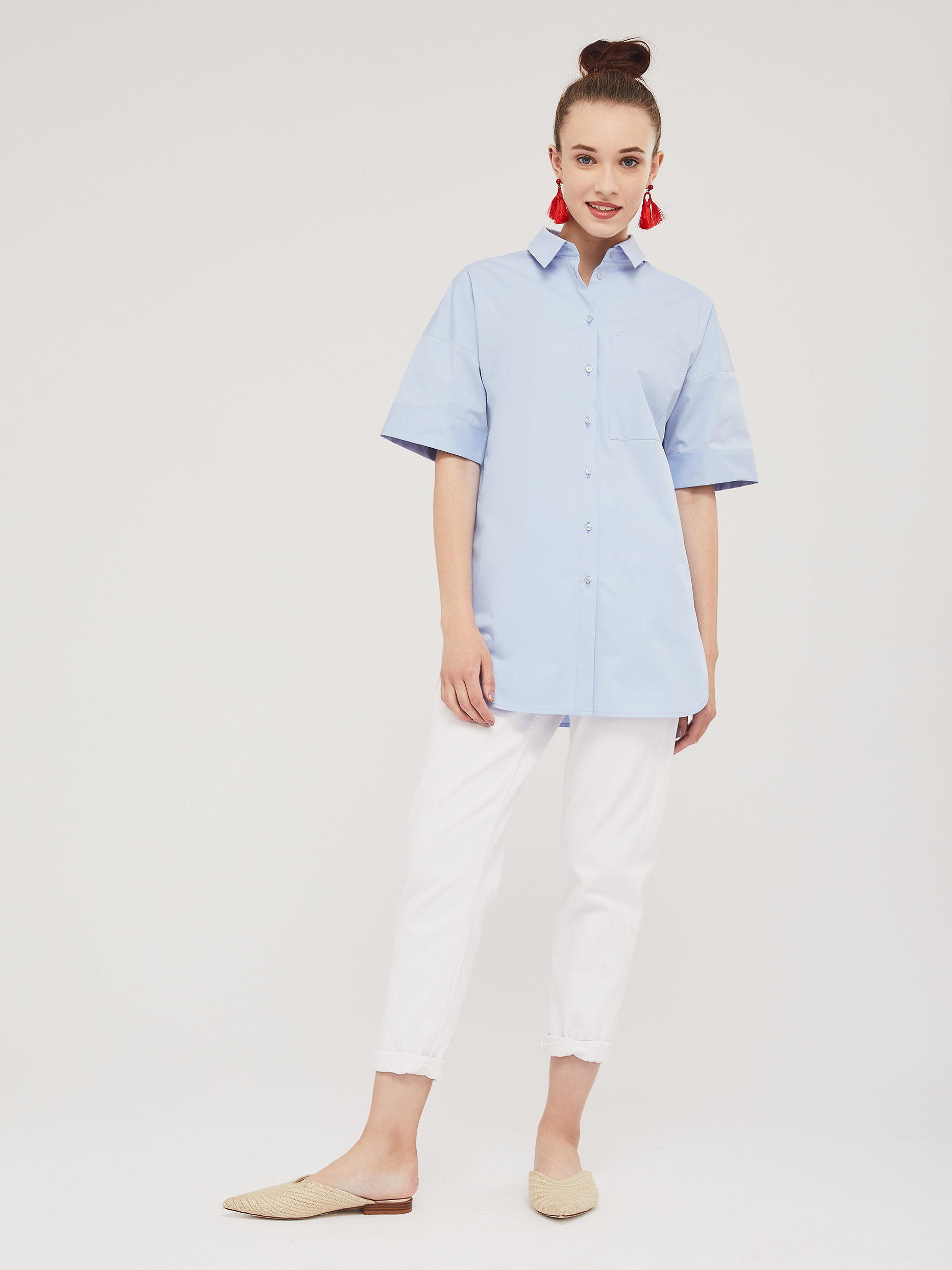 Удлинённая рубашка свободного силуэта из плотного хлопка с накладным карманом на груди. Изделие со спущенной линией плеча и короткими рукавами с отворотами. Застёжка на пуговичную планку.  Изделие без подкладки.  Рост модели 176 см, размер 42 (российский)