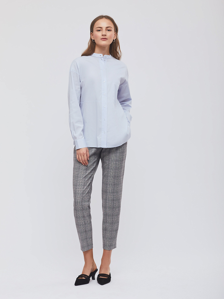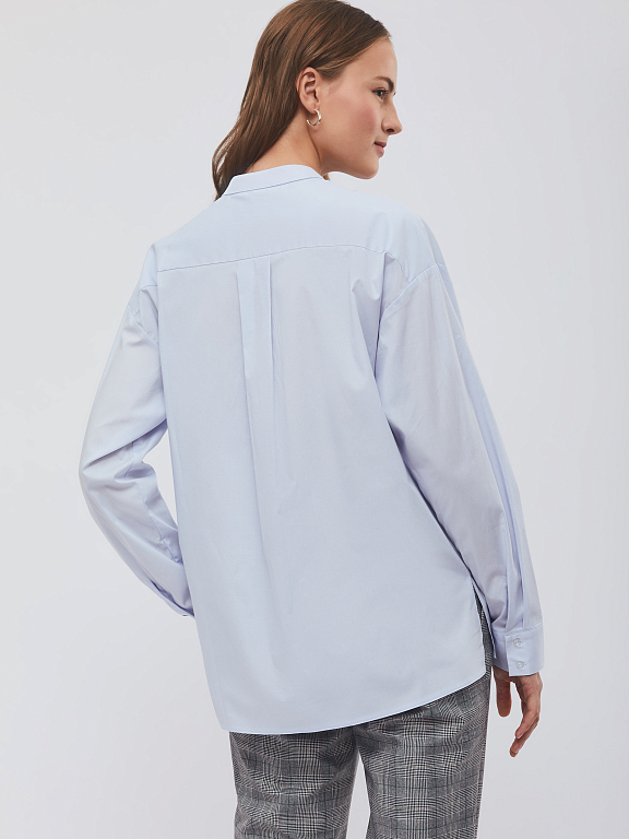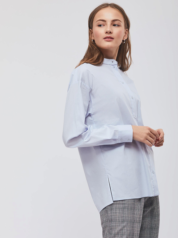 Свободная рубашка, выполненная из смесового хлопка. Воротник-стойка, спущенная линия плеч, накладной нагрудный карман, отрезная линия талии, невысокие разрезы по бокам нижнего края.