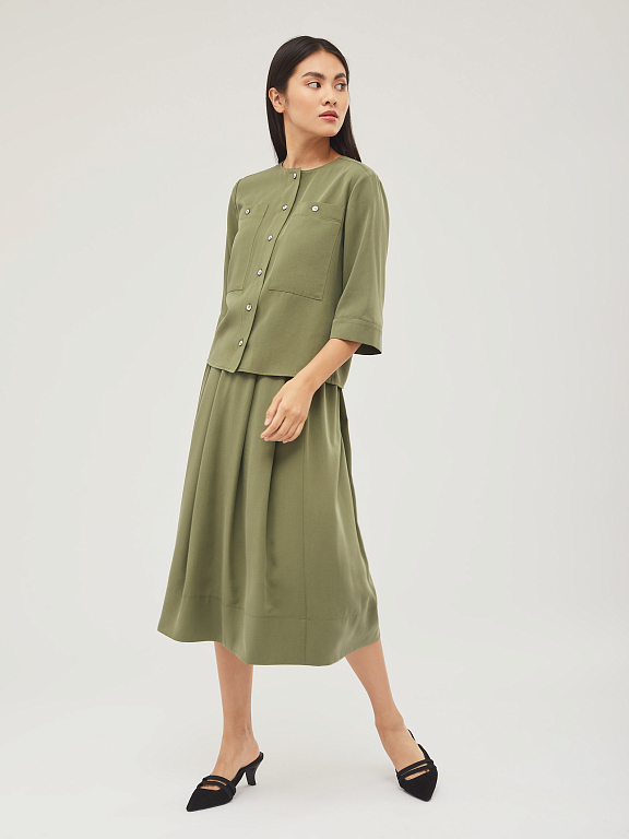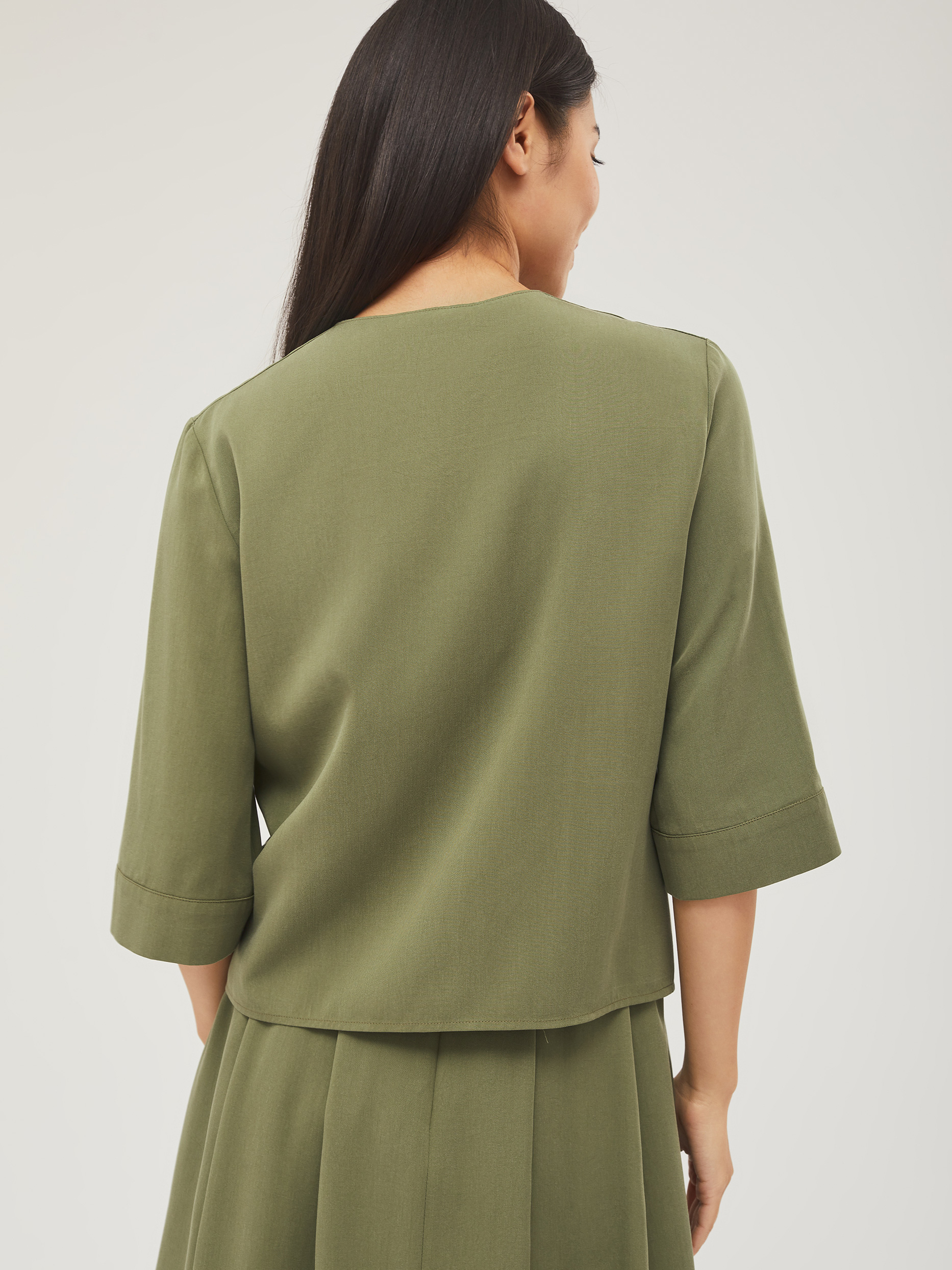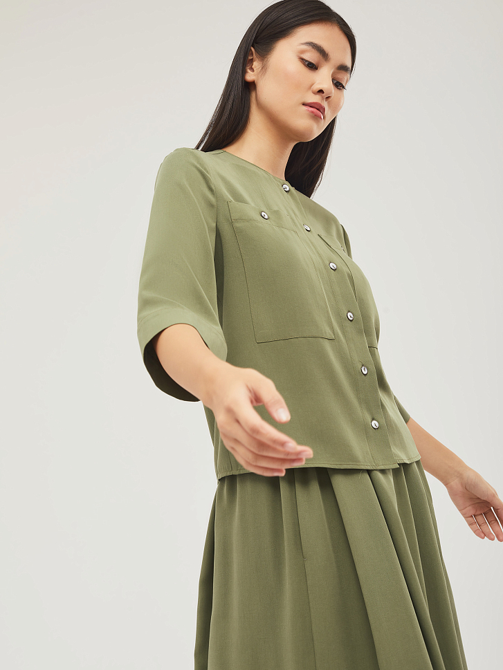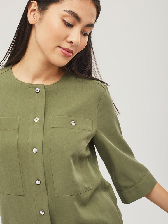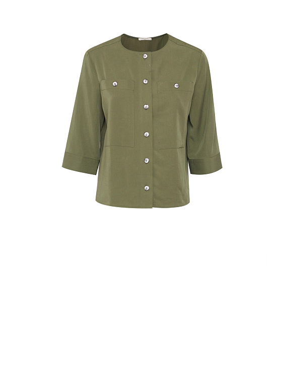 Блуза прямого кроя. Округлый вырез, рукава длины 3/4, накладные нагрудные карманы на пуговицах. Застегивается на ряд пуговиц мраморной расцветки с контрастной окантовкой.