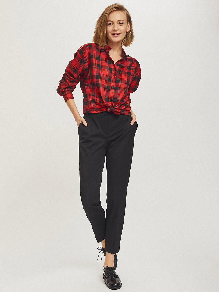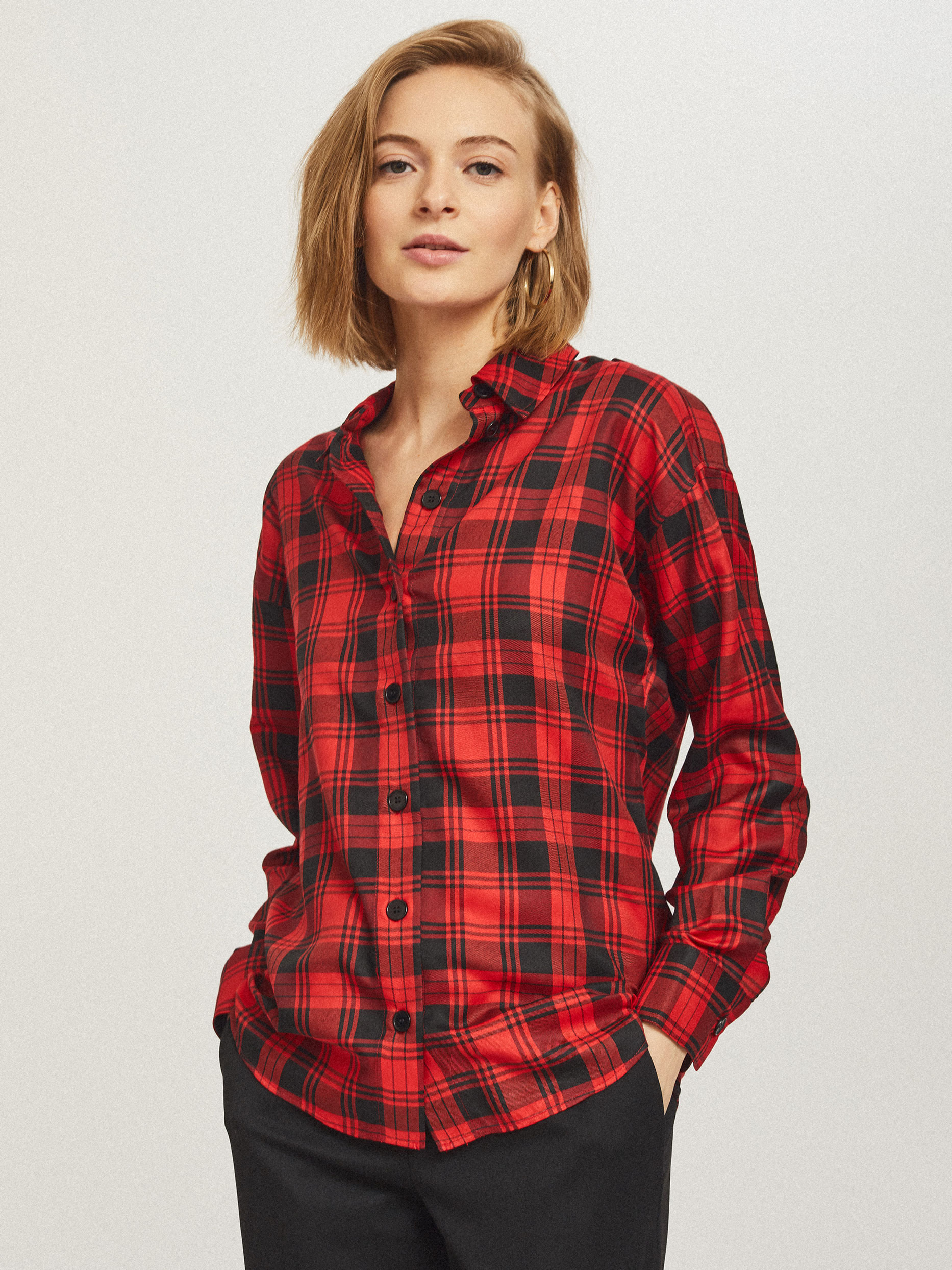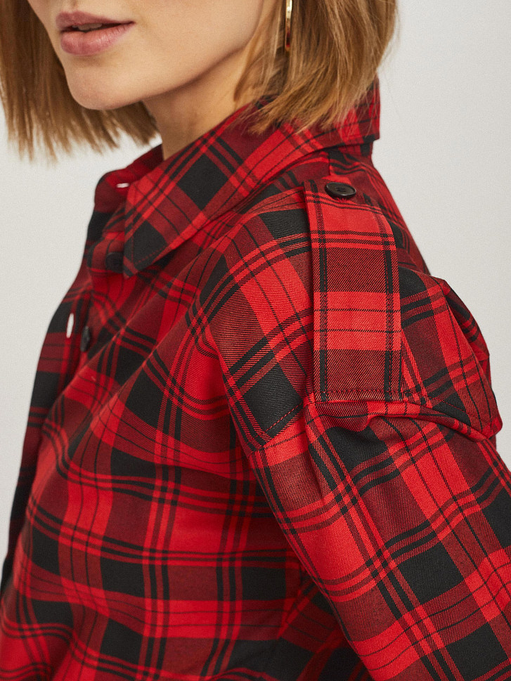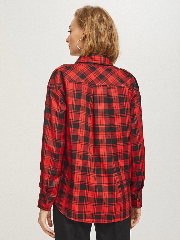 Рубашка свободного силуэта, выполненная из смесовой вискозы. Классический отложной воротник, спущенная линия плеч, декоративные эполеты на плечах, закругленный нижний край. Застегивается на ряд контрастный пуговиц.