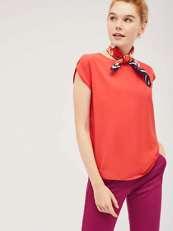 Топ прямого силуэта с фантазийными рукавами и круглым вырезом горловины.  Сзади разрез с застёжкой на пуговицу. Изделие без подкладки.  Рост модели 172 см, размер 42 (российский)