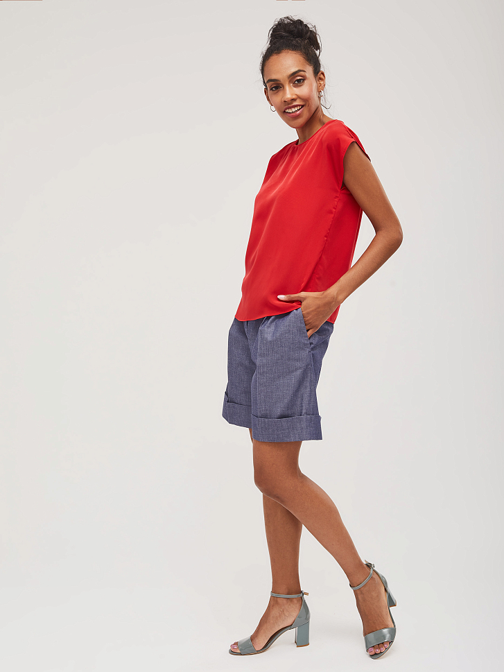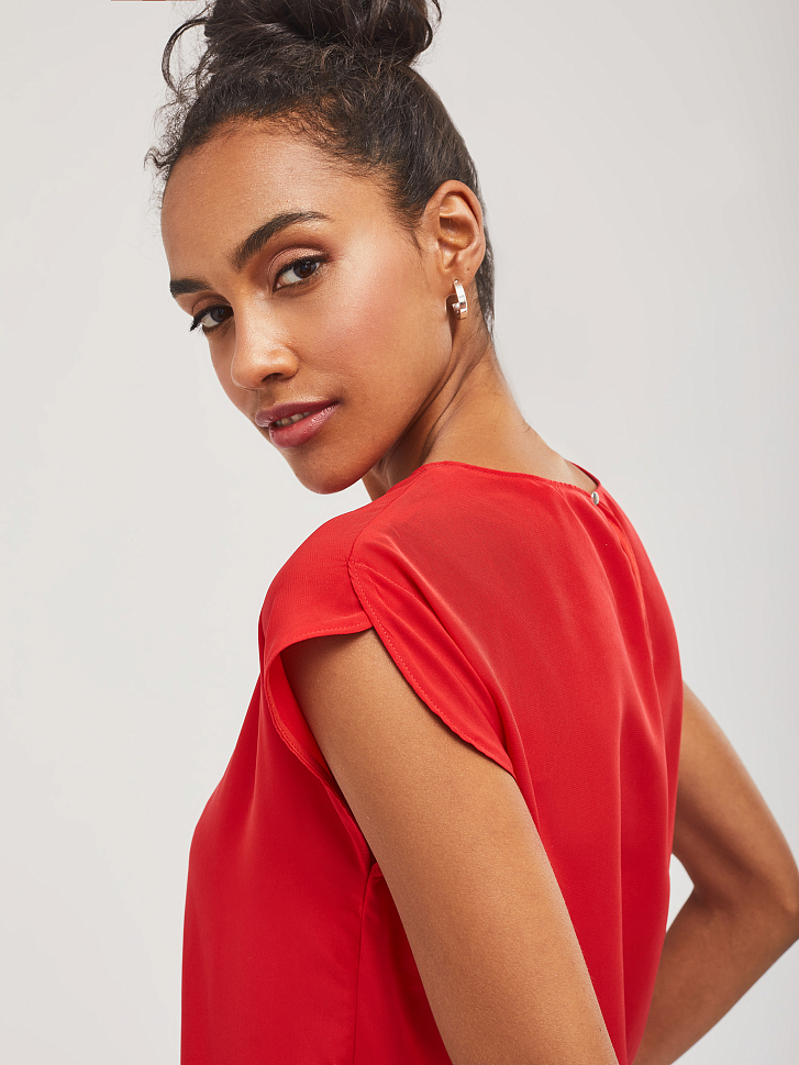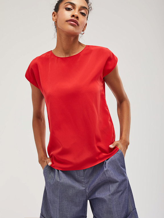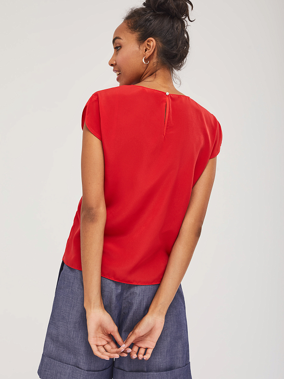 Топ прямого силуэта с фантазийными рукавами и круглым вырезом горловины.  Сзади разрез с застёжкой на пуговицу. Изделие без подкладки.  Рост модели 173 см, размер 42 (российский)