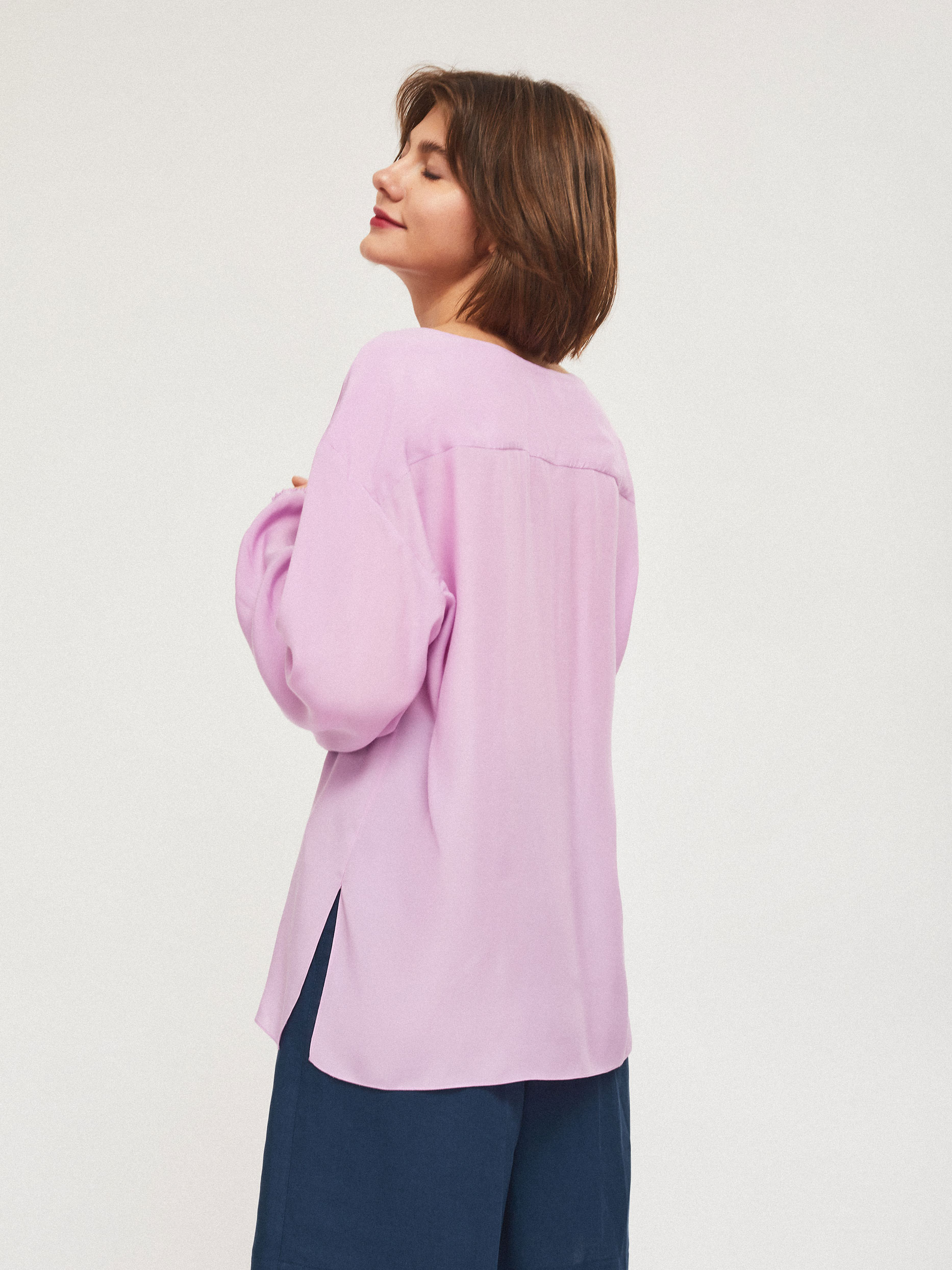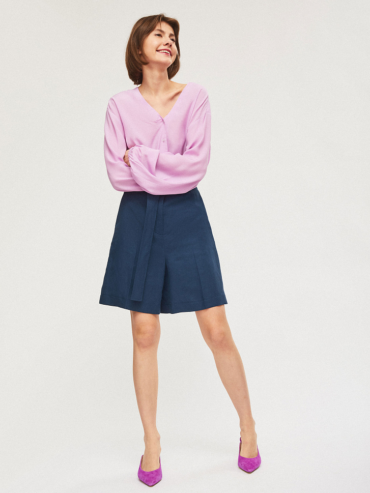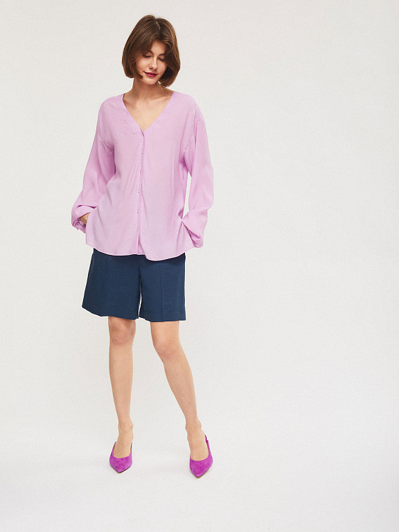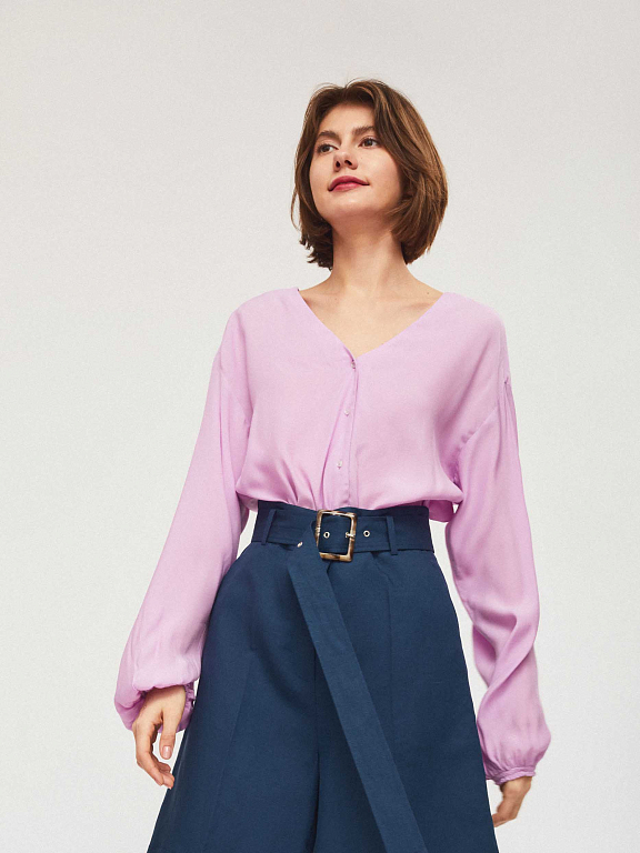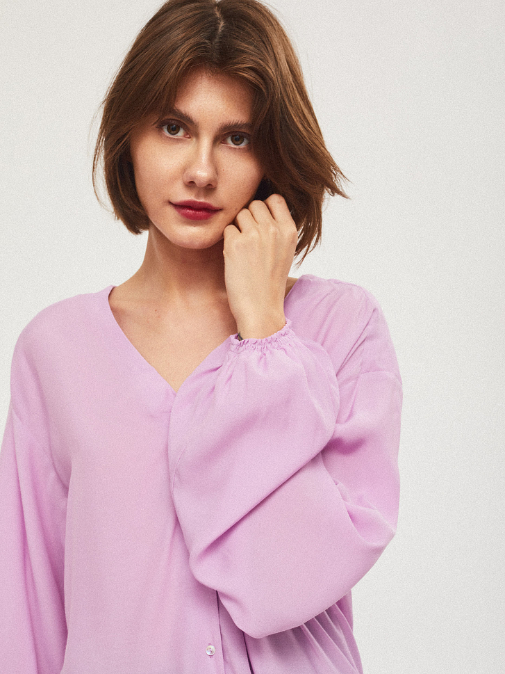 Свободная блуза с объемными рукавами, V-образным вырезом и застежкой на ряд небольших контрастных пуговиц. Закругленный низ с разрезами по бокам.