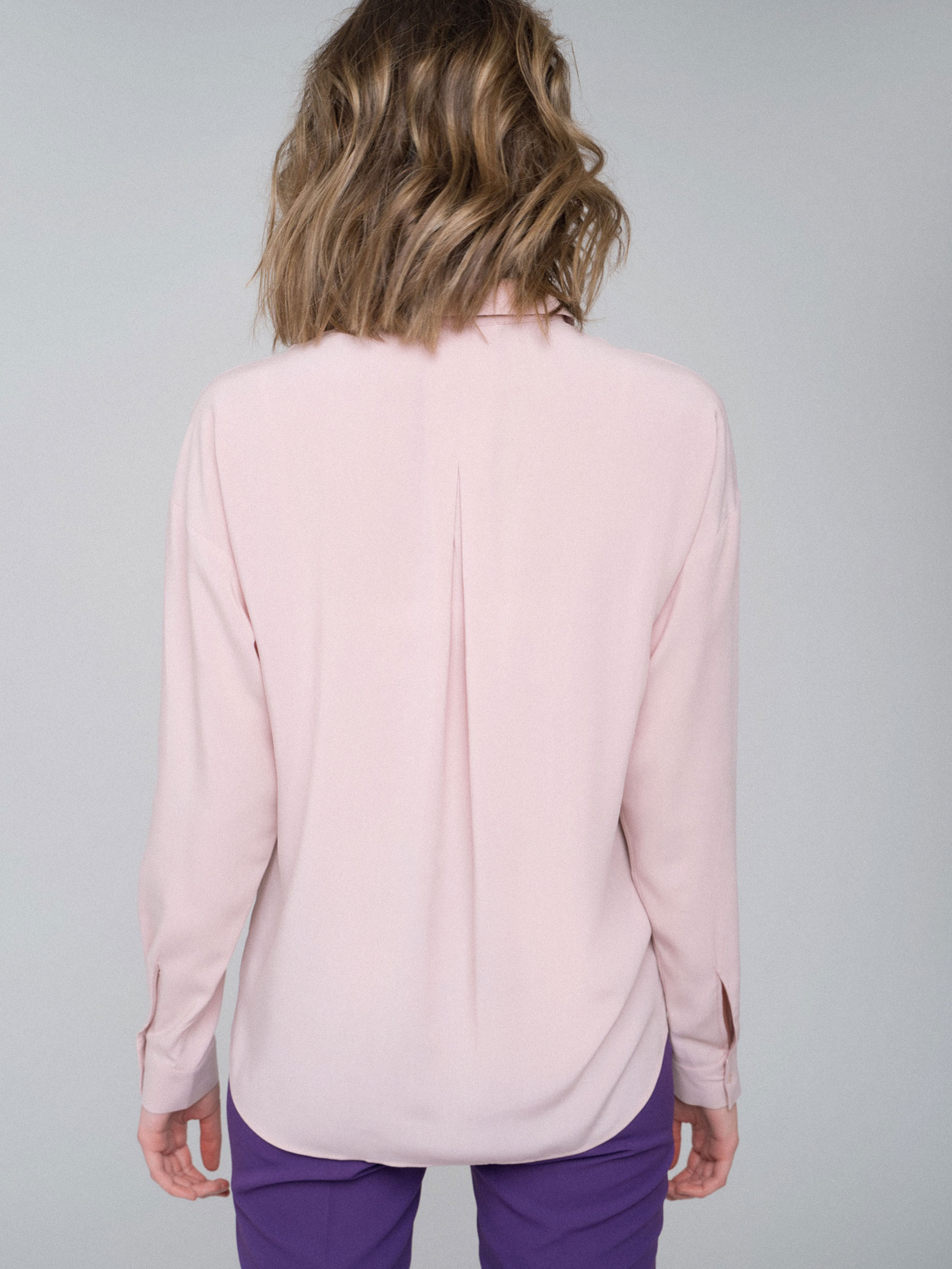 Блуза рубашечного кроя, выполненная из 100% вискозы. Классический отложной воротник, свободные рукава с потайными хлястиками, спущенная линия плеч, заложенная складка на спине, асимметричный нижний край.