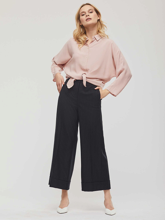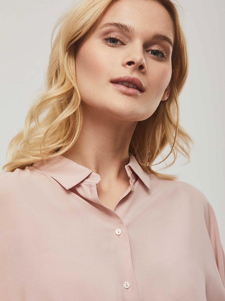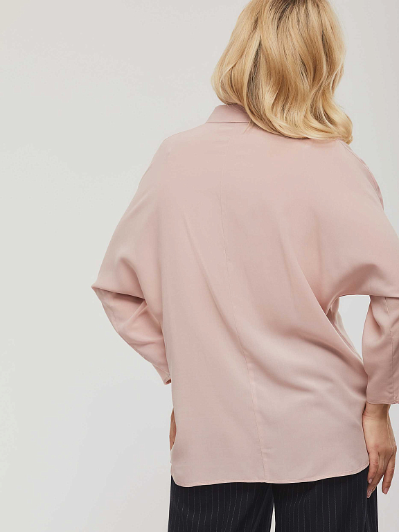 Блуза свободного силуэта с отложным воротником из вискозы. Объемные рукава длиной 3/4. Застёжка на пуговицы. Слегка удлиненная спинка. Изделие без подкладки.  Рост модели 173 см, размер 42 (российский). Плотность ткани: 119 г/м2