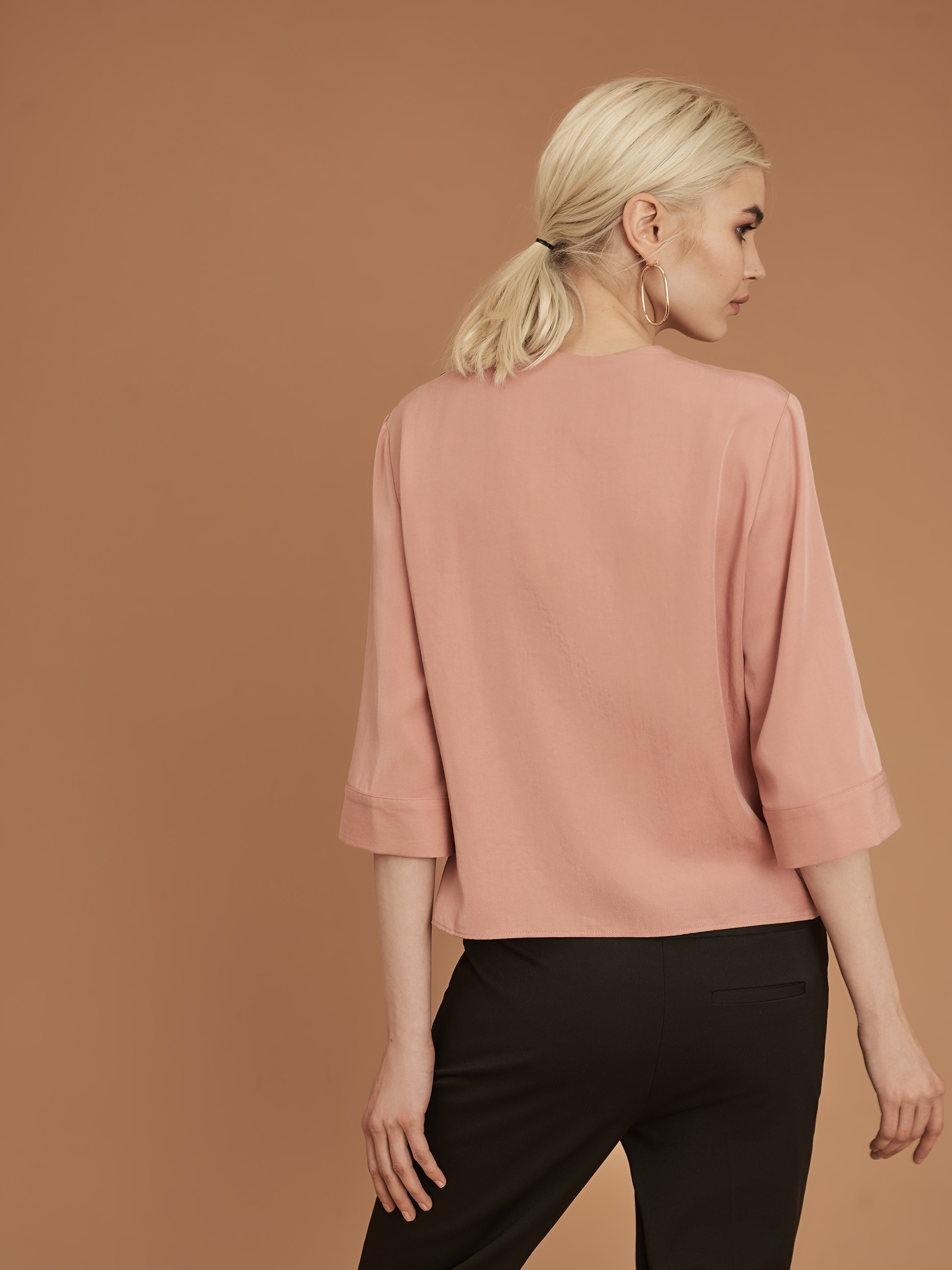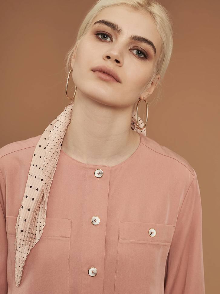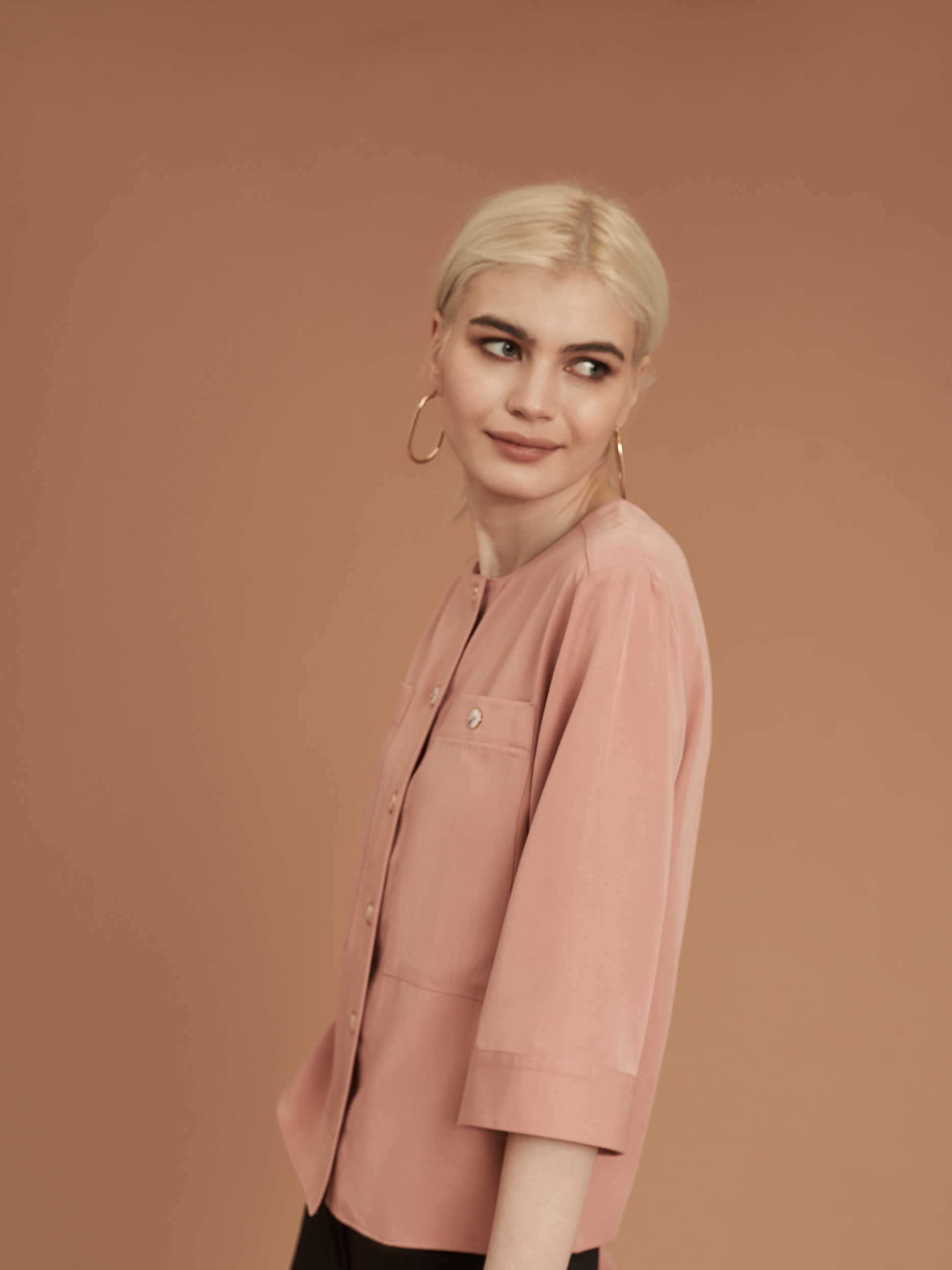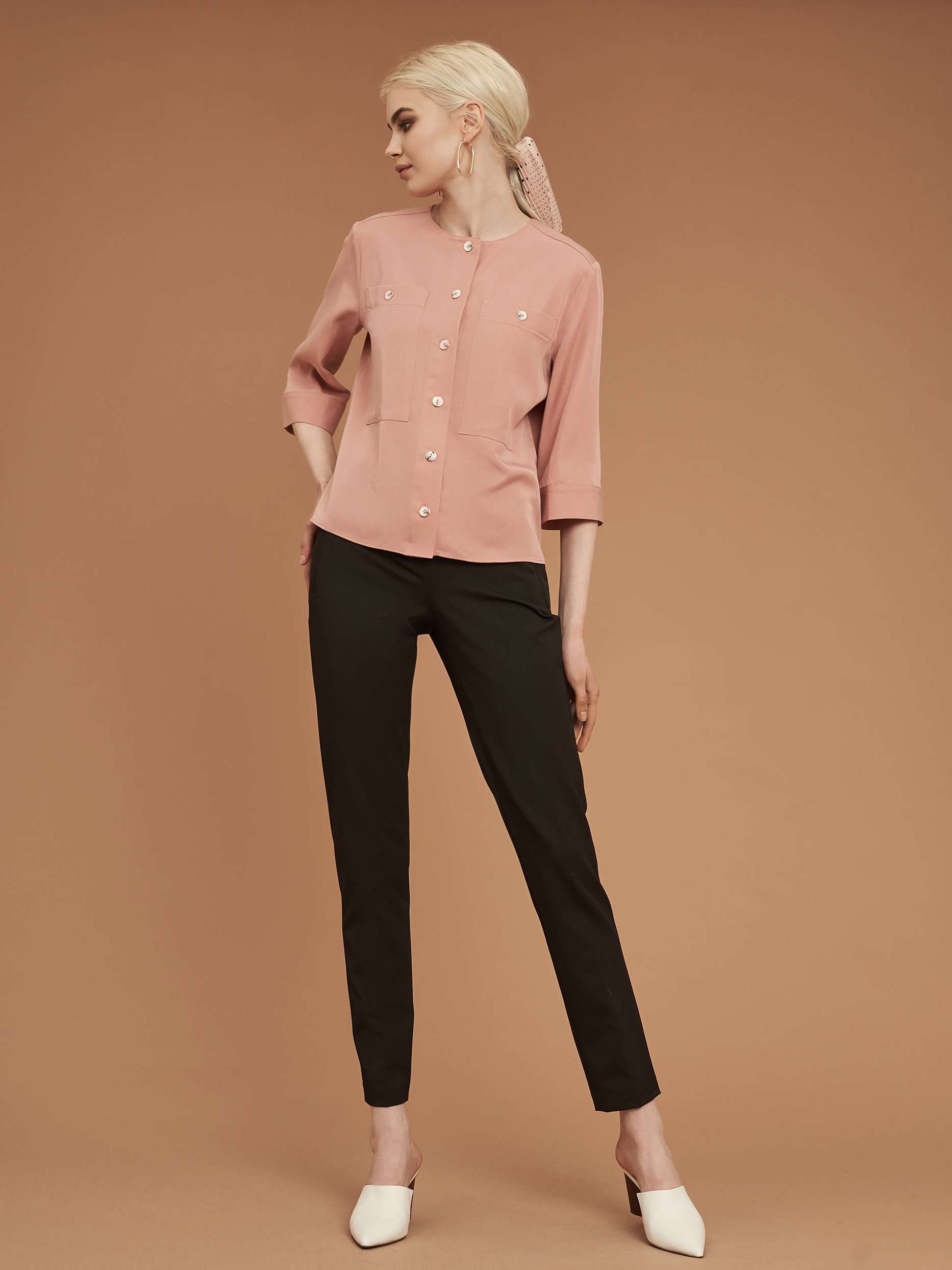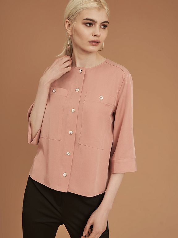 Блуза прямого кроя. Округлый вырез, рукава длины 3/4, накладные нагрудные карманы на пуговицах. Застегивается на ряд пуговиц мраморной расцветки с контрастной окантовкой.