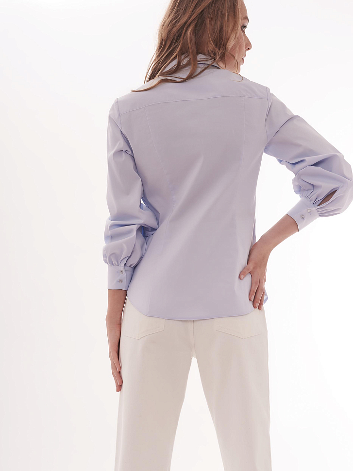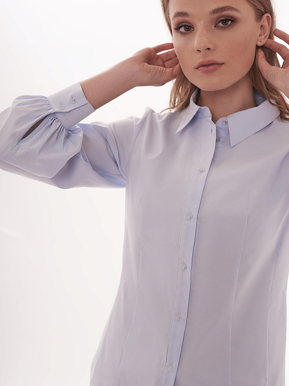 Рубашка приталенного кроя, выполненная из смесового хлопка. Классический отложной воротник, длинные объемные рукава на манжетах, закругленный нижний край. Застегивается на ряд небольших пуговиц в тон ткани.