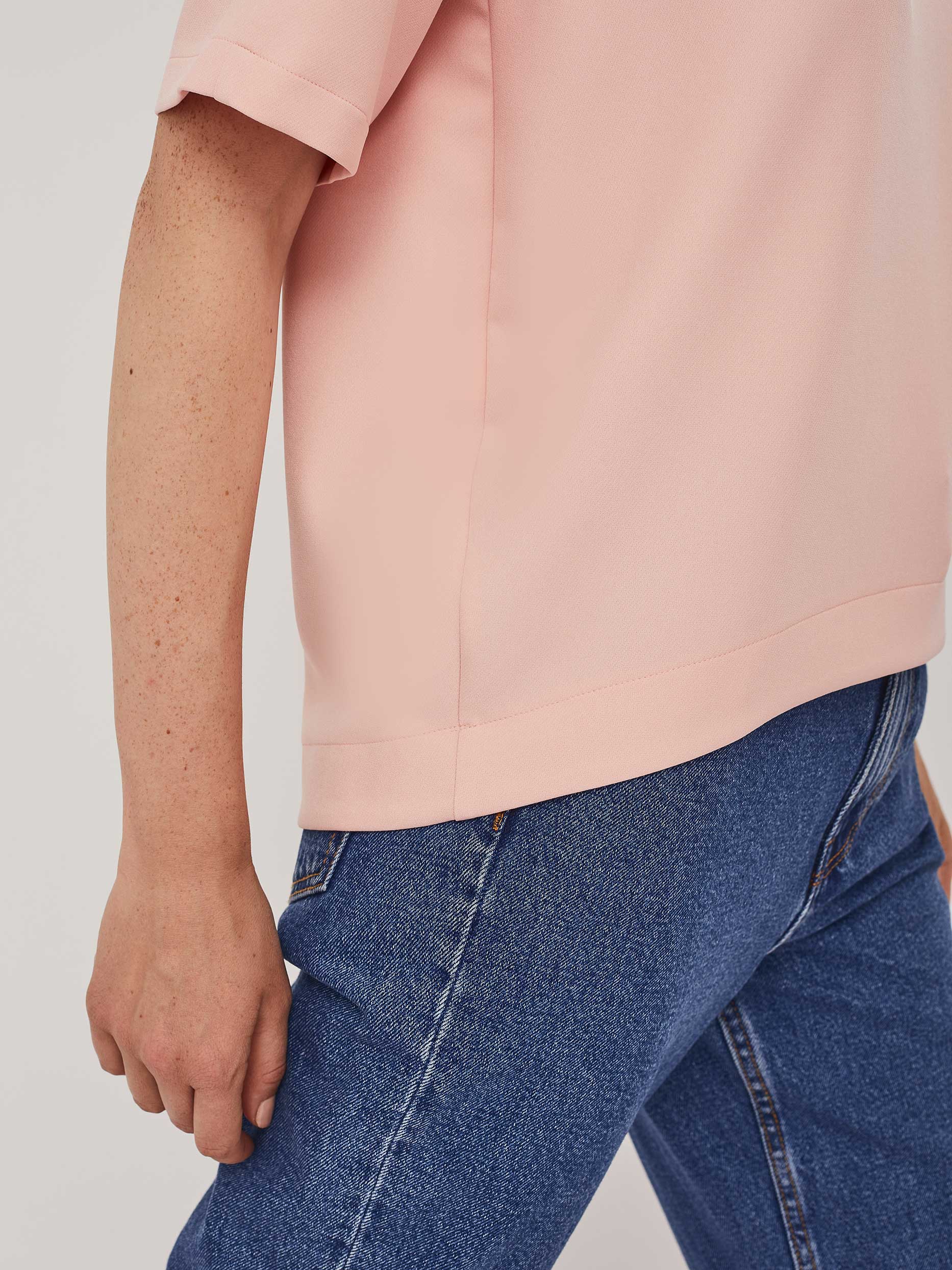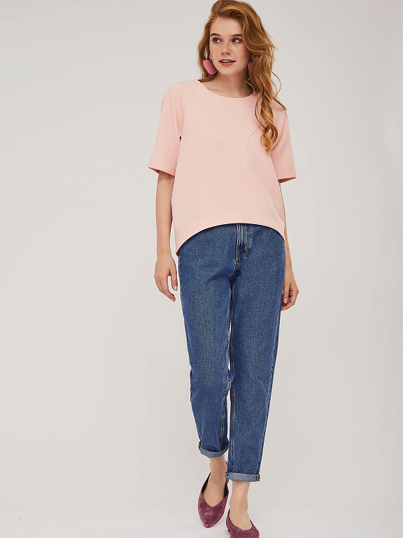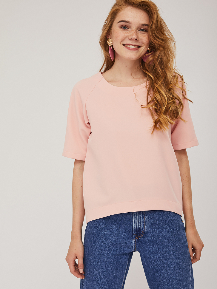 Блуза свободного силуэта с рукавами "реглан" и фигурным нижним краем. Изделие с короткими рукавами. Изделие без подкладки.  Рост модели 172 см, размер 42 (российский)