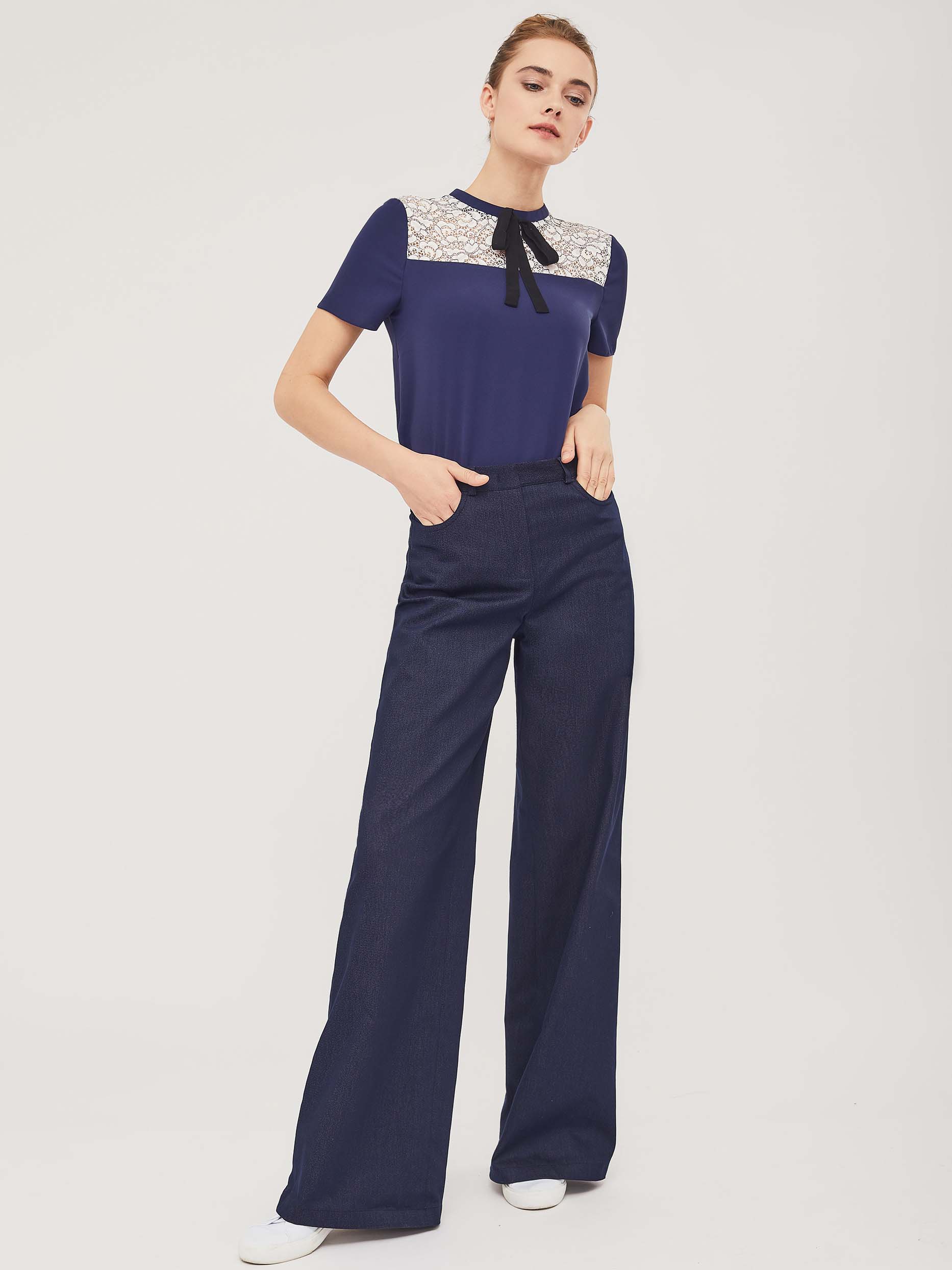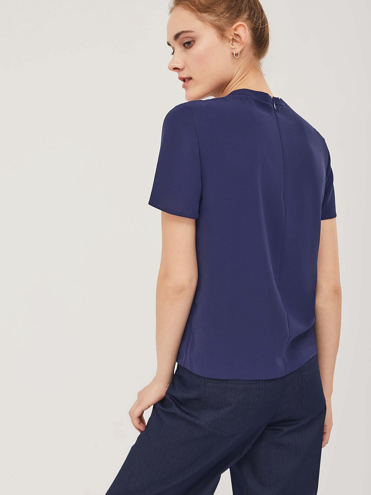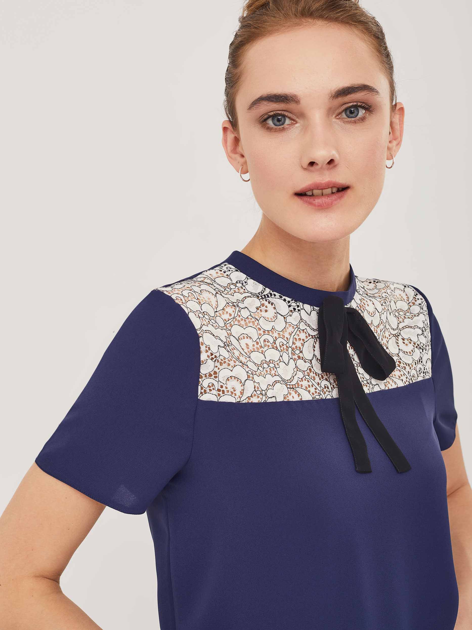 Топ прямого силуэта с кружевной кокеткой и бантом из контрастного шифона. Топ с воротником "стойка" и застёжкой на потайную молнию сзади. Изделие без подкладки.  Рост модели 175 см, размер 42 (российский). Плотность ткани: 134 г/м2