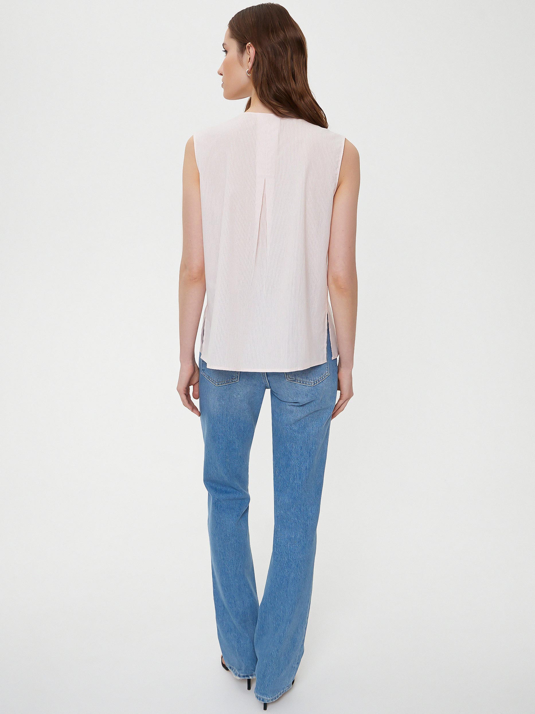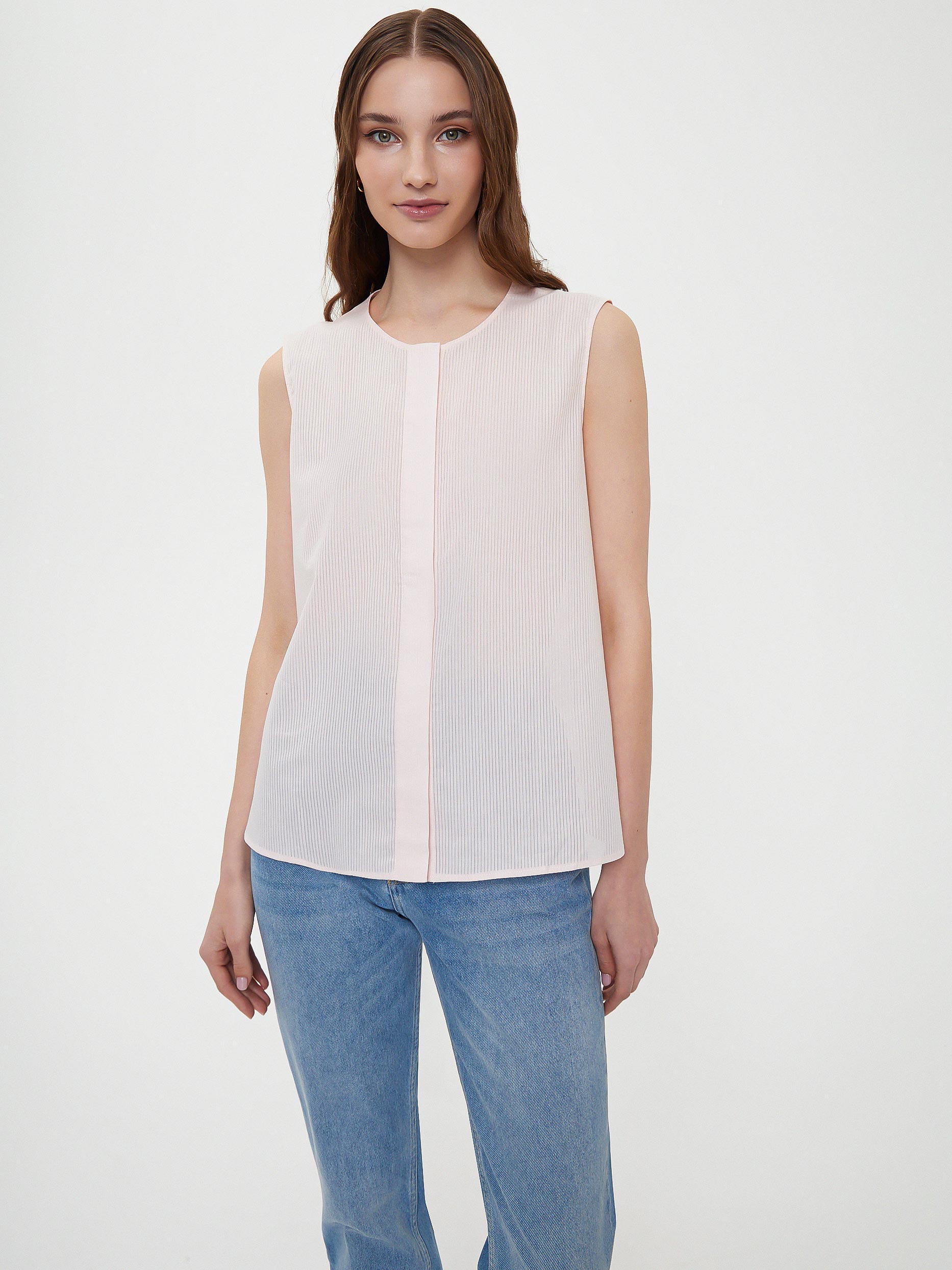 Топ в тонкую полоску, выполненный из хлопка. Свободный крой, округлый вырез, заложенная складка на спине. Застегивается на ряд пуговиц, скрытых планкой.