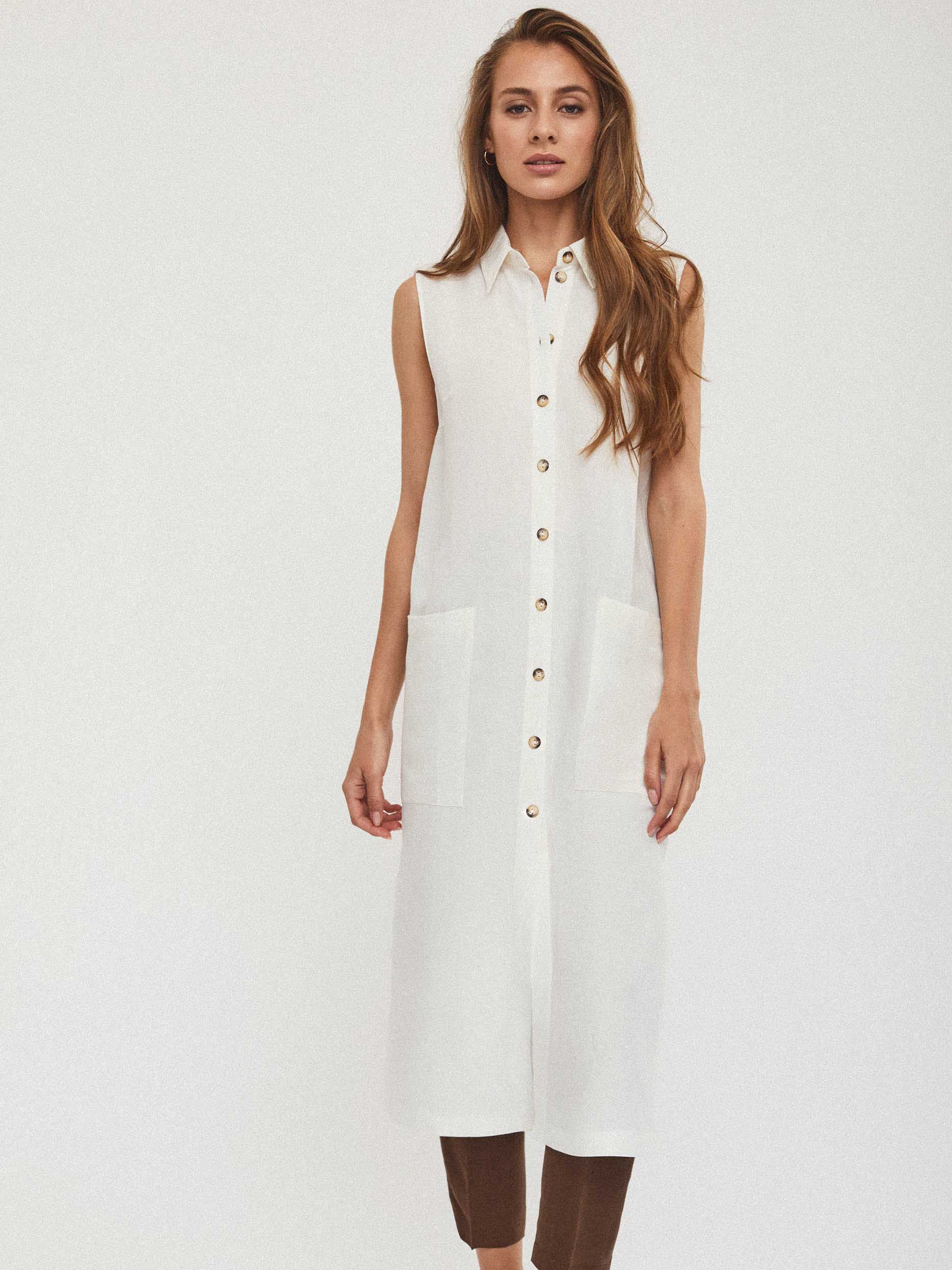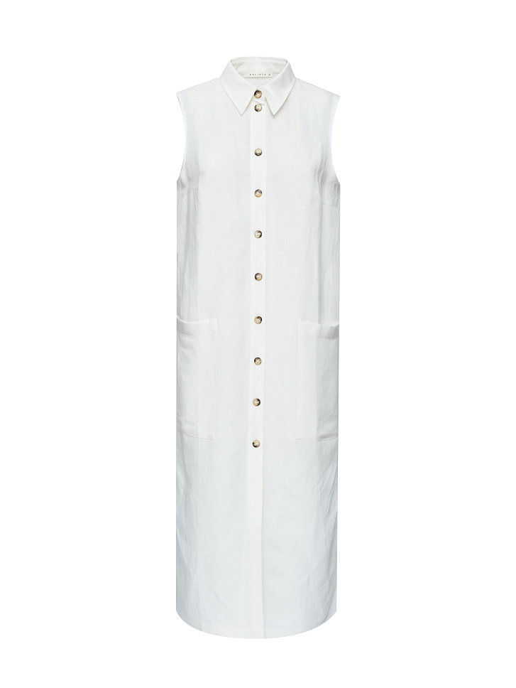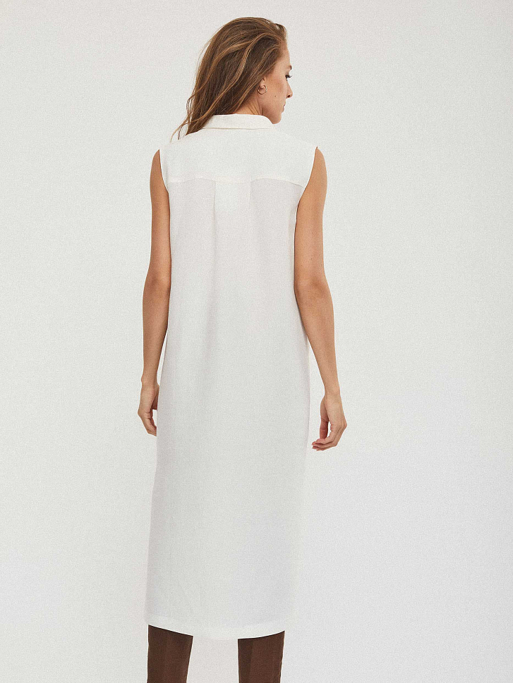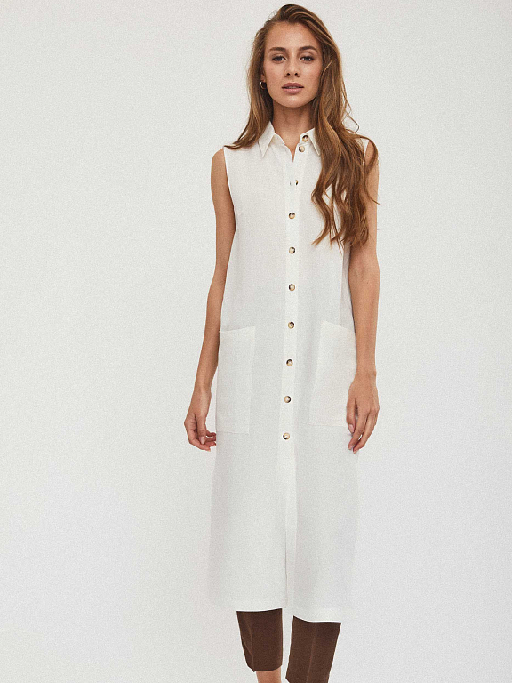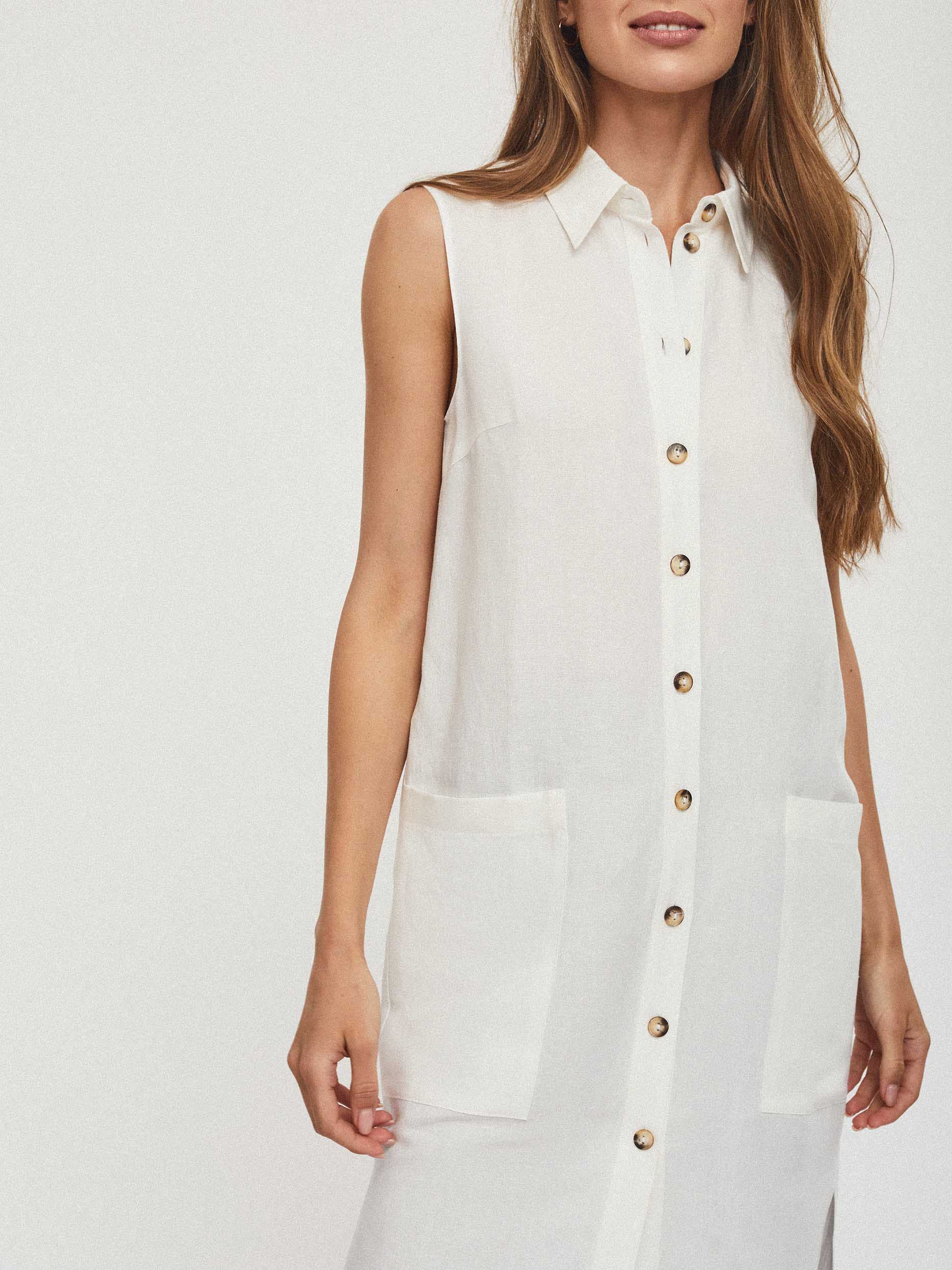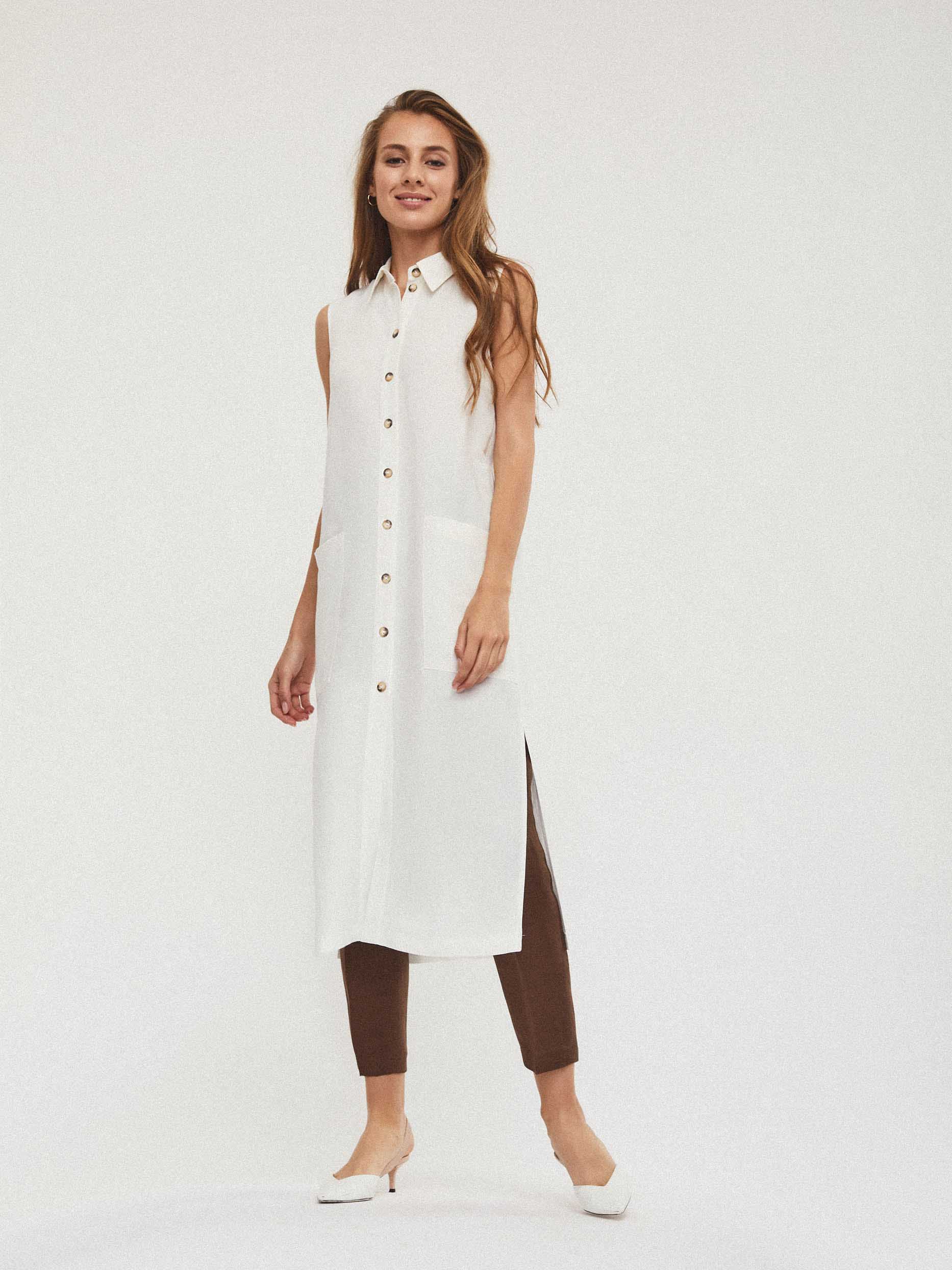 Удлиненная туника прямого силуэта из смесового льна с разрезами по бокам. Классический отложной воротник, передние накладные карманы и застежка на ряд контрастных пуговиц.