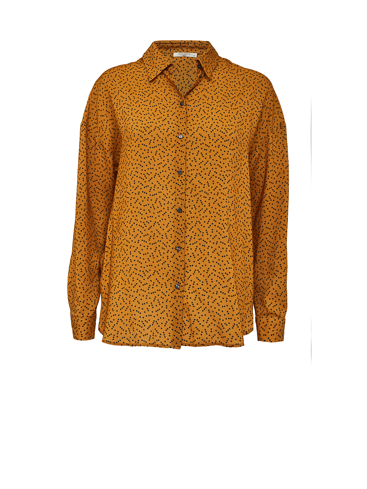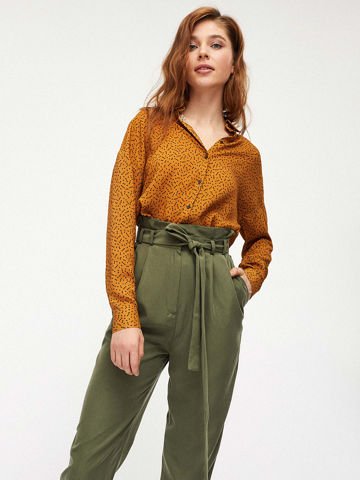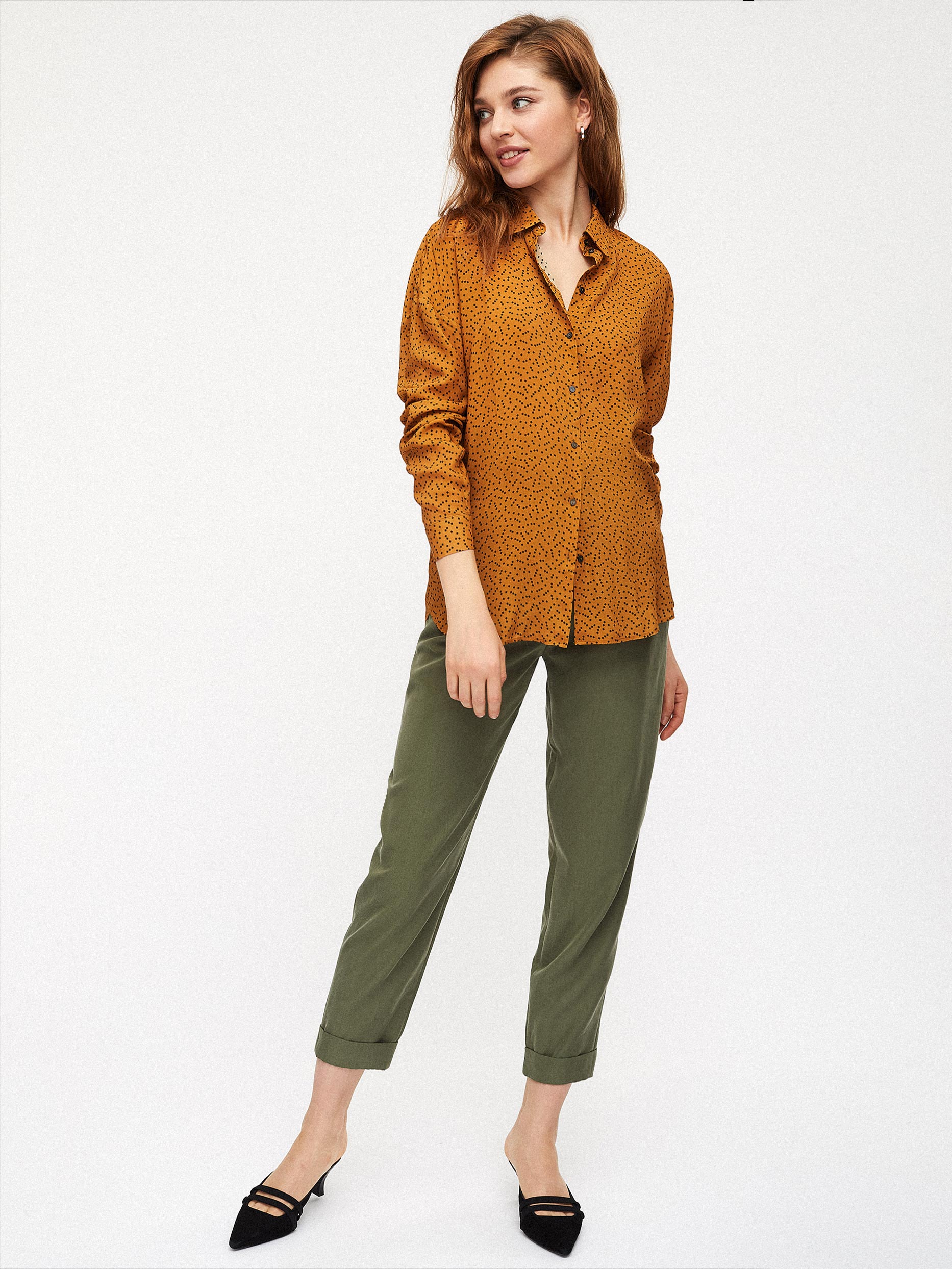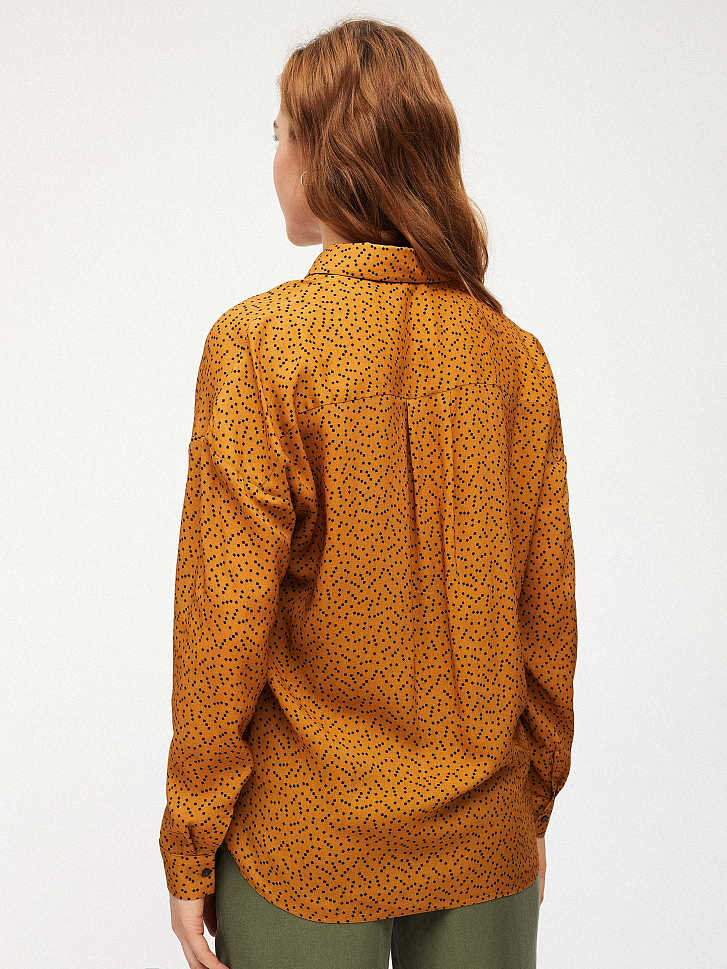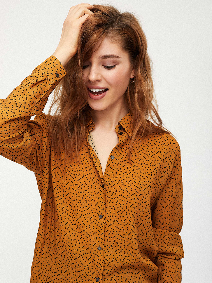 Свободная блуза рубашечного кроя, выполненная из 100% вискозы. Длинные рукава с манжетами на пуговицах, классический отложной воротник. Застегивается на ряд контрастных пуговиц.