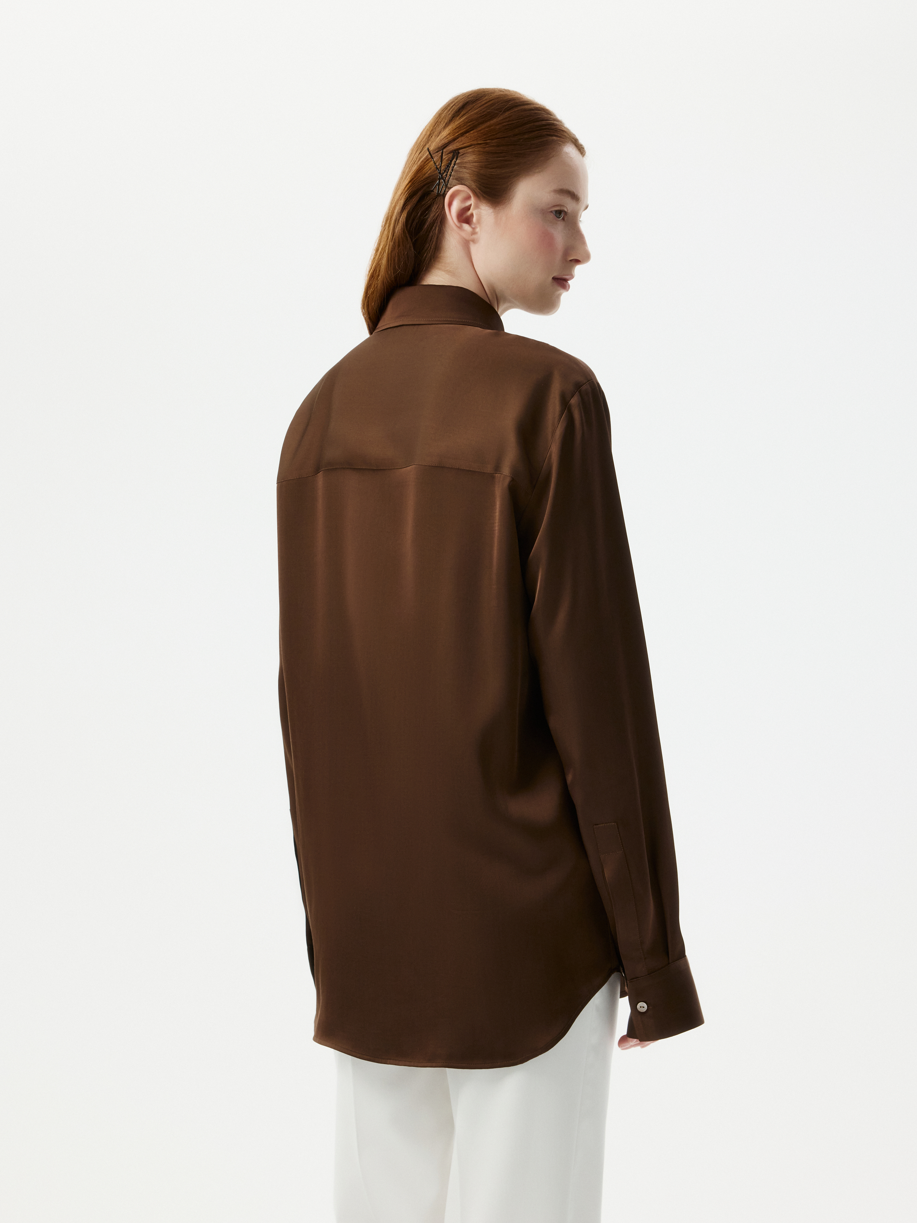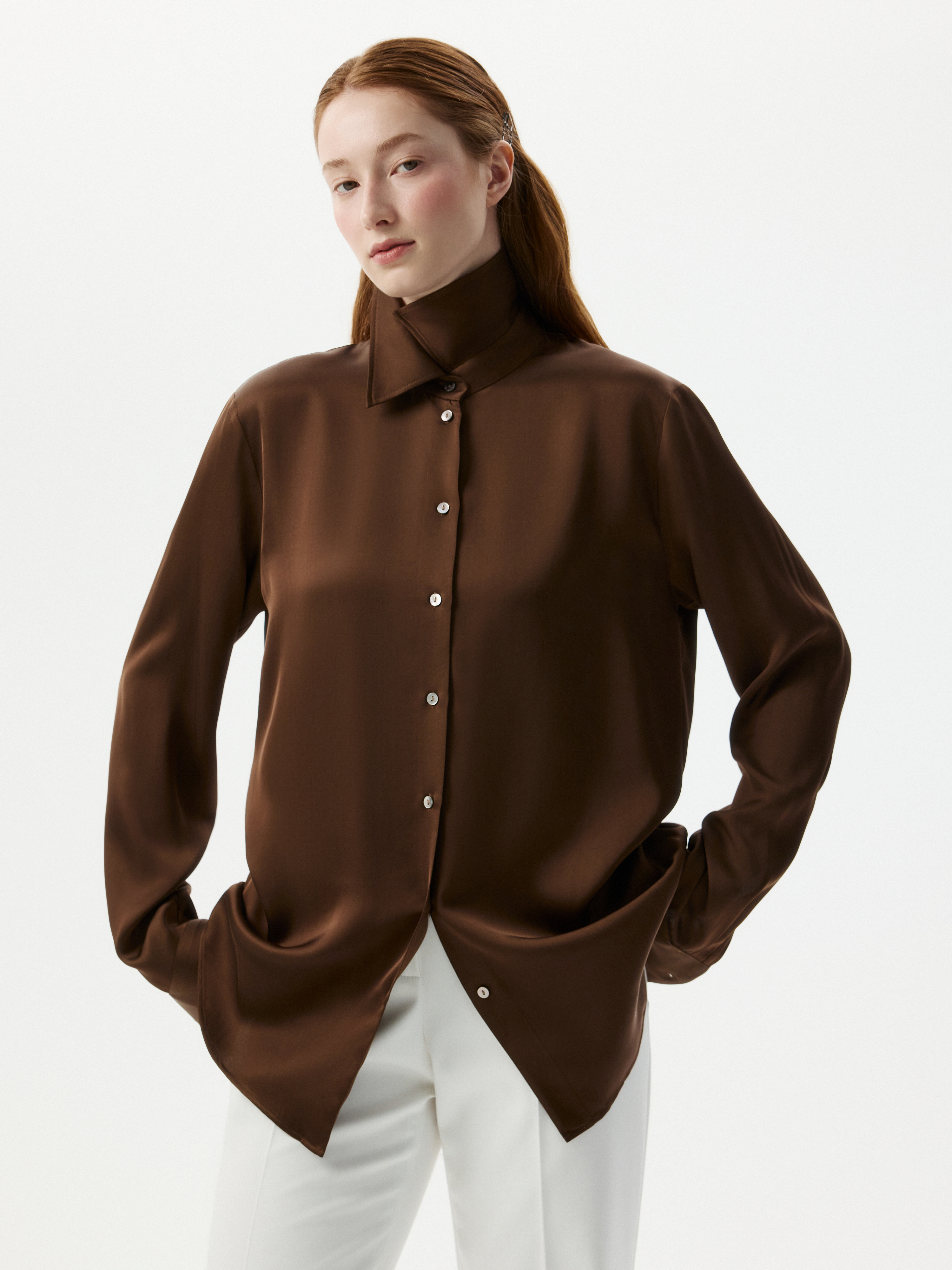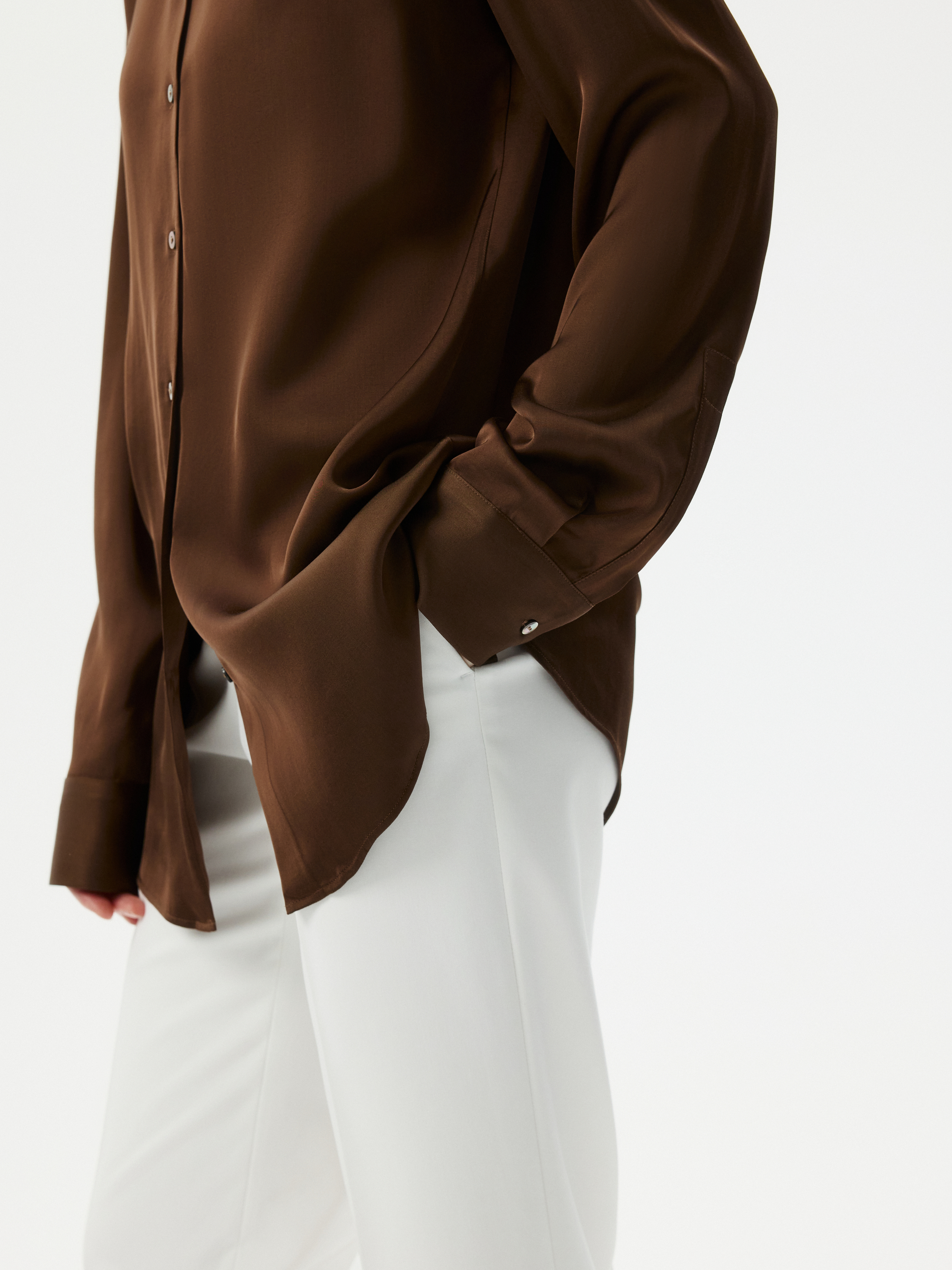 Атласная блуза создает ощущение утонченного и безупречного вкуса. Легкий шелковистый текстиль приятно струится вдоль тела и не просвечивает. В зависимости от настроения, дополните блузу джинсами или комплектными брюками.