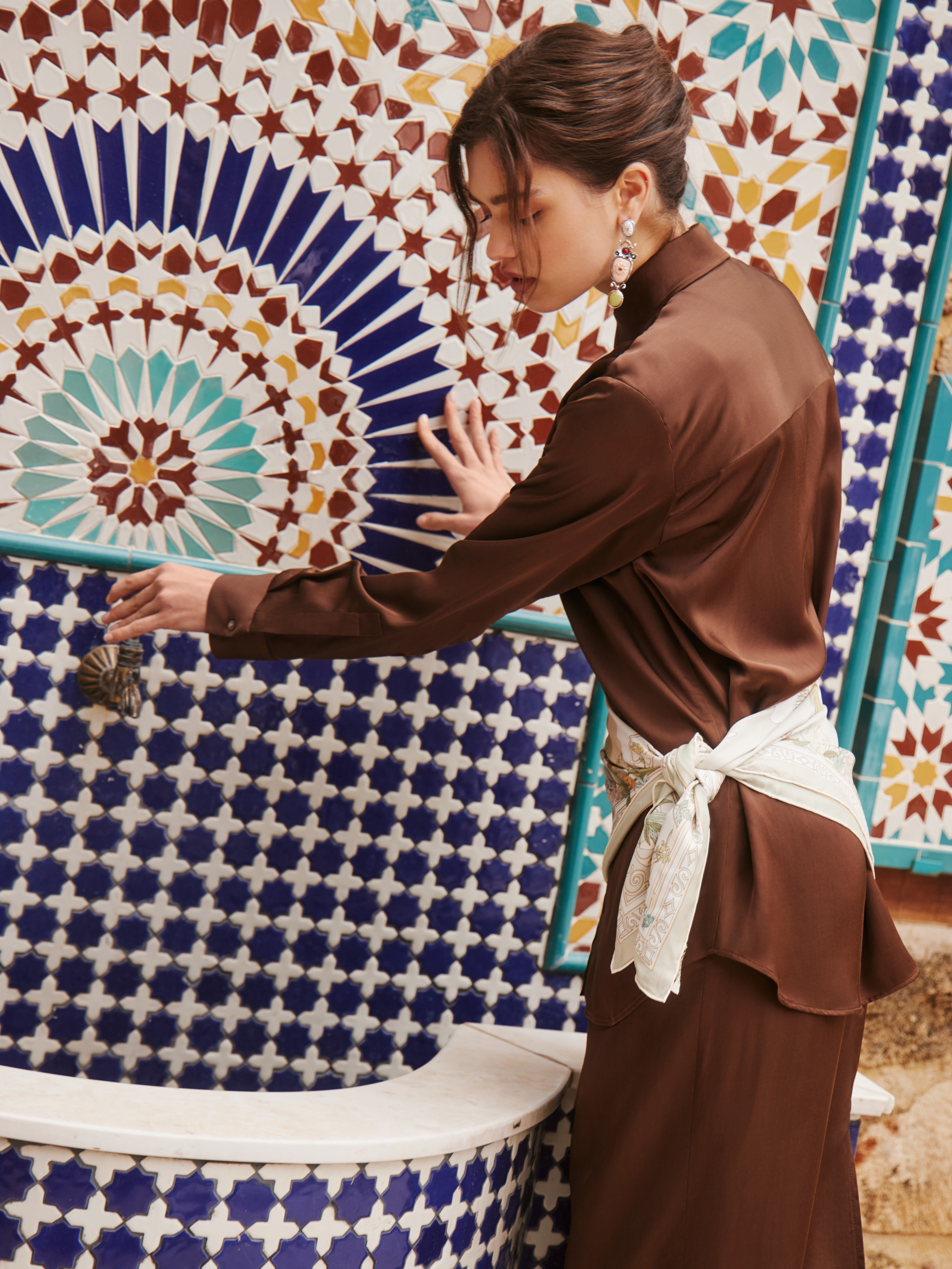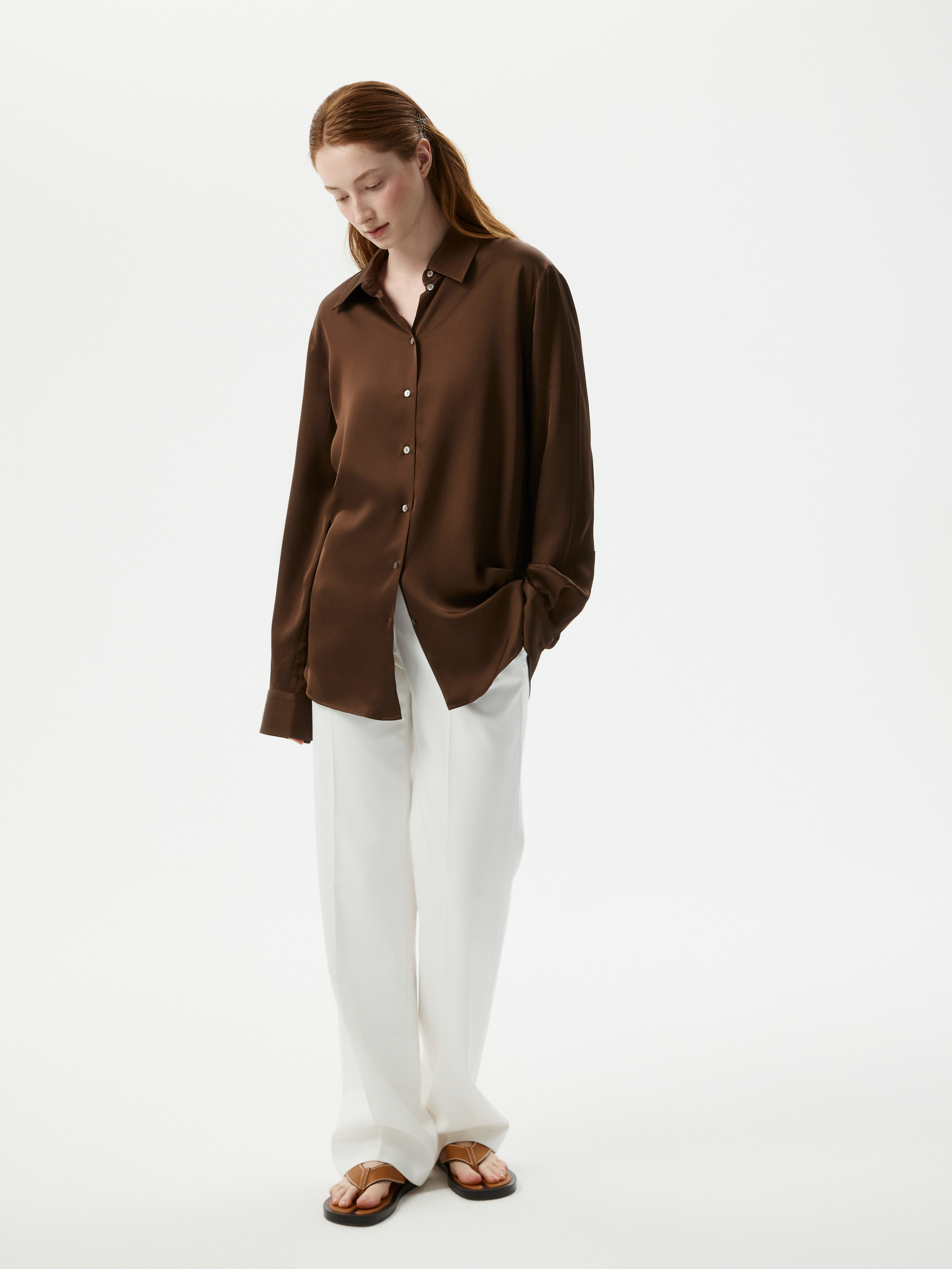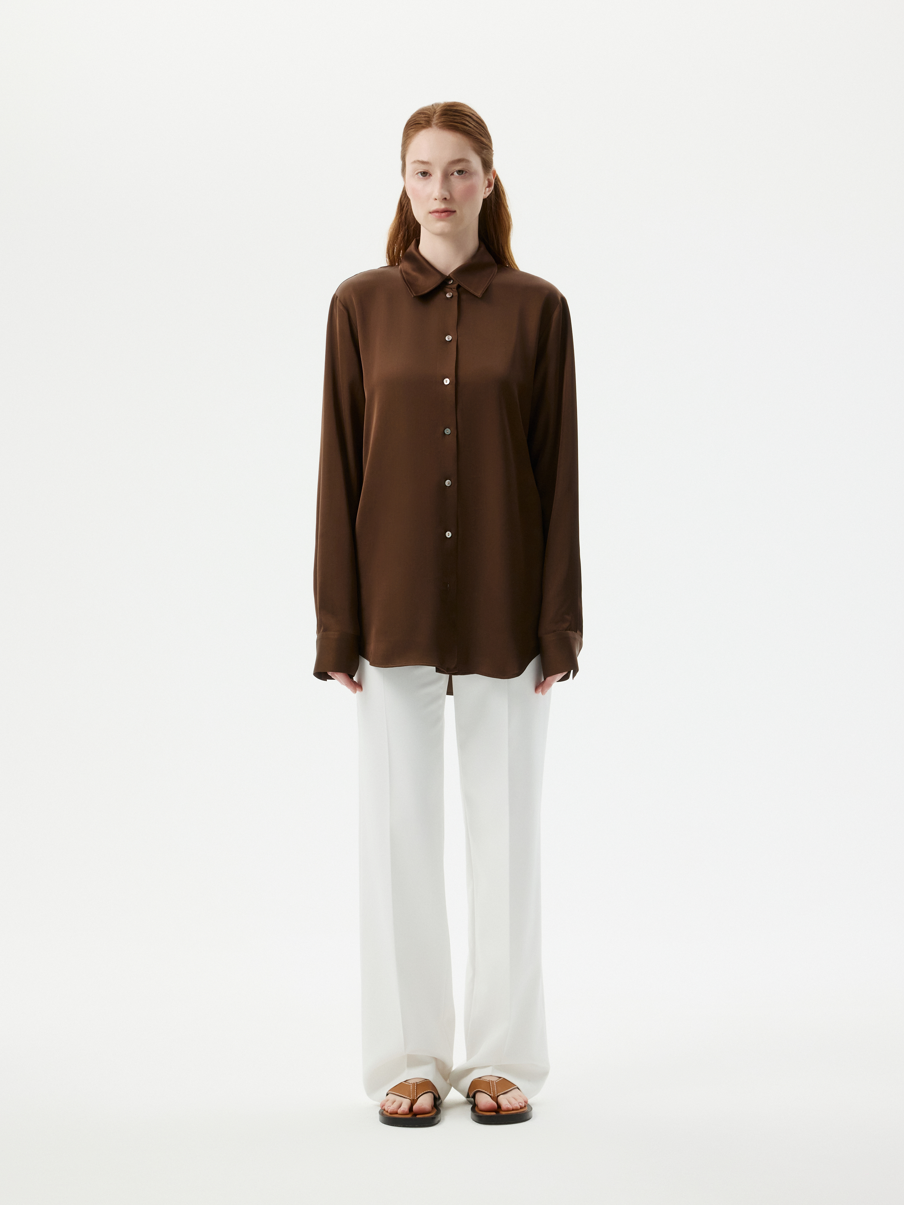 Атласная блуза создает ощущение утонченного и безупречного вкуса. Легкий шелковистый текстиль приятно струится вдоль тела и не просвечивает. В зависимости от настроения, дополните блузу джинсами или комплектными брюками.
