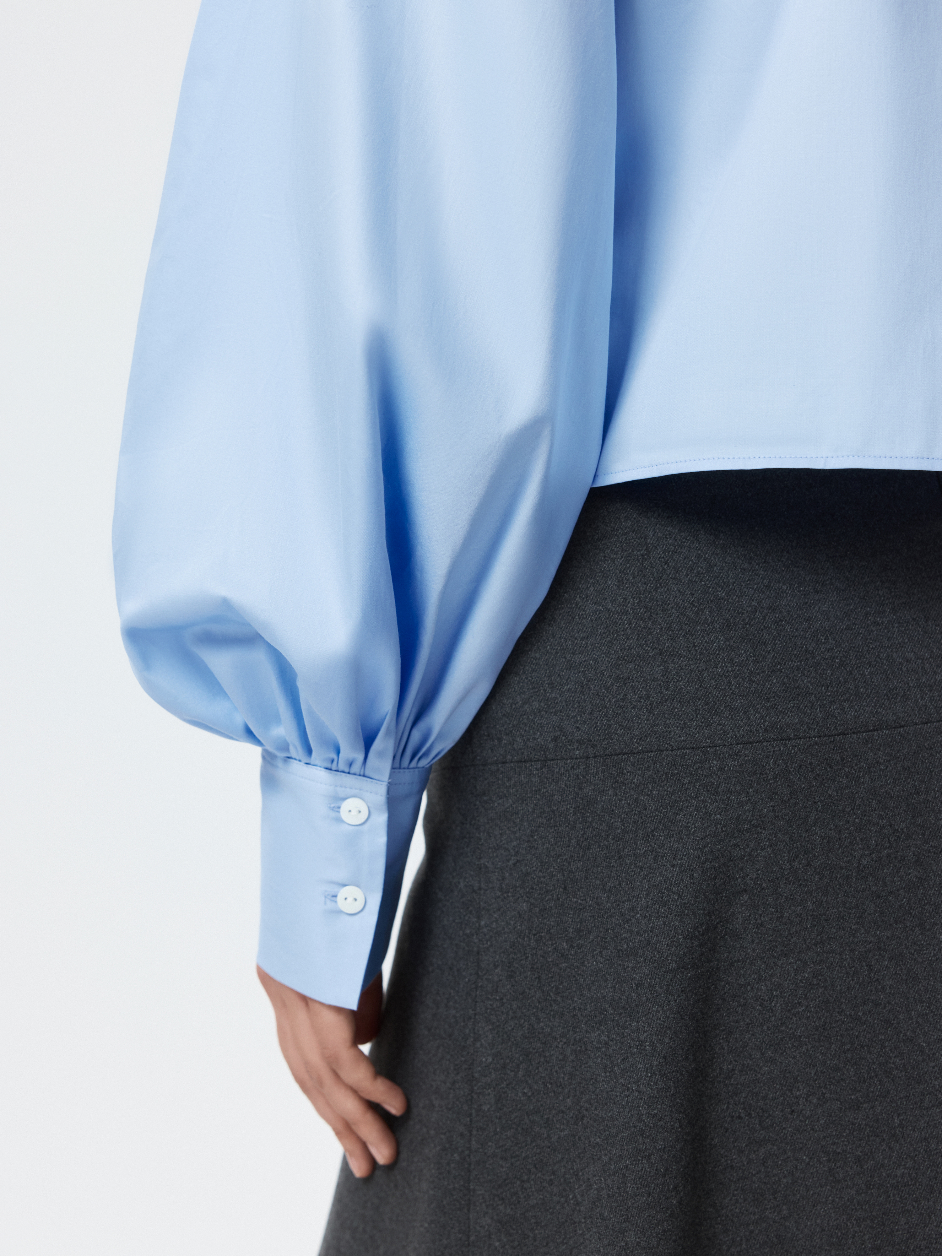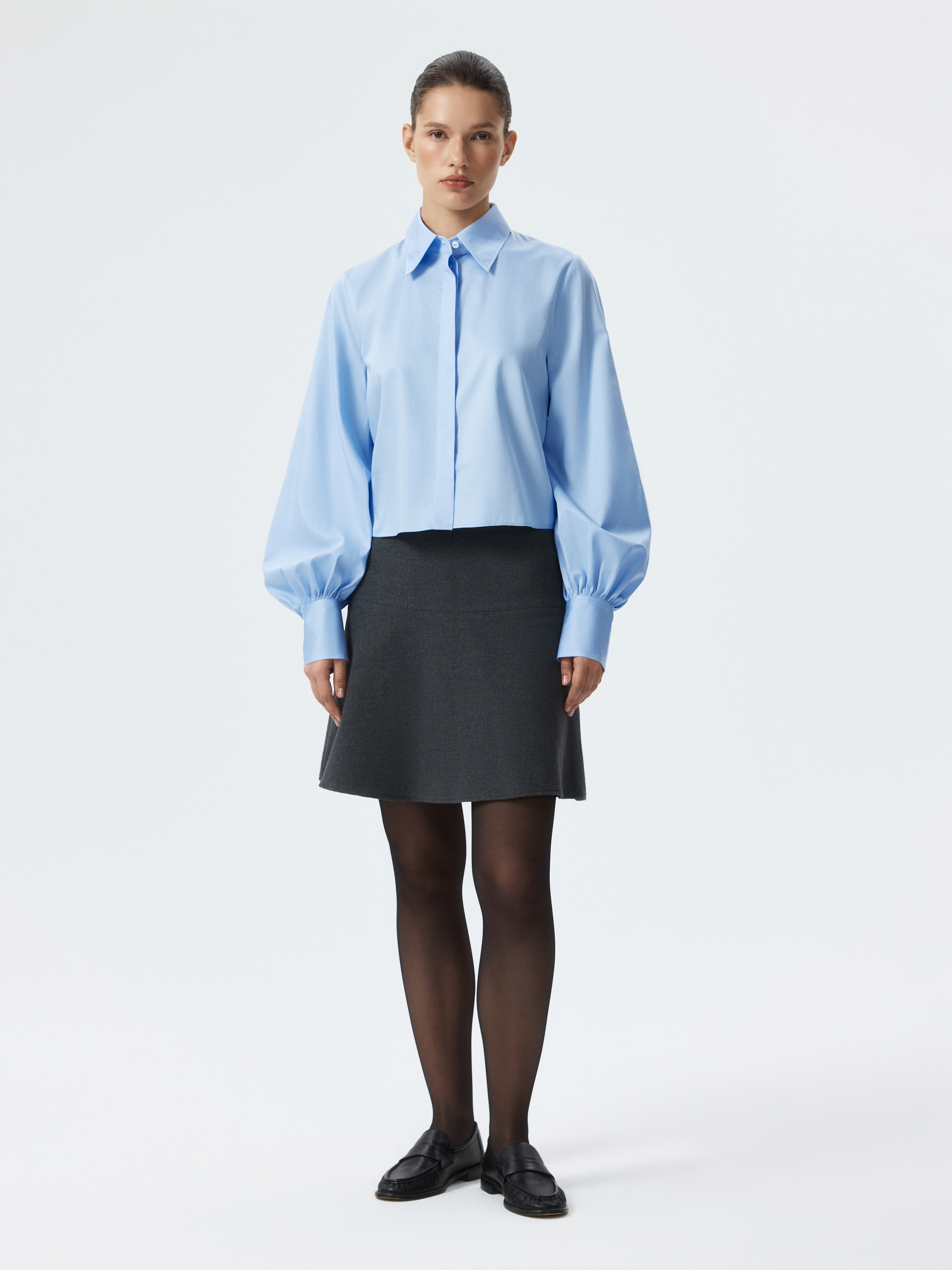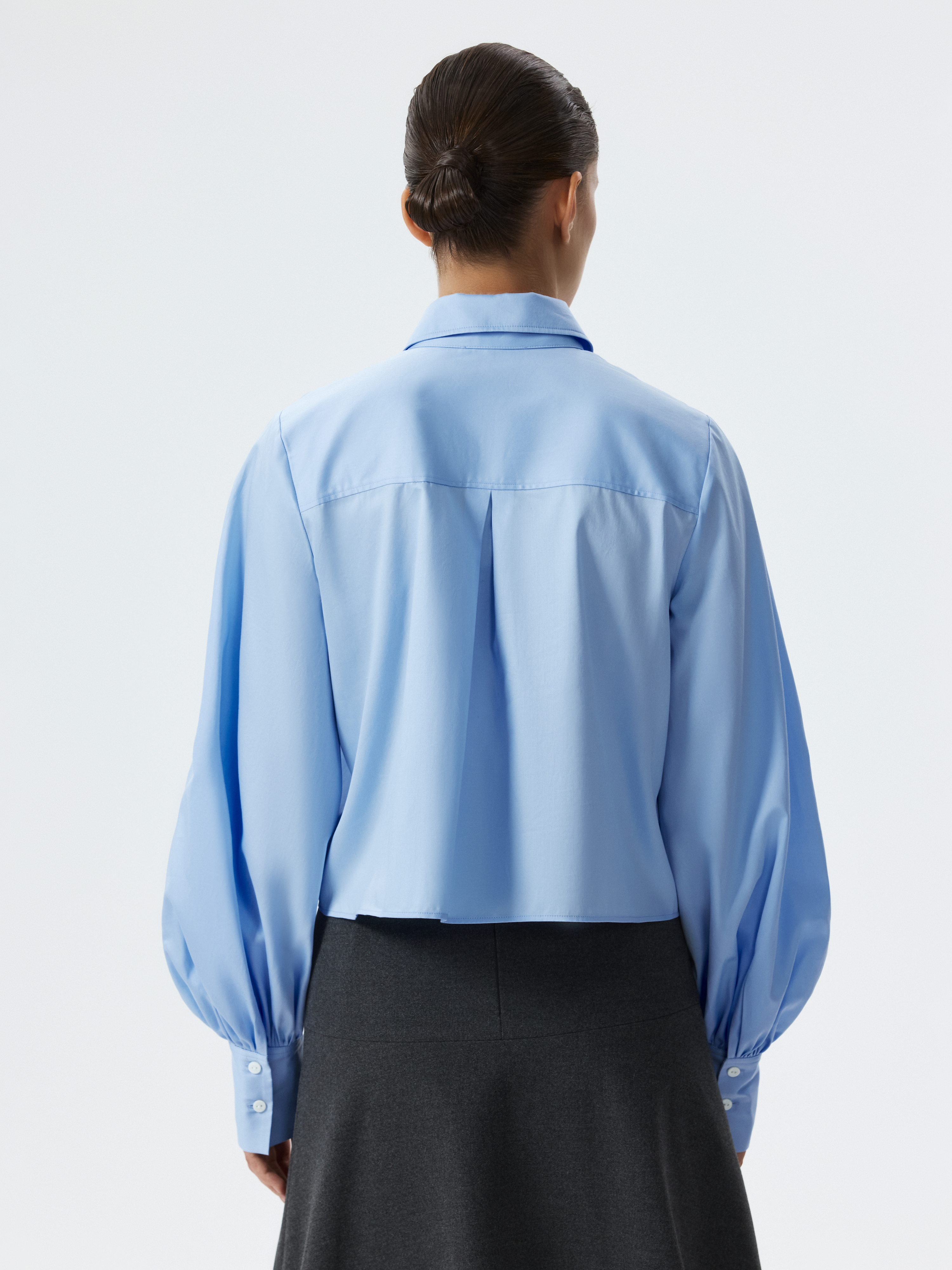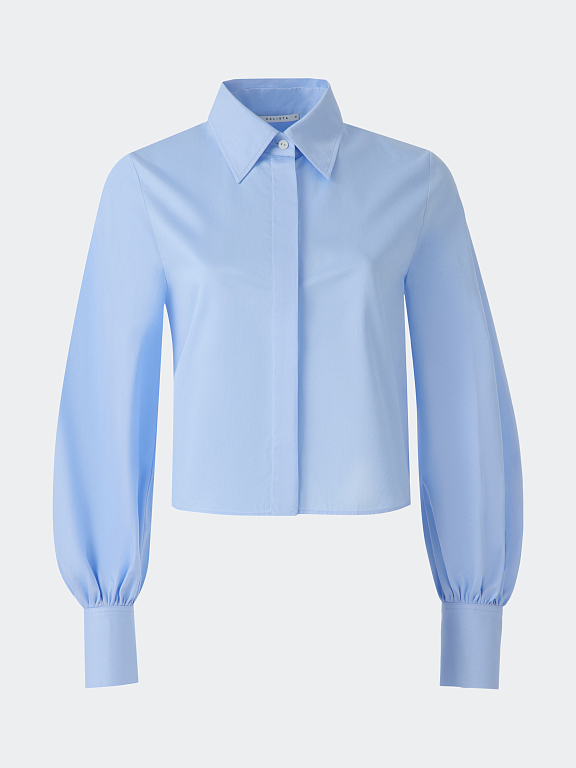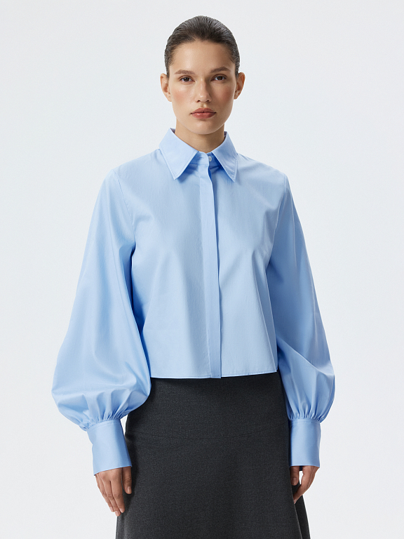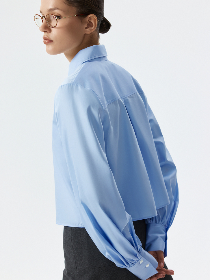 Укороченная рубашка с пышными рукавами – женственная интерпретация строгой классики. Хлопковый текстиль с шелковистой на ощупь фактурой приятно прилегает к телу и хорошо пропускает воздух, обеспечивая комфорт в течении дня. Сочетайте изделие с брюками и юбками на высокой посадке.