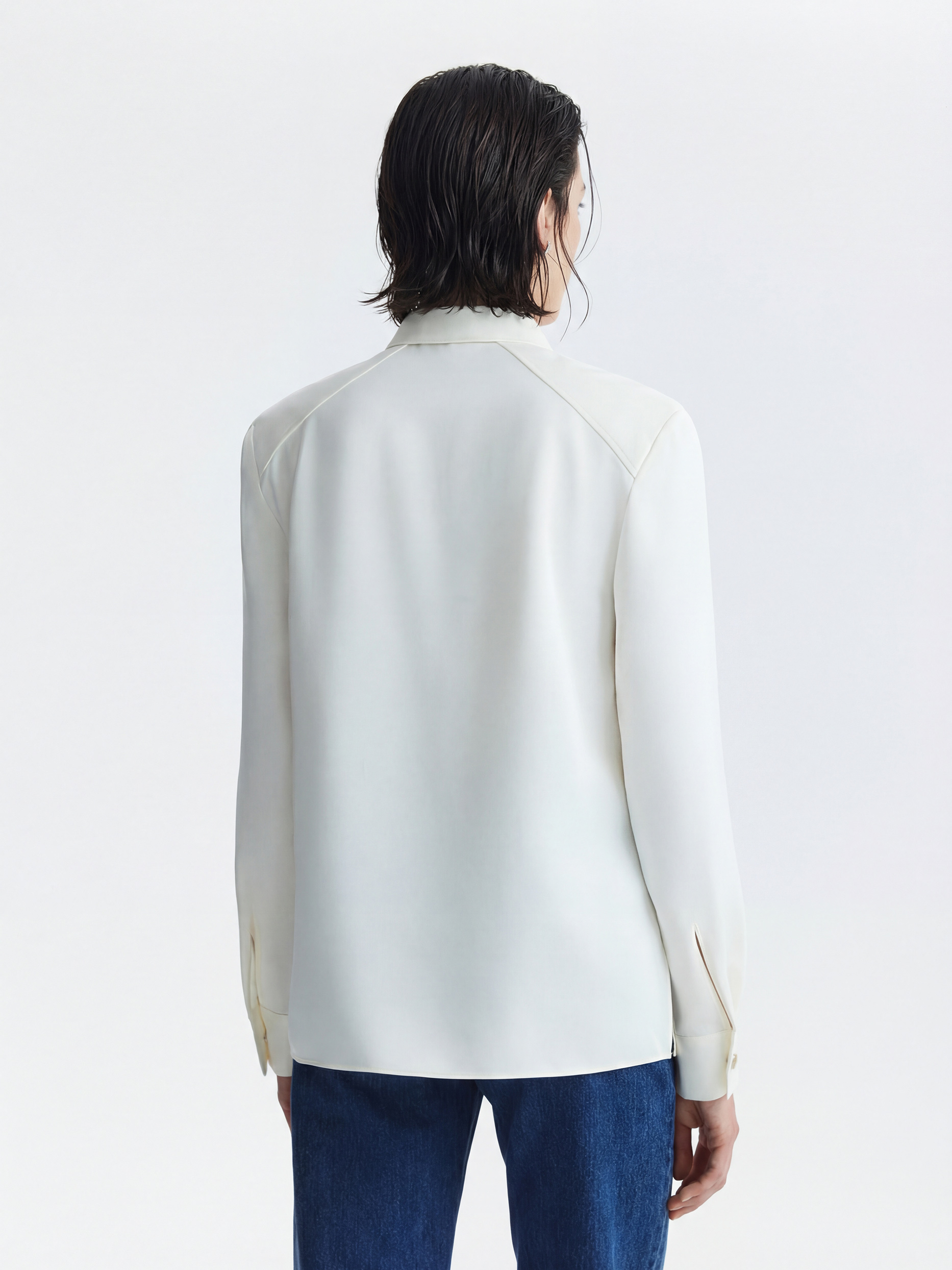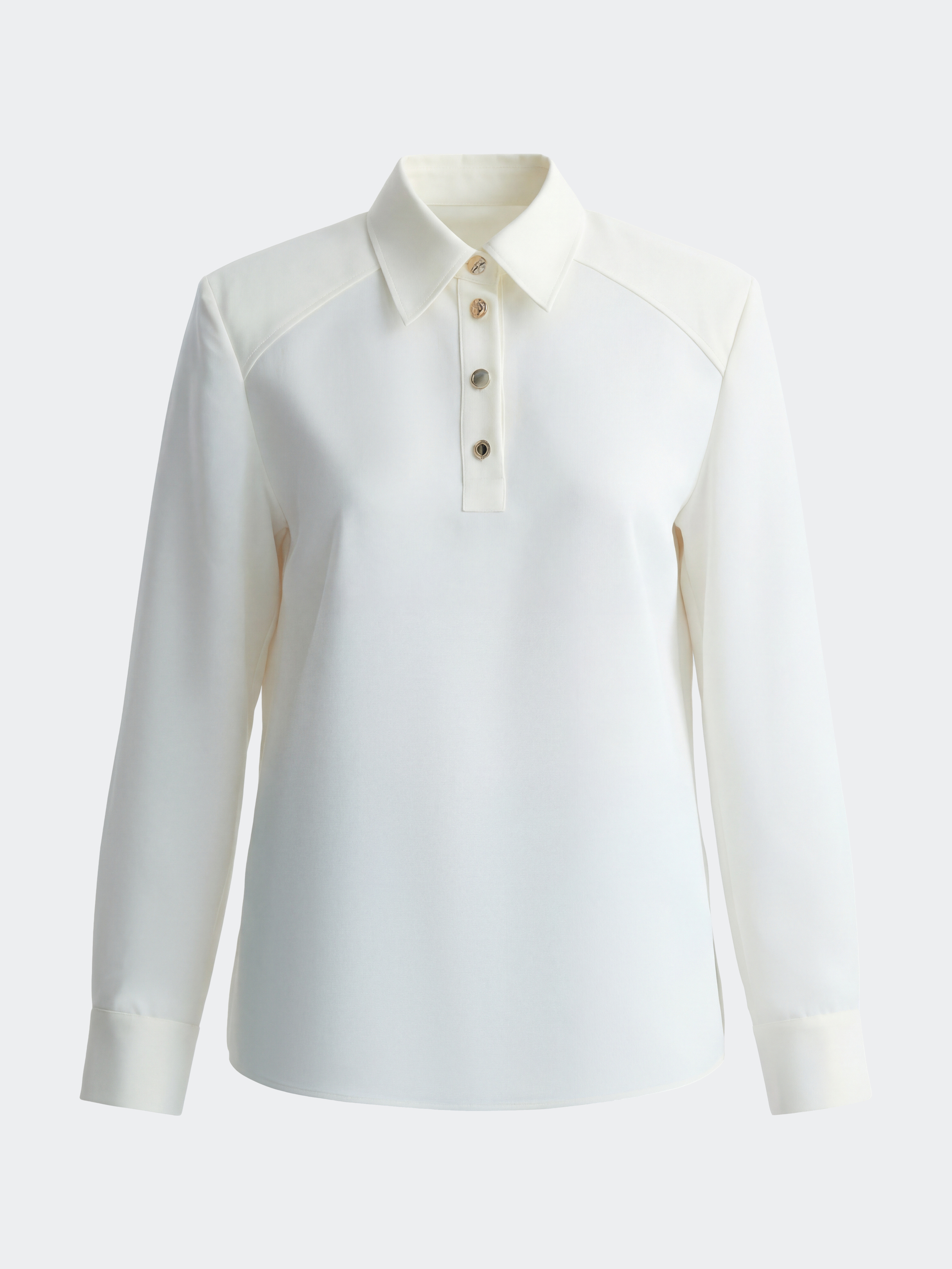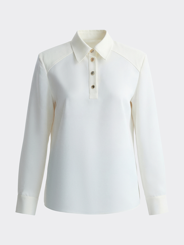 Атласная блуза с воротником-поло сочетает в себе классический минимализм и эстетику спорт-шик. Гладкий шелковистый текстиль с приятной на ощупь фактурой струится вдоль тела и не просвечивает. Блуза имеет четкий силуэт за счет подплечников, а металлические пуговицы играют роль акцентов.