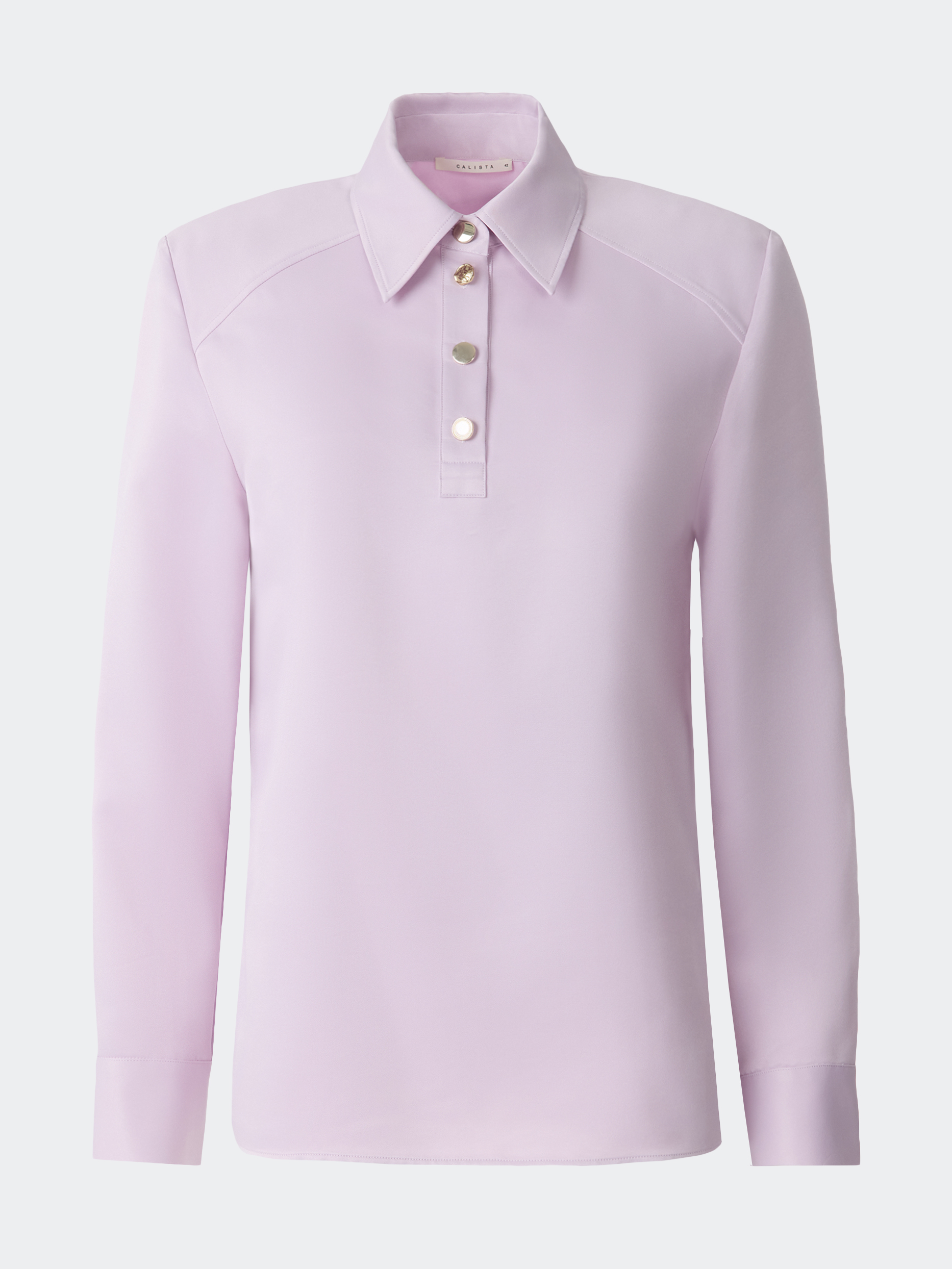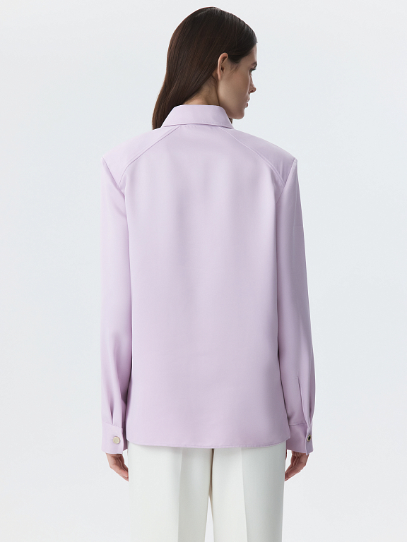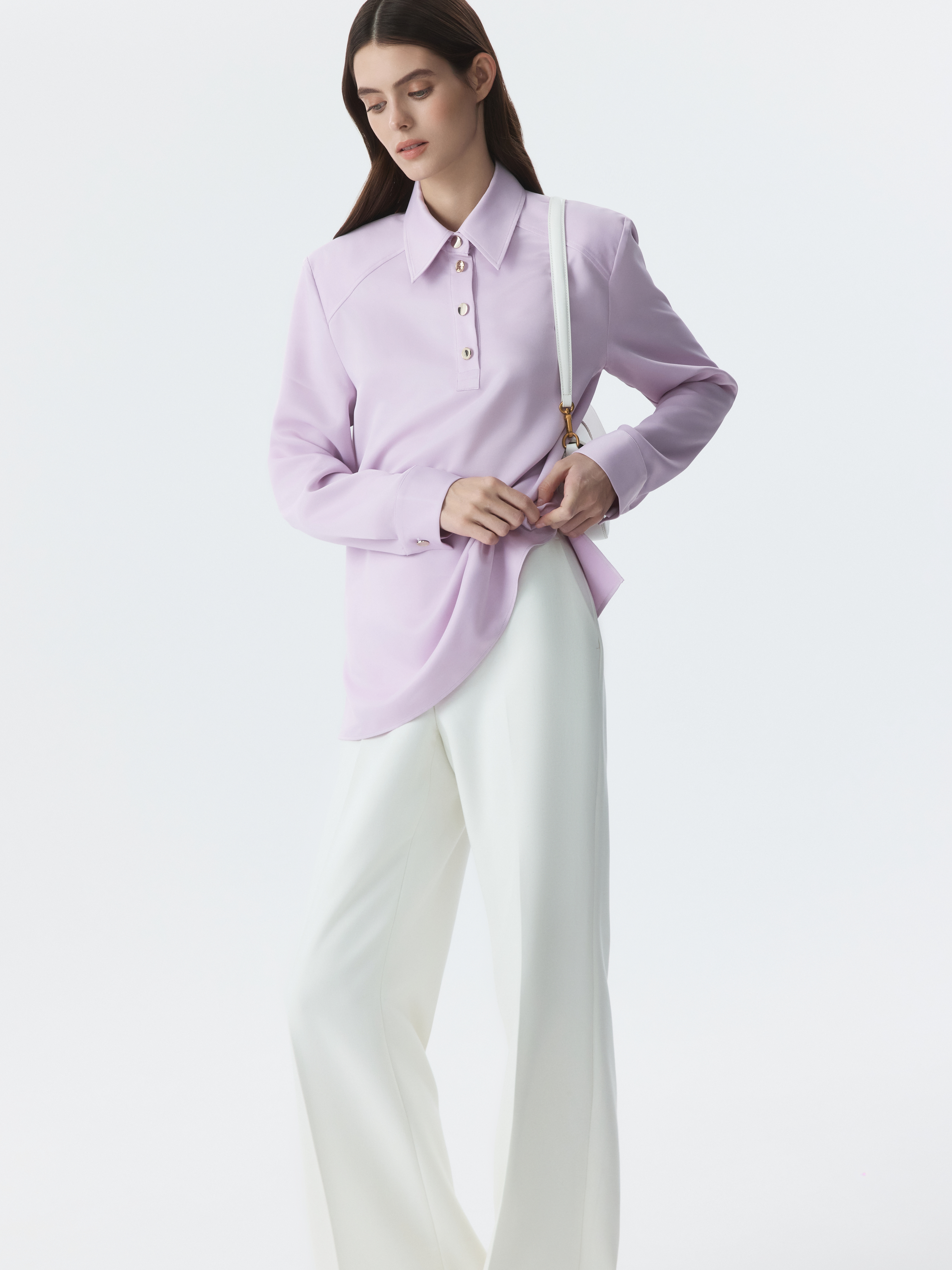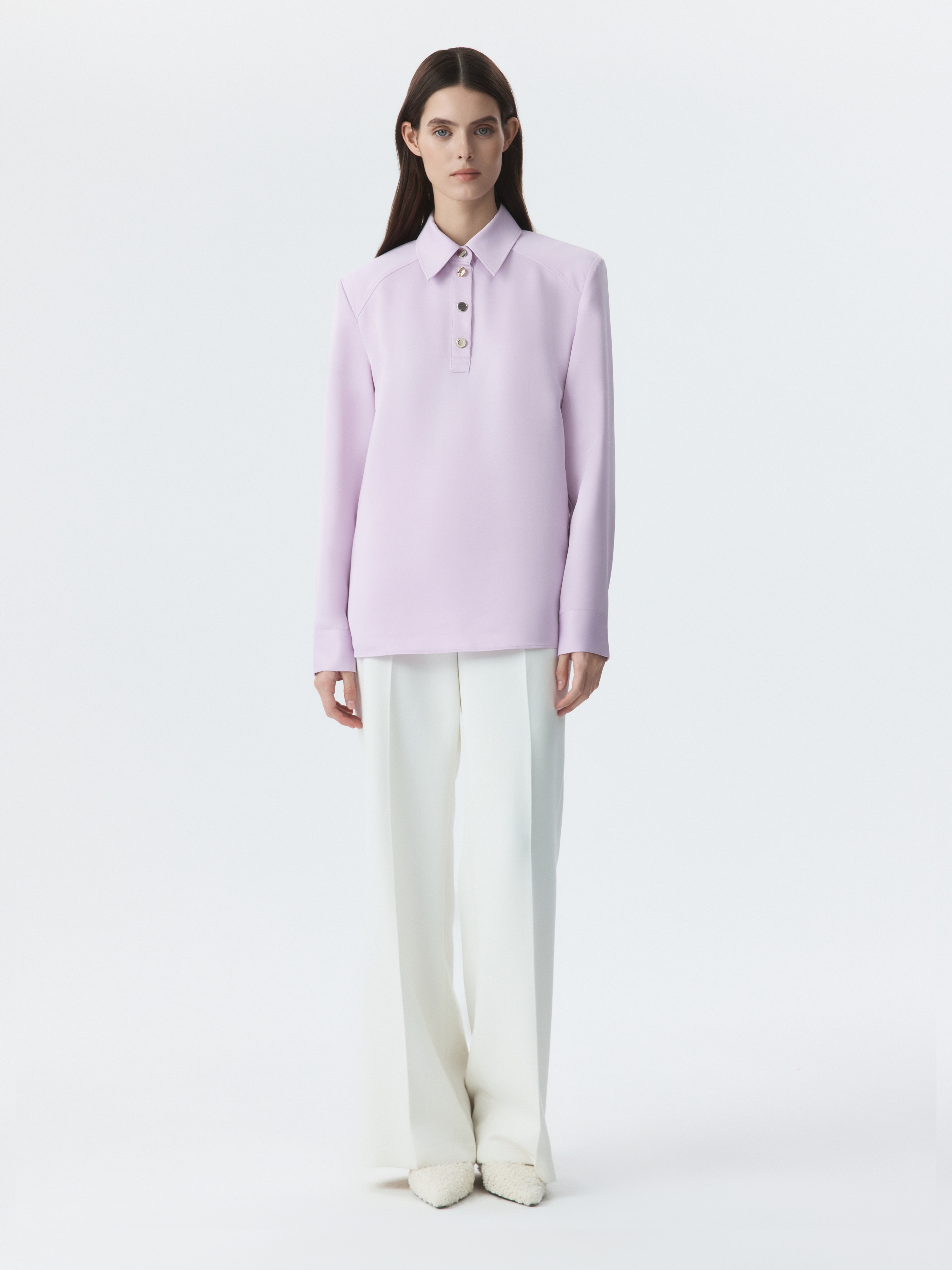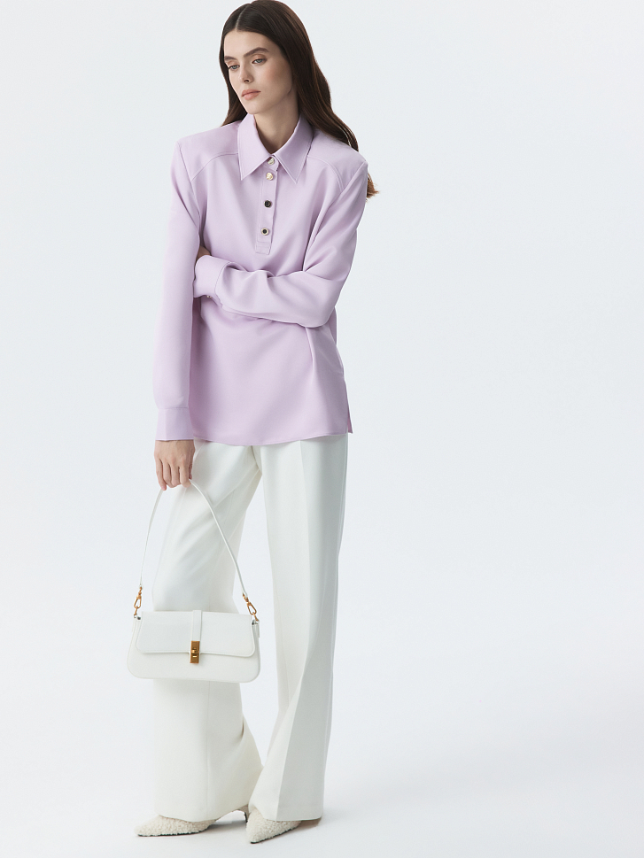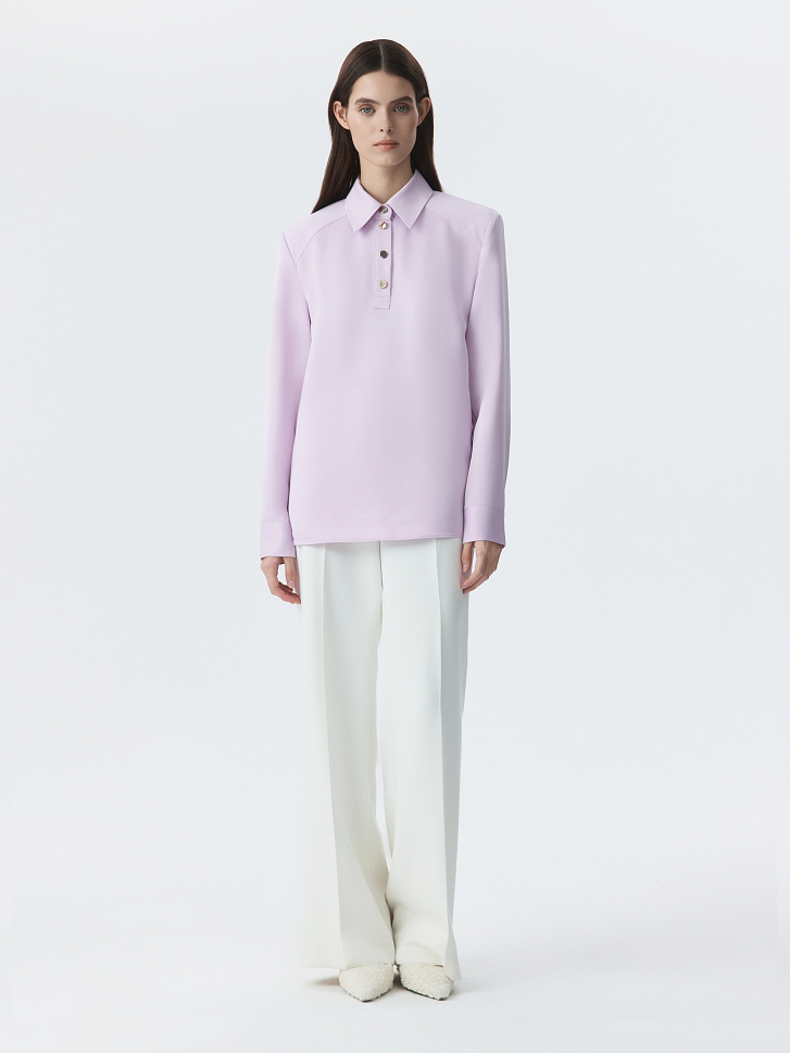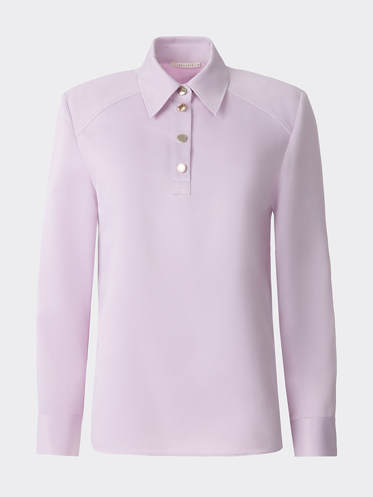 Атласная блуза с воротником-поло сочетает в себе классический минимализм и эстетику спорт-шик. Гладкий шелковистый текстиль с приятной на ощупь фактурой струится вдоль тела и не просвечивает. Блуза имеет четкий силуэт за счет подплечников, а металлические пуговицы играют роль акцентов.