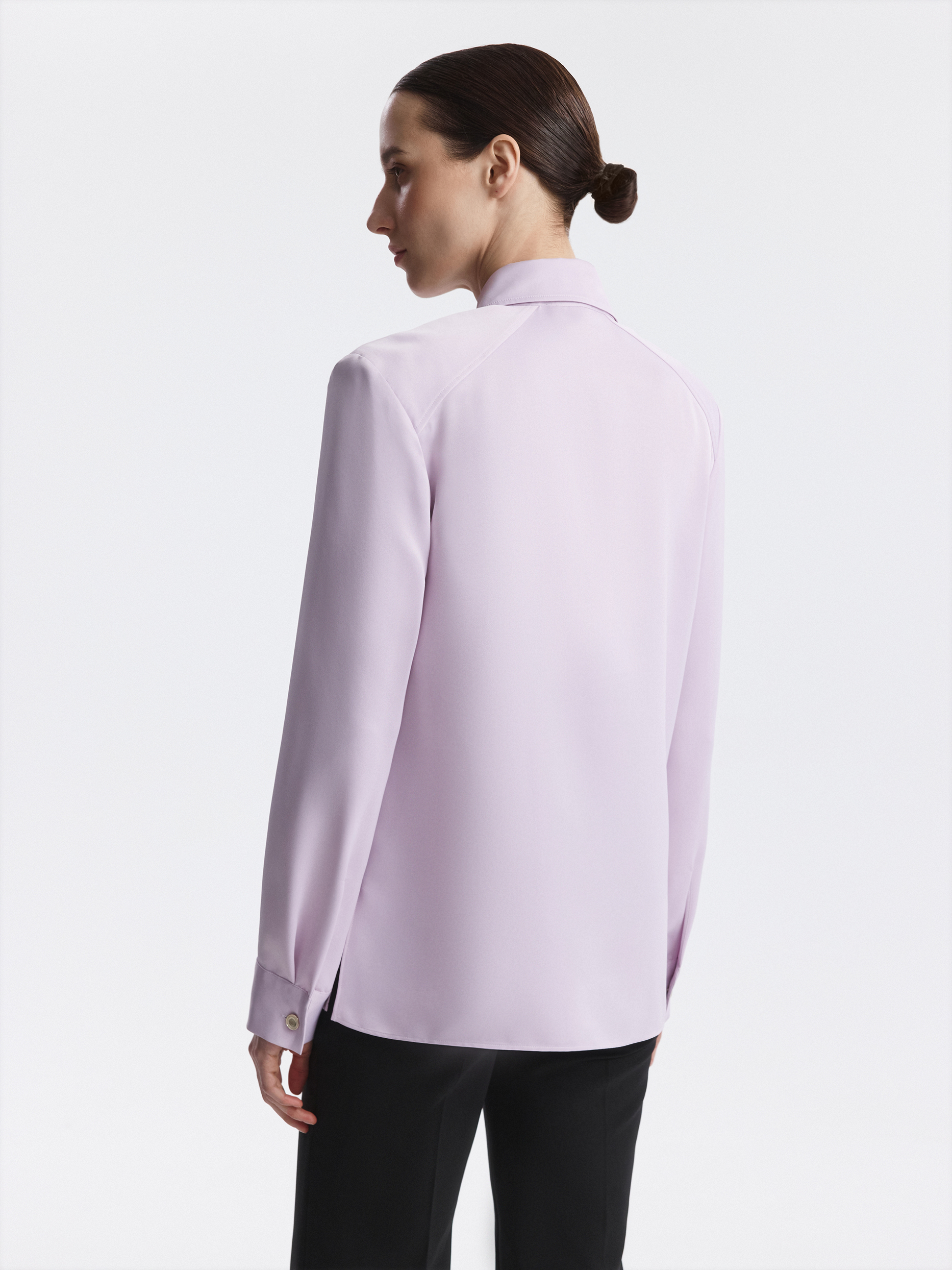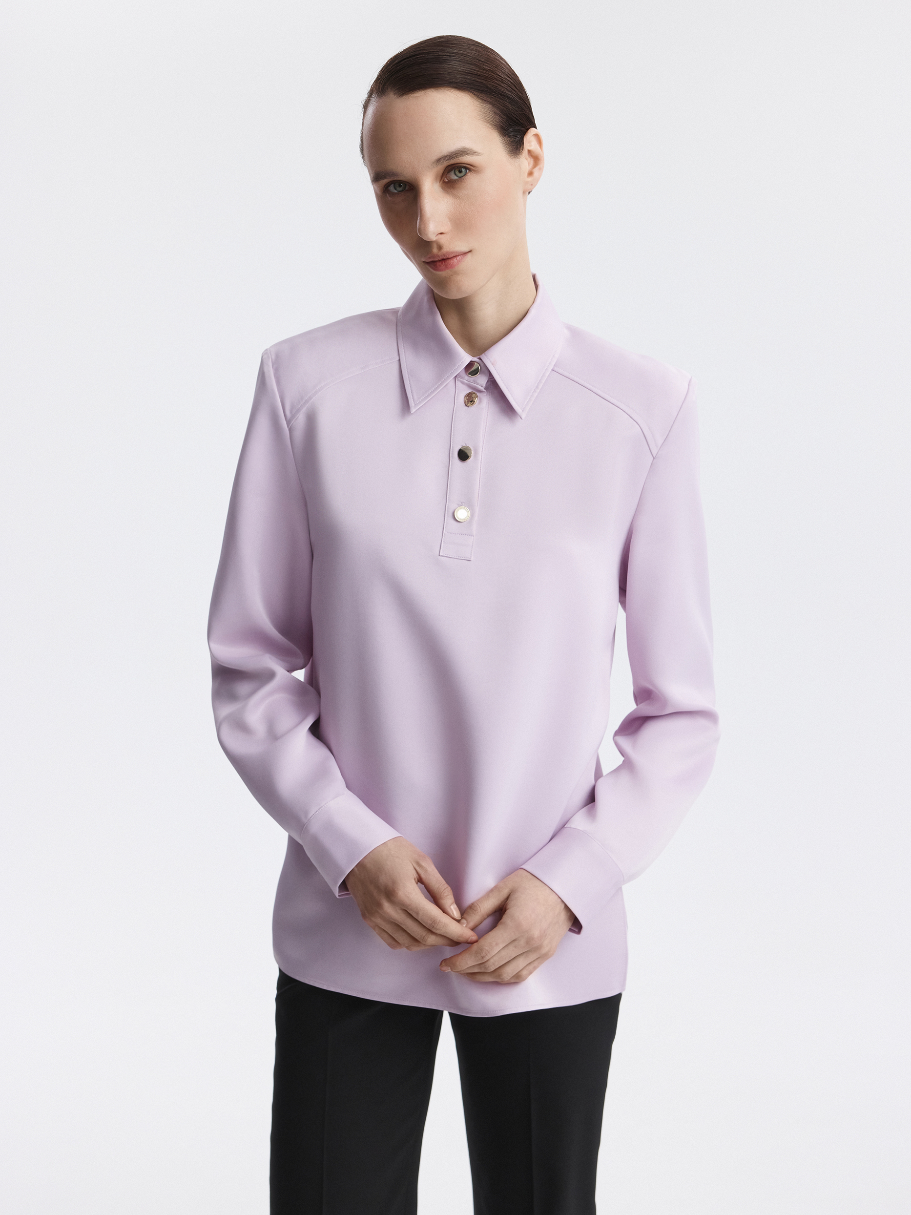 Блуза из атласной ткани подходит и на особый случай, и на каждый день. Гладкий шелковистый текстиль с приятной на ощупь фактурой струится вдоль тела и не просвечивает. Прямая блуза имеет четкий силуэт за счет подплечников и отложного воротника.