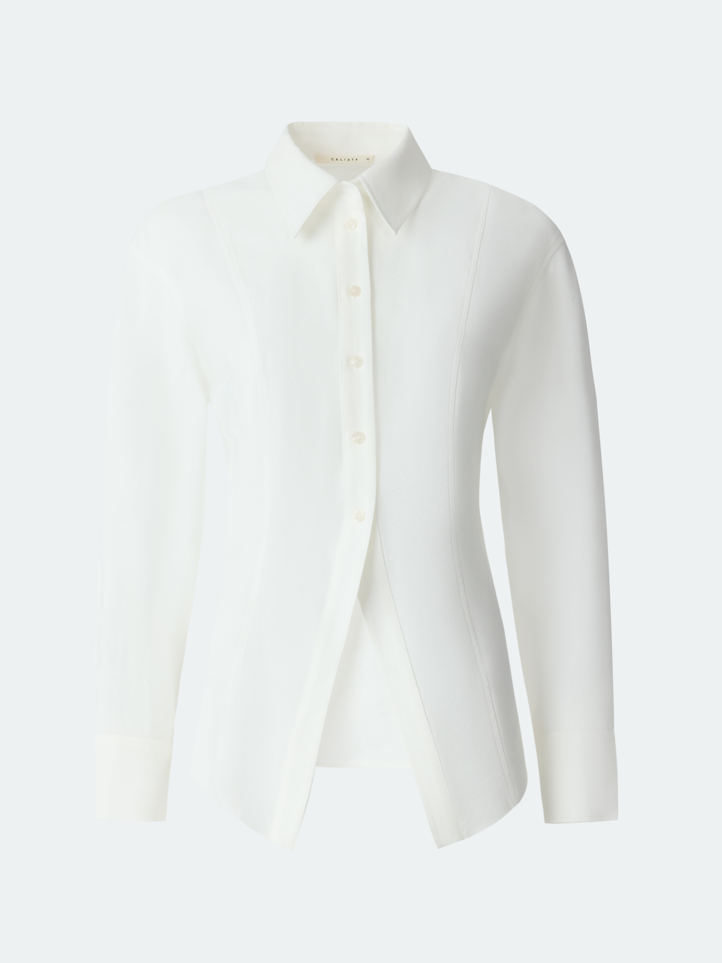 Приталенная блуза имеет графичный силуэт, а рельефные швы подчеркивают точность кроя. В меру плотный текстиль на основе вискозы с габардиновой фактурой дарит комфорт и не просвечивает. Разрез спереди создает ненавязчивый акцент.