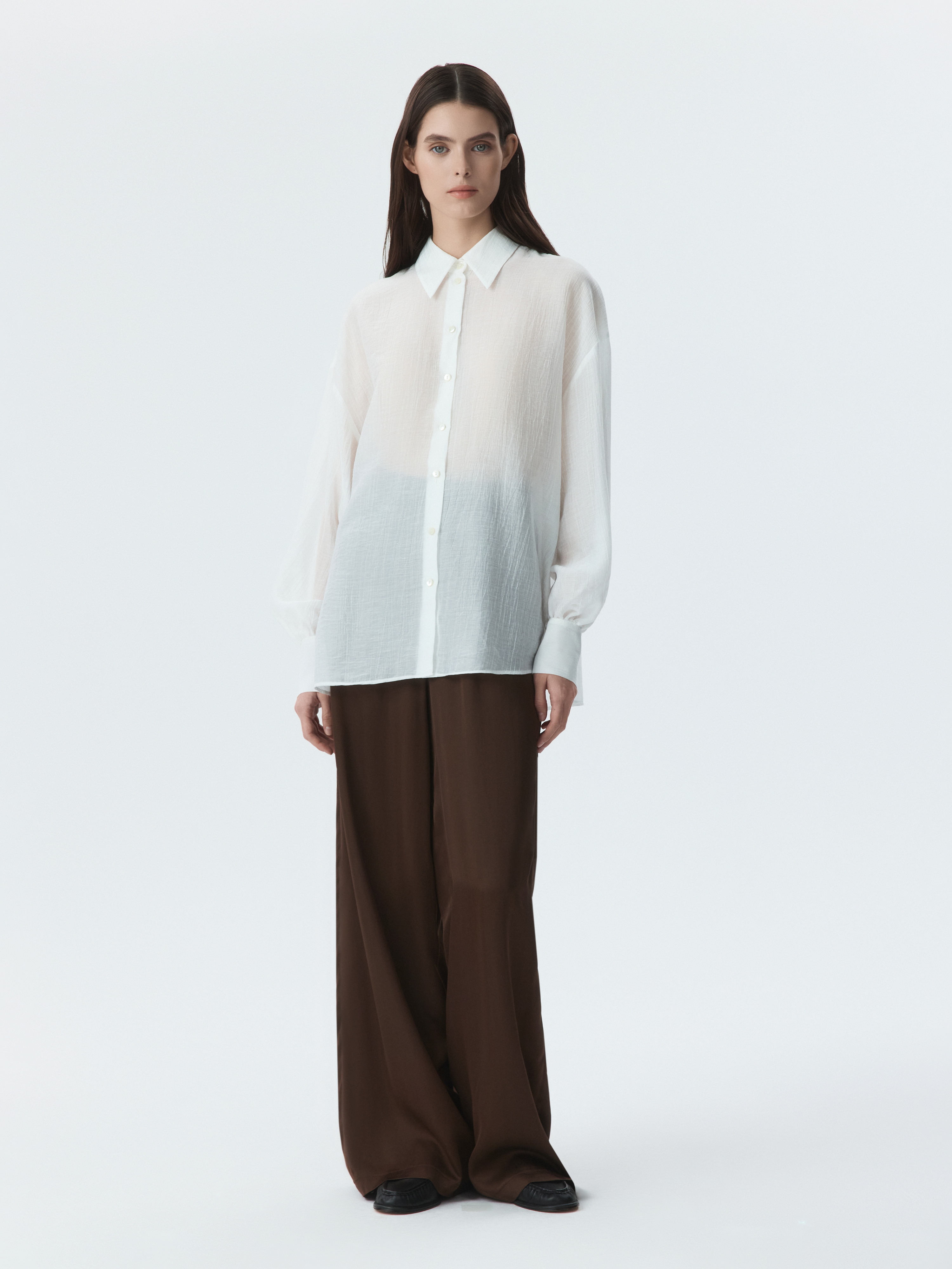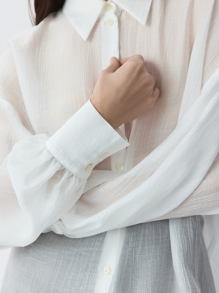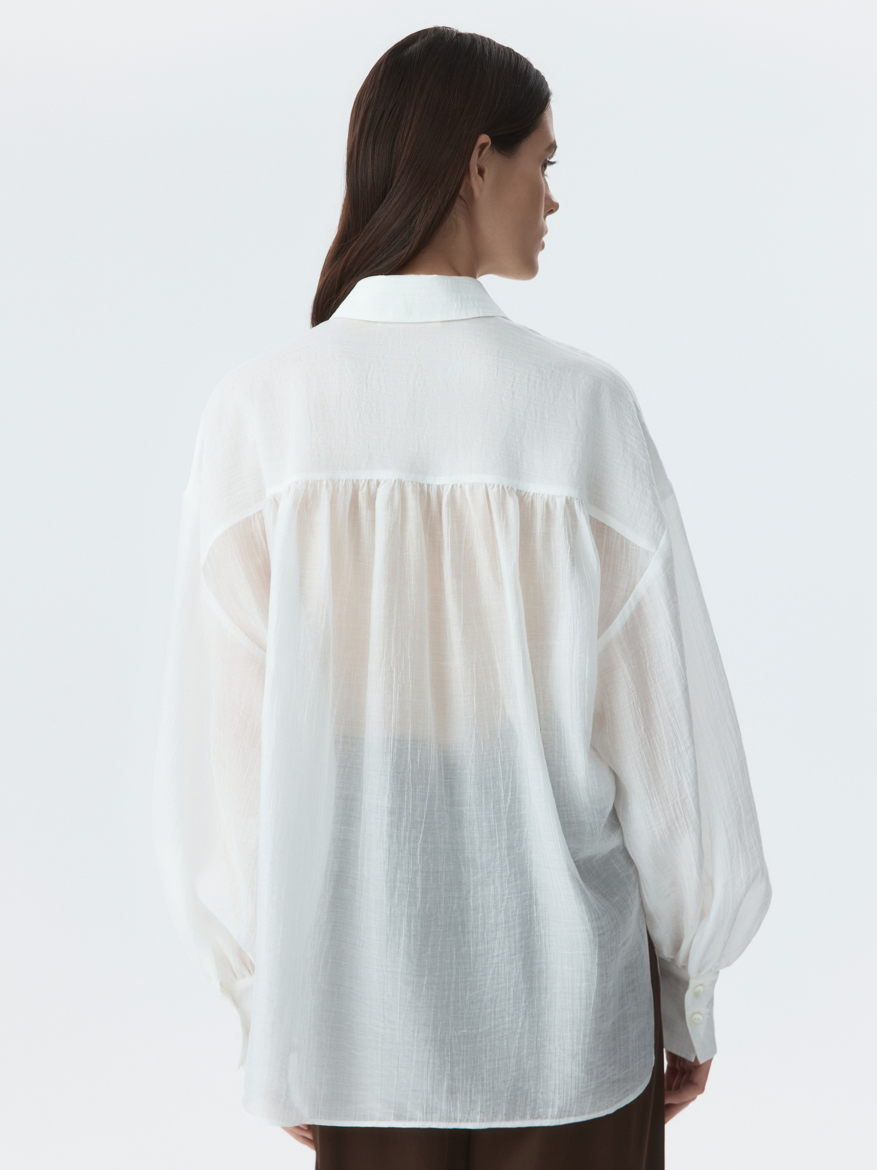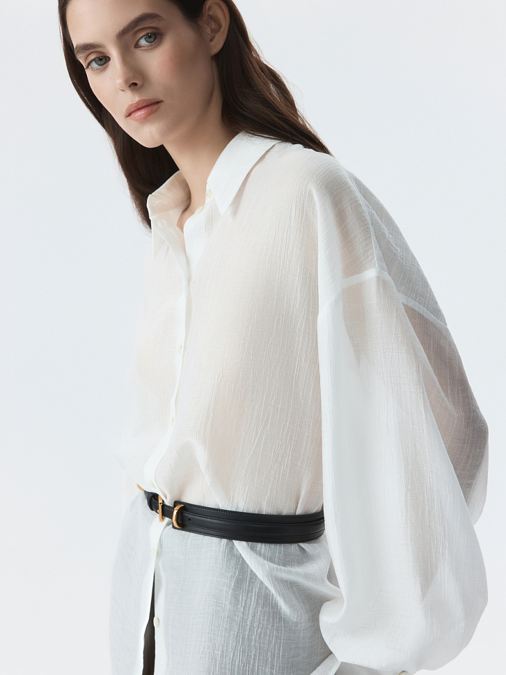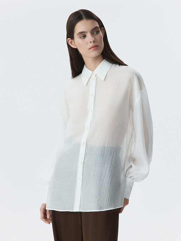 Базовая блуза в повседневном гардеробе всегда пригодится, но она не будет слишком классической за счет материала. Модель свободного кроя сшили из тонкого «жатого» тенселя (волокна целлюлозы), который очень легкий и дышащий.