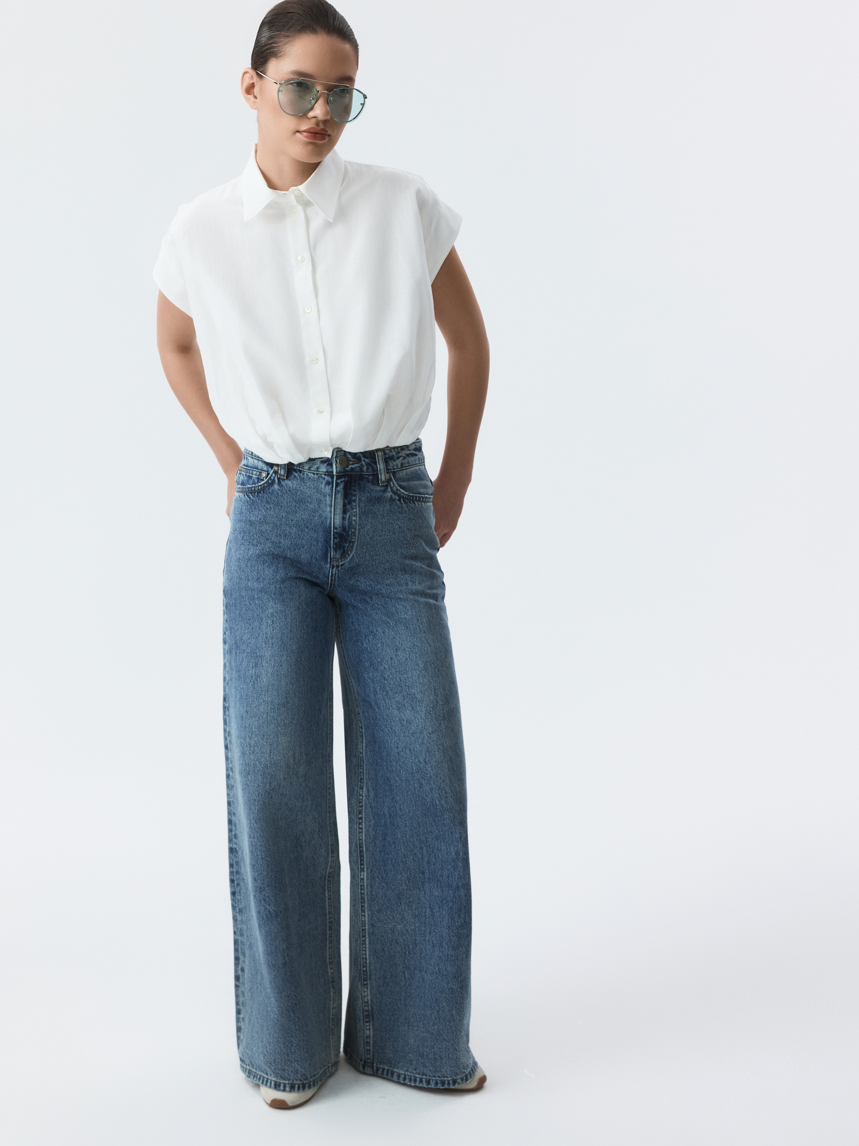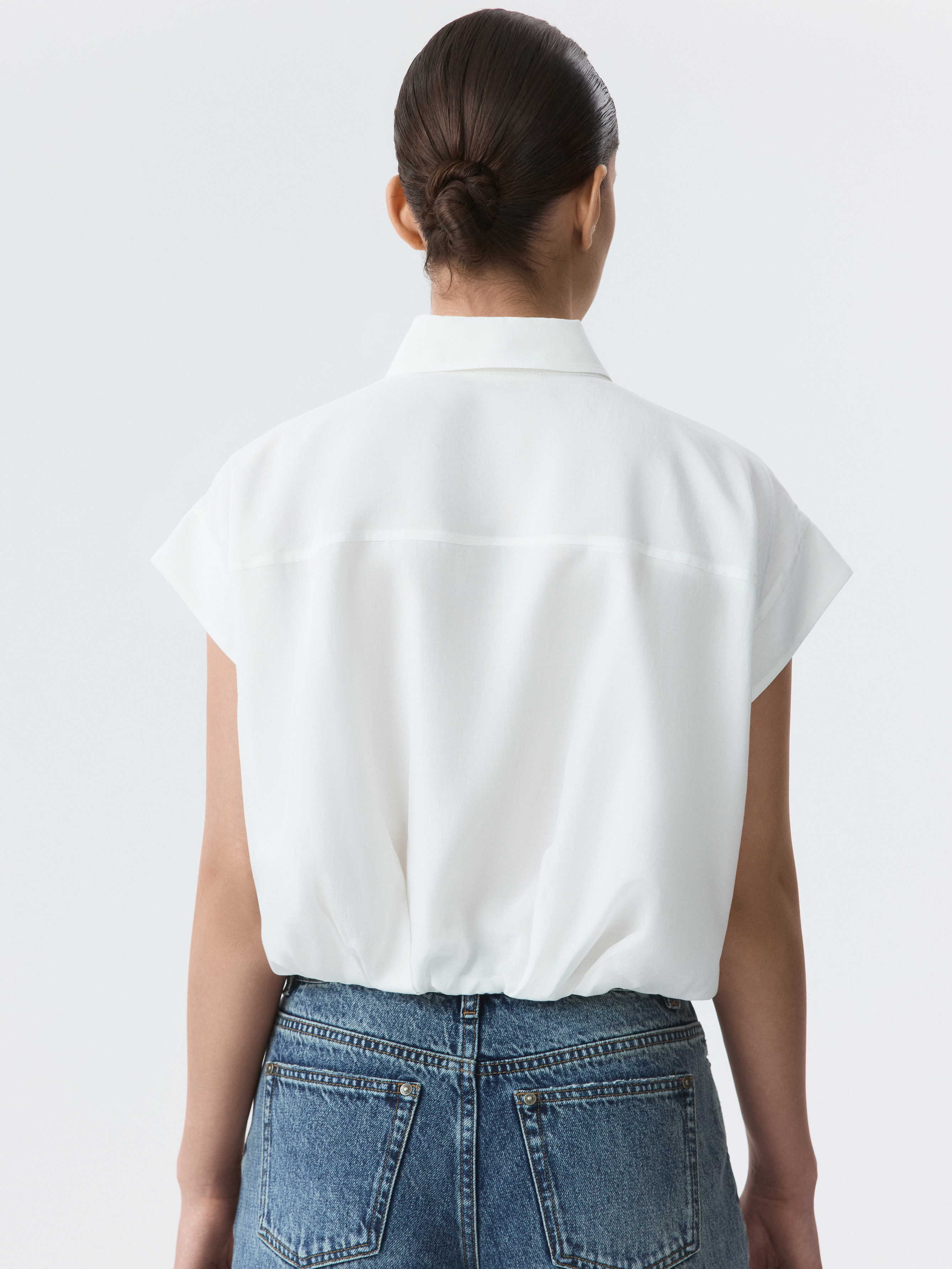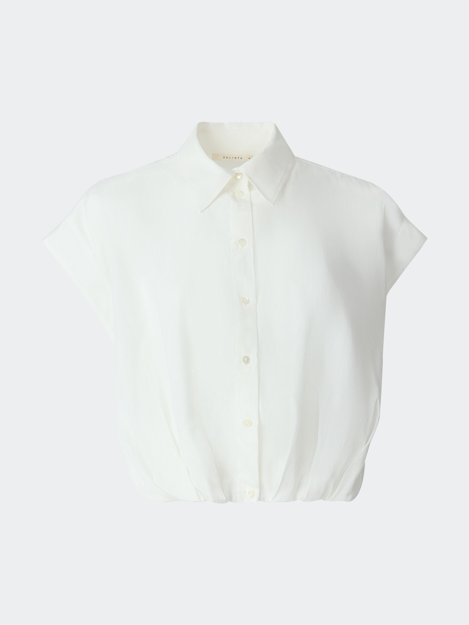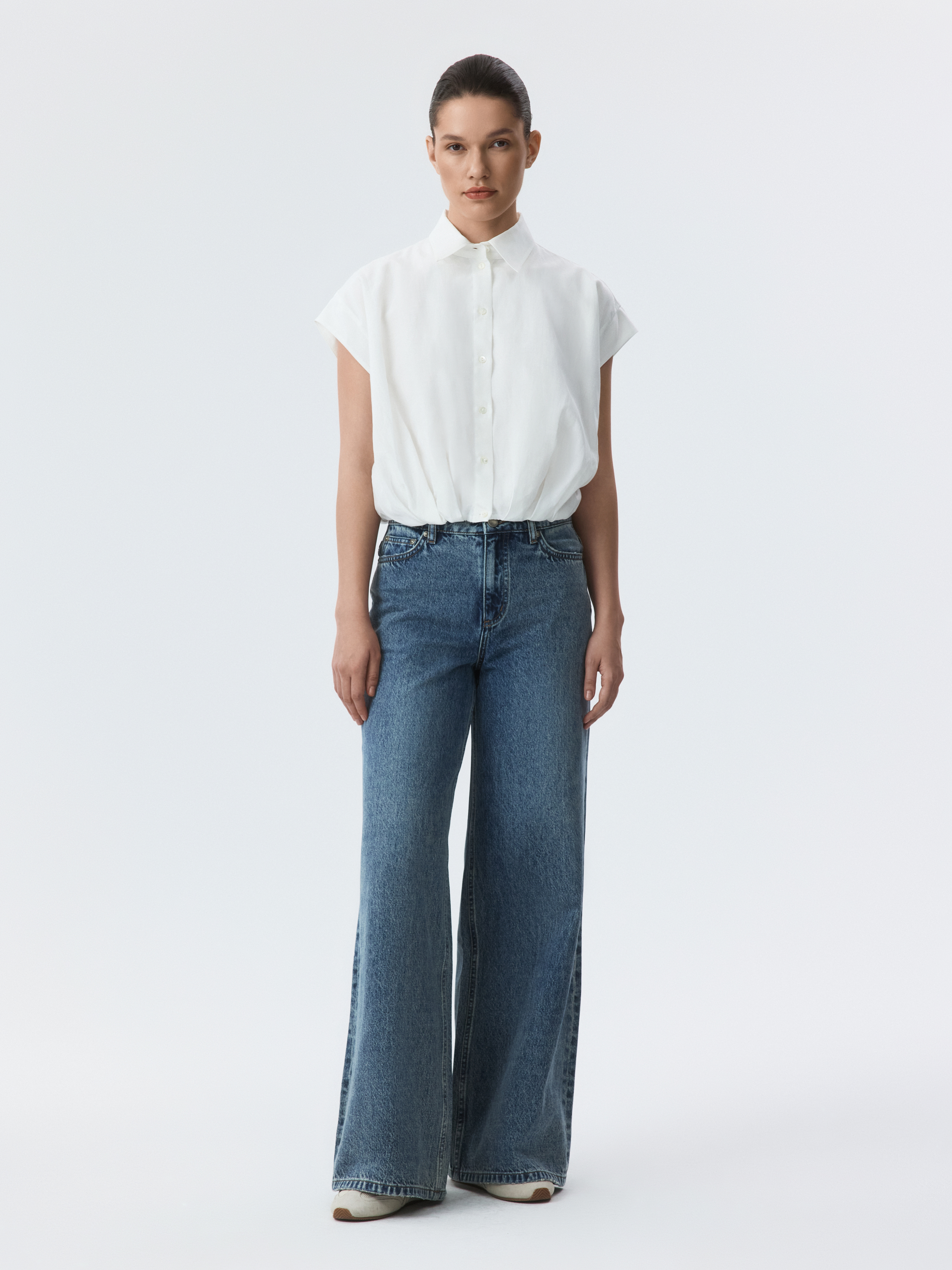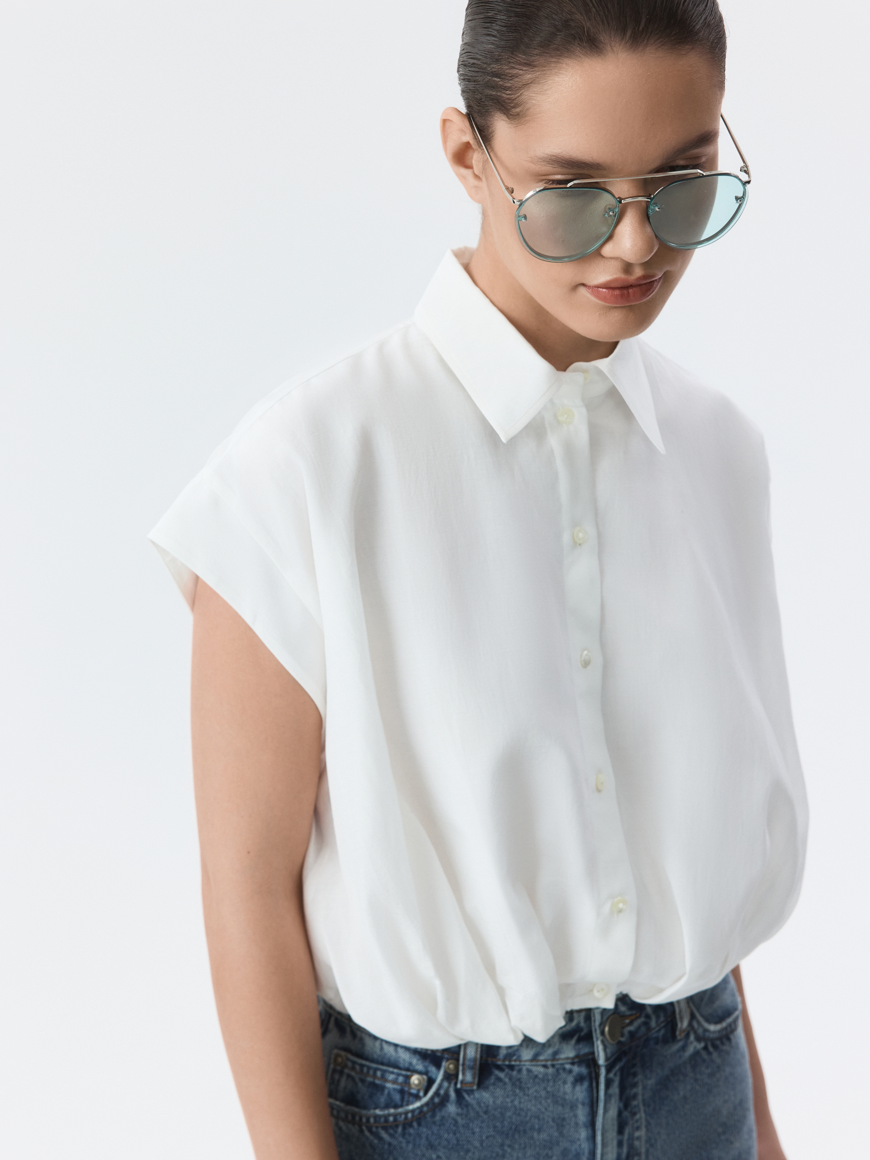 Укороченная блуза с защипами самый повседневный образ сделает более выразительным. Тонкий смесовый текстиль из хлопка и района имеет шелковистую фактуру, приятно прилегая к телу. Умеренный оверсайз силуэт дарит комфорт и свободу движений.