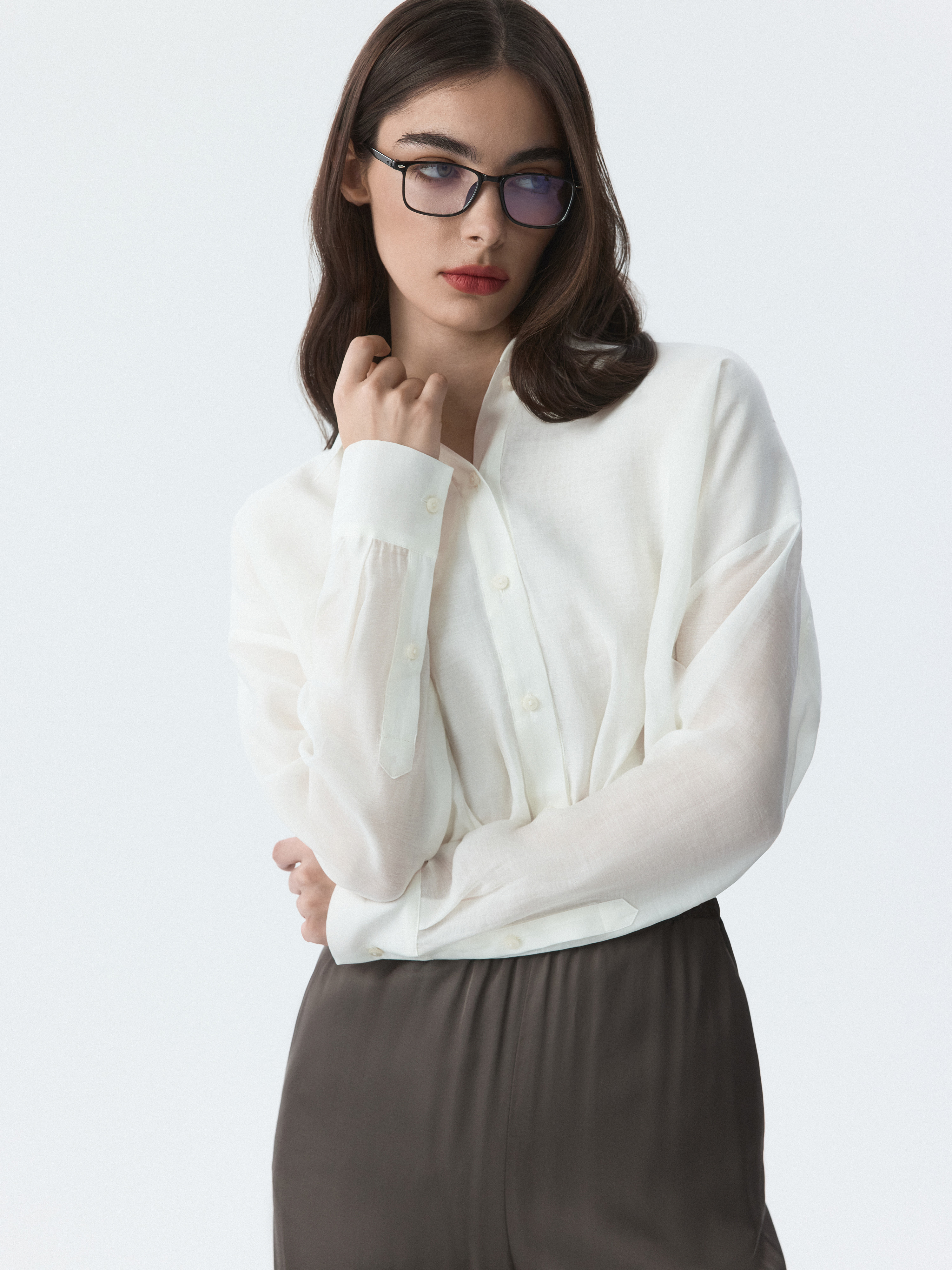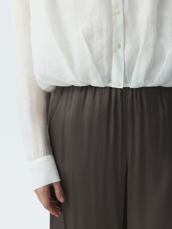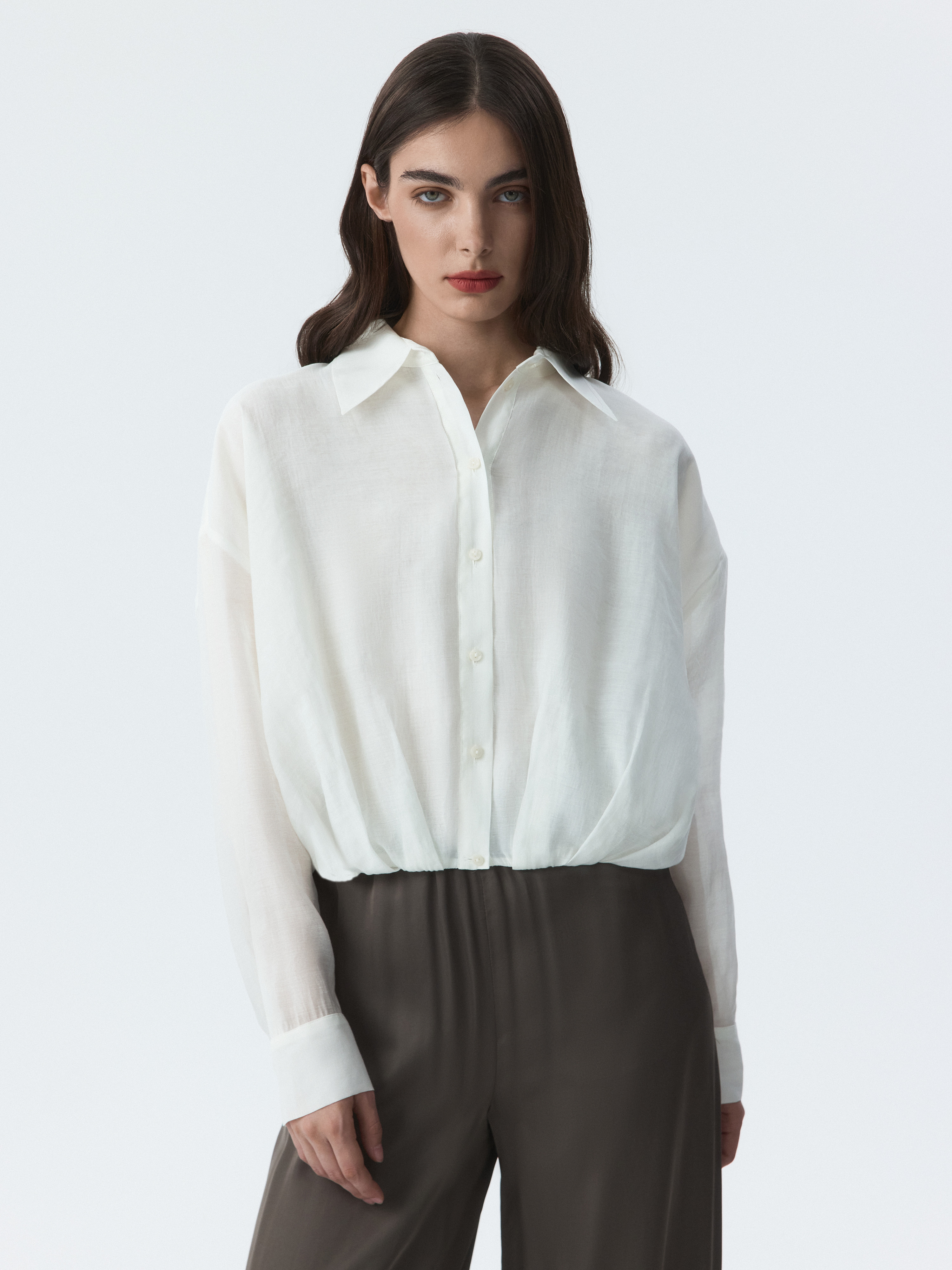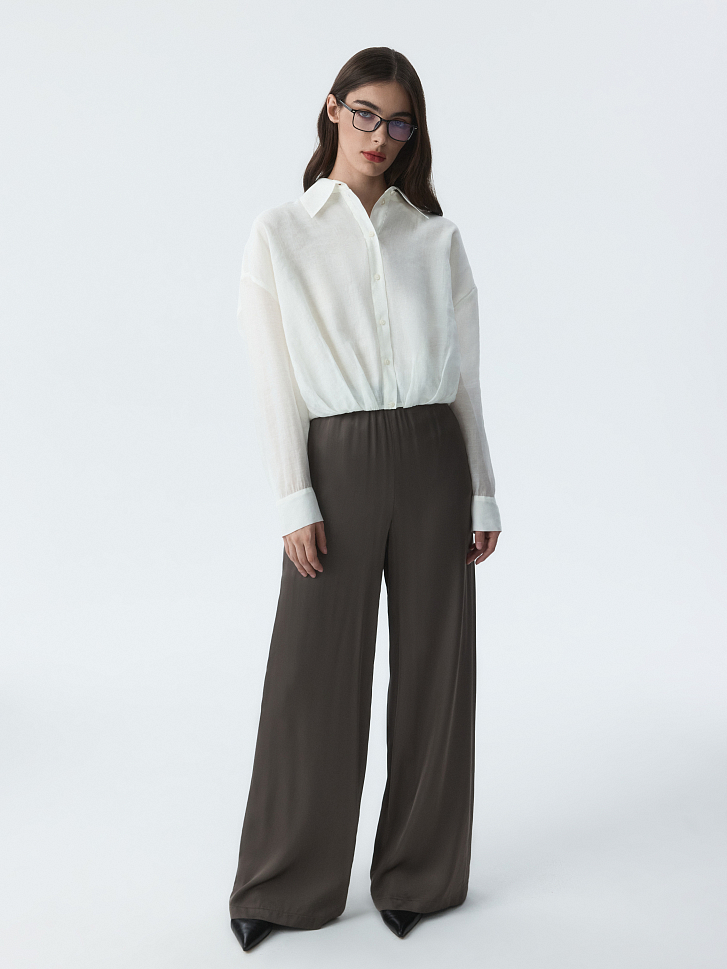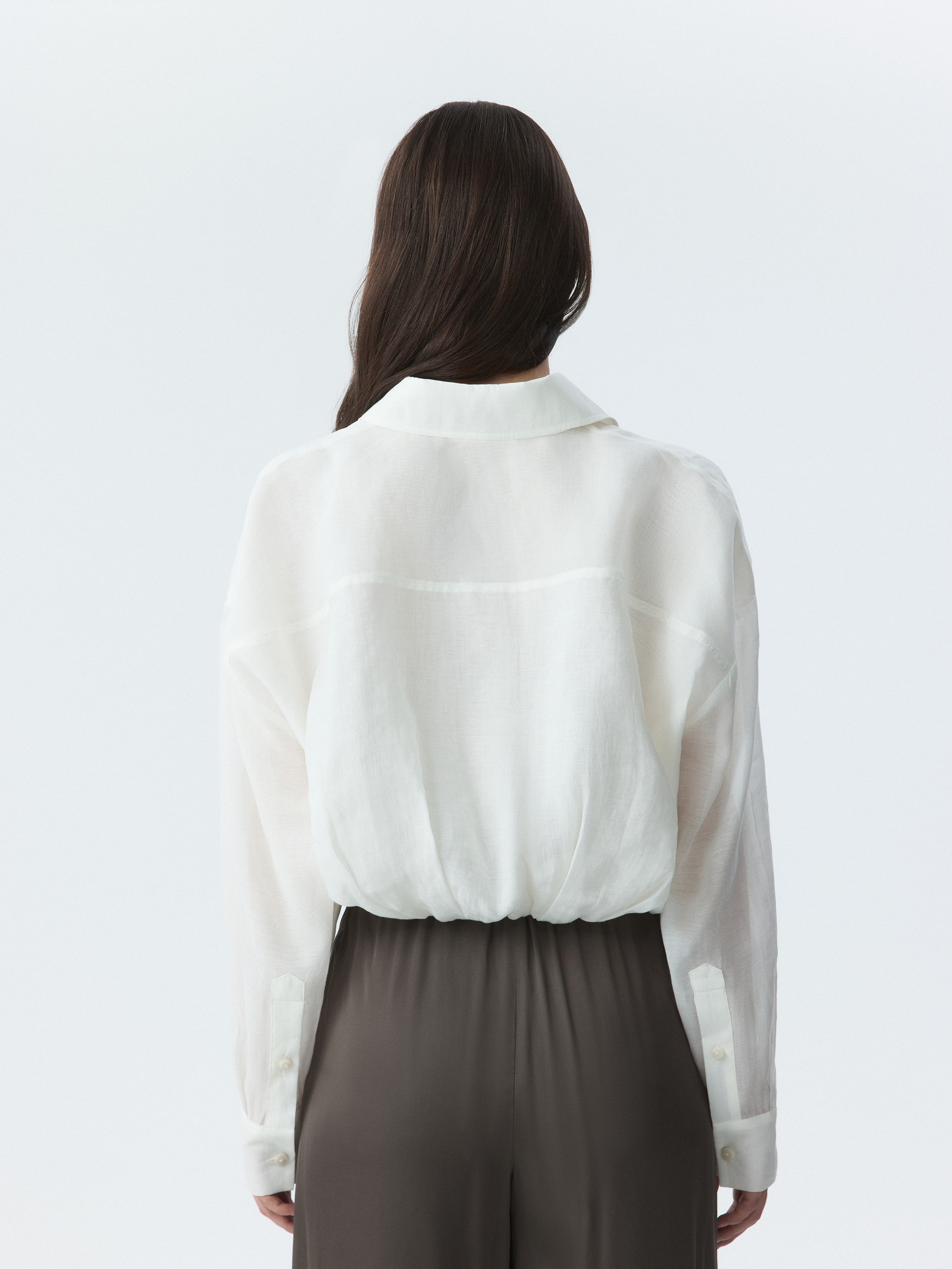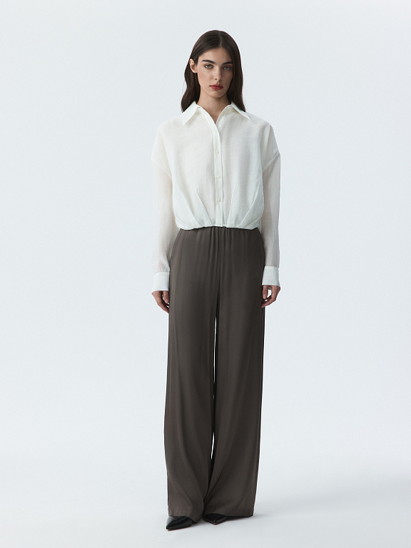 Укороченная блуза с защипами – переосмысление классического образа в современном контексте. Тонкий полупрозрачный текстиль на основе лиоцелла (волокна целлюлозы) хорошо пропускает воздух и дарит комфорт. Модель свободно сидит по фигуре и не сковывает движения.